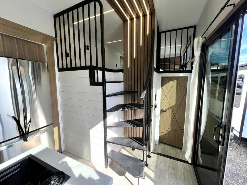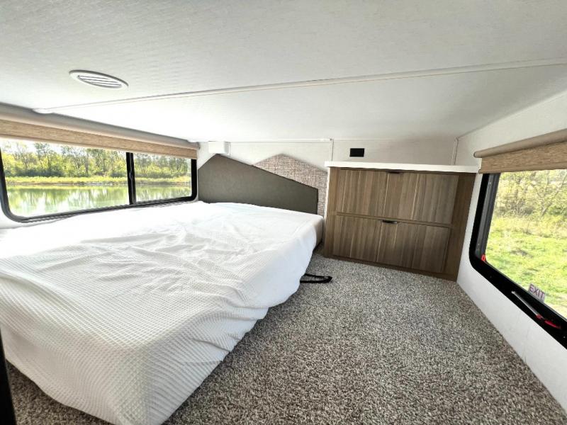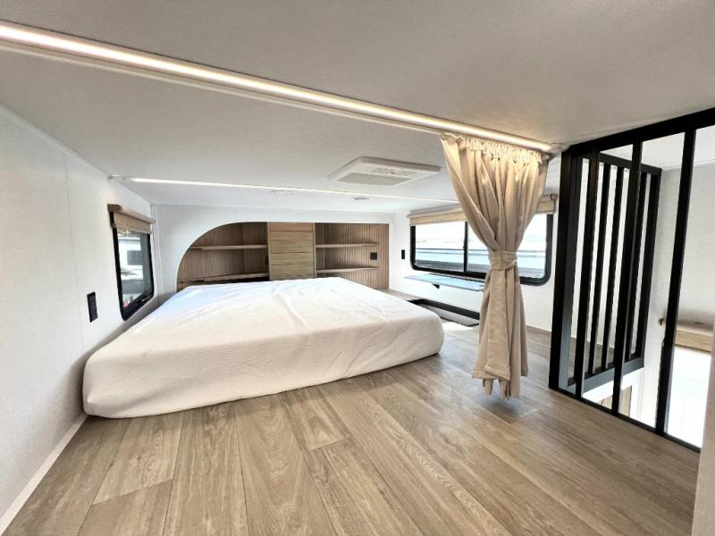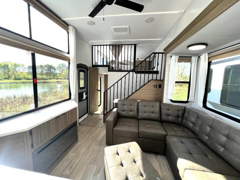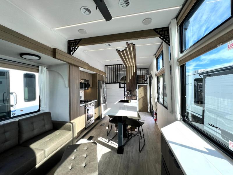This thoughtfully designed 42ZEN model provides a blend of comfort and functionality. It features two lofts for added sleeping and living space, one includes a 62" x 74" Versa queen mattress and a dresser for storing clothes and essentials, while the second loft offers another Versa queen bed, plus a table with recessed footing, perfect for getting work or study done on the road. There is also a cabinet and shelf to keep everything organized. On the main floor, you'll find a large rear full bathroom, complete with a walk-in shower, linen closet, and washer/dryer prep, providing all the comforts of home. The main living area centers around a large sectional sofa with room for the whole crew, facing a fireplace and Televator TV, making it the perfect space to relax after a long day. The kitchen island also adds valuable prep space and also serves as a gathering spot with room for stools. Up front, the master bedroom features a king-size bed with Versa Tilt, a dresser, and its own private bathroom, offering convenience and privacy whenever you need it.
