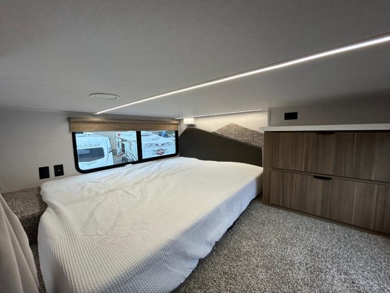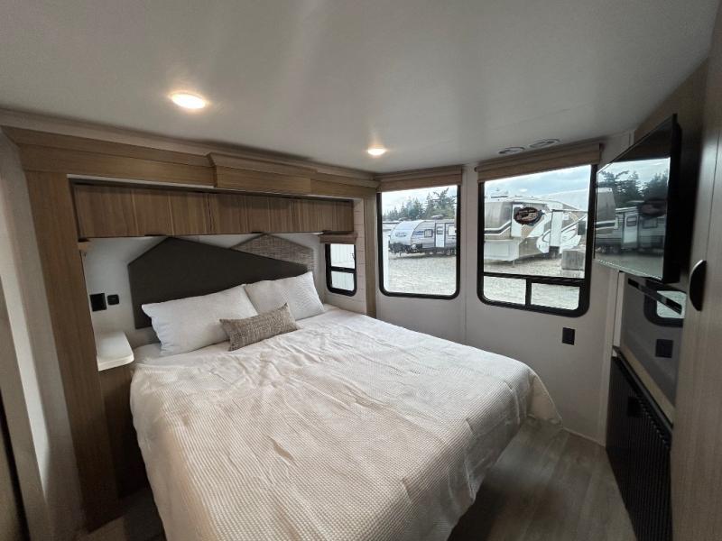 The front private bedroom includes a king-size bed with Versa-Tilt for added comfort and large windows that flood the space with natural light. The open living area offers a cozy L-shaped sectional across from an entertainment center with a fireplace—perfect for relaxing evenings.