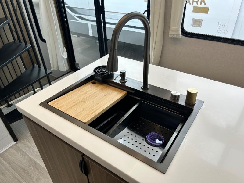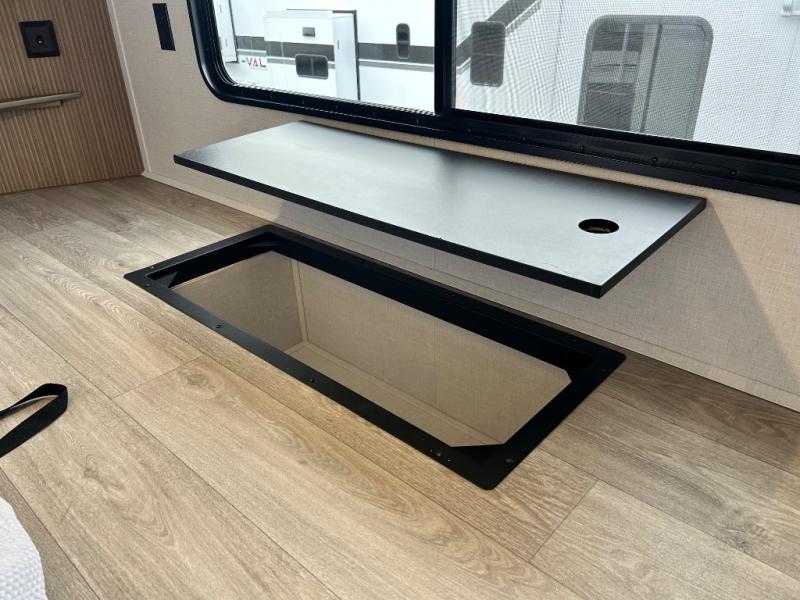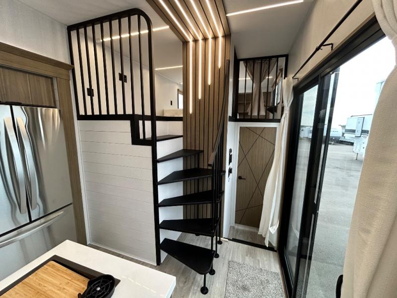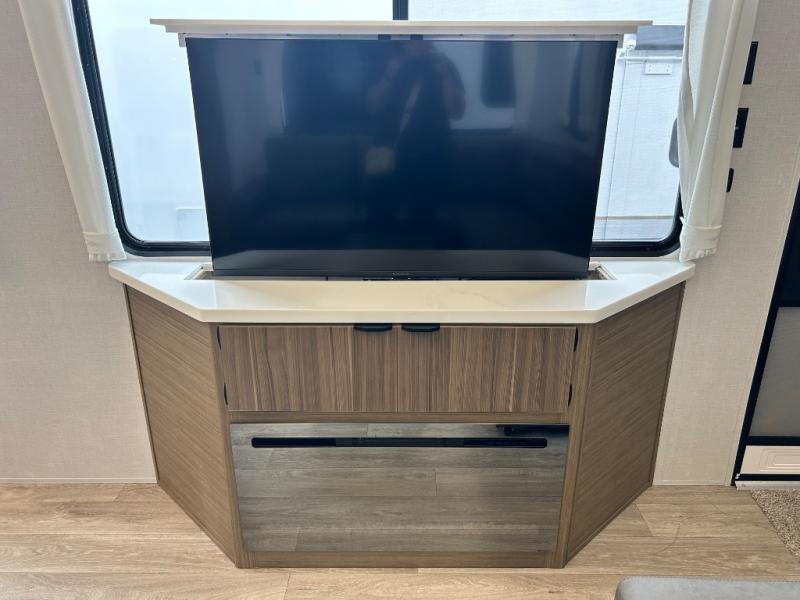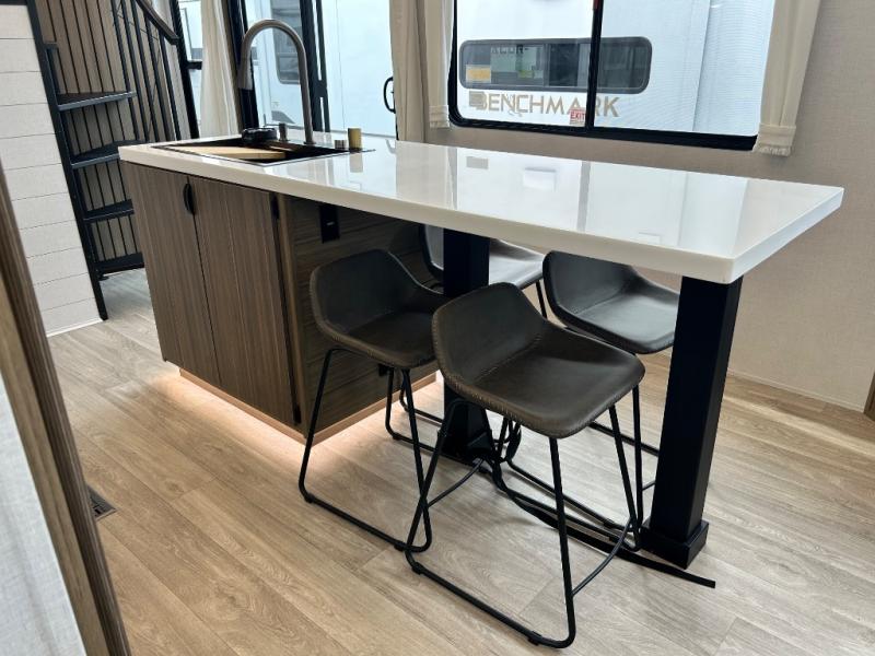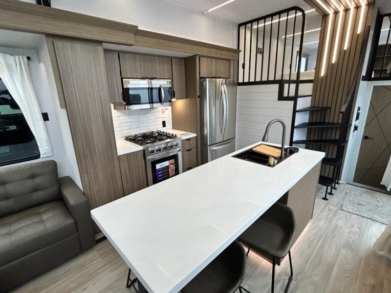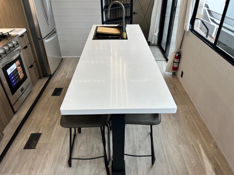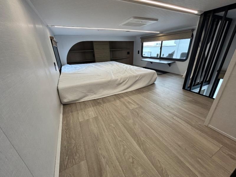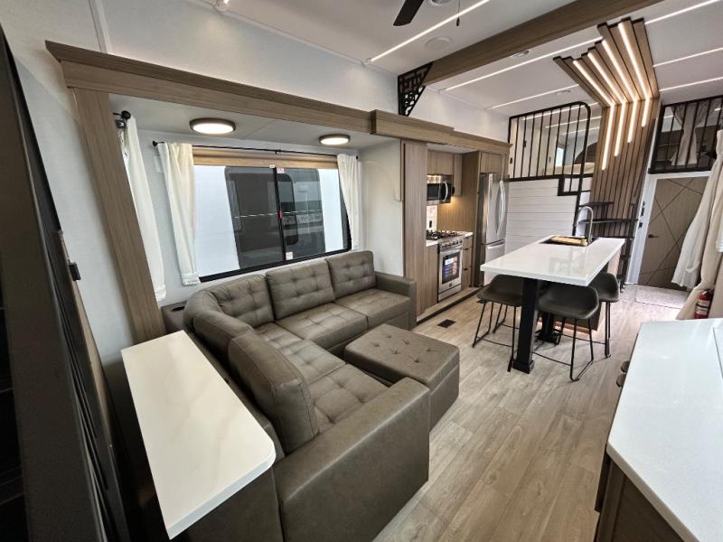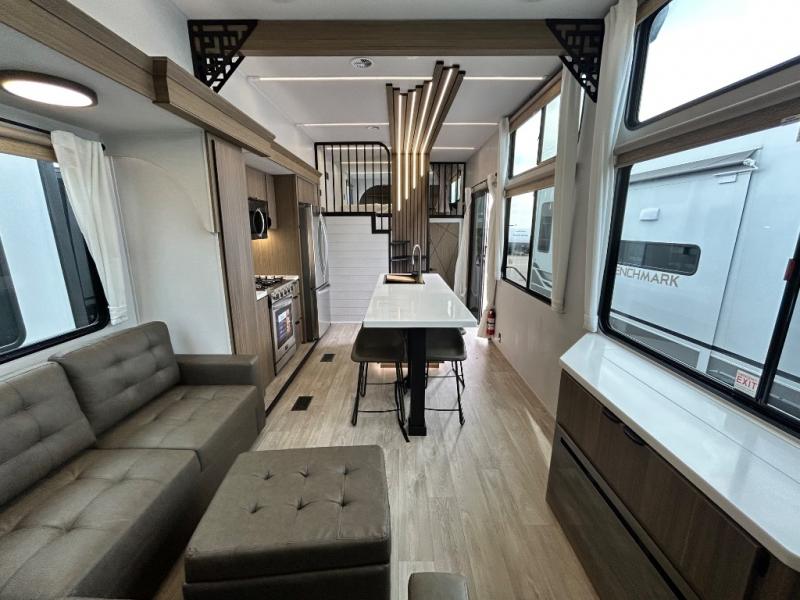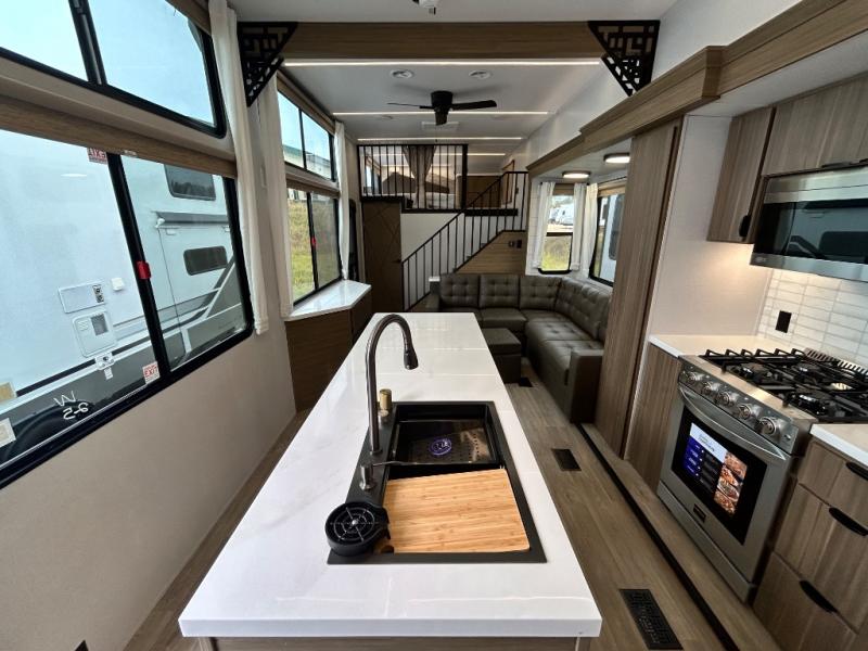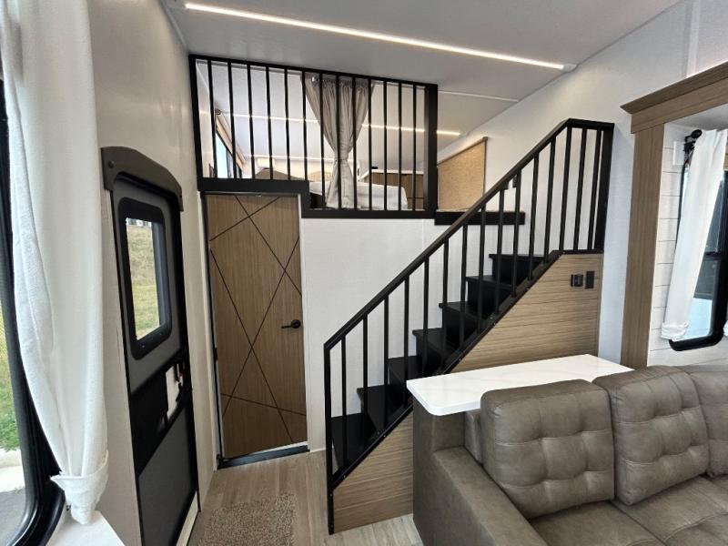 This thoughtfully designed 42ZEN model provides a blend of comfort and functionality. It features two lofts for added sleeping and living space, one includes a 62" x 74" Versa queen mattress and a dresser for storing clothes and essentials, while the second loft offers another Versa queen bed, plus a table with recessed footing, perfect for getting work or study done on the road. There is also a cabinet and shelf to keep everything organized. On the main floor, you'll find a large rear full bathroom, complete with a walk-in shower, linen closet, and washer/dryer prep, providing all the comforts of home. The main living area centers around a large sectional sofa with room for the whole crew, facing a fireplace and Televator TV, making it the perfect space to relax after a long day. The kitchen island also adds valuable prep space and also serves as a gathering spot with room for stools. Up front, the master bedroom features a king-size bed with Versa Tilt, a dresser, and its own private bathroom, offering convenience and privacy whenever you need it.
