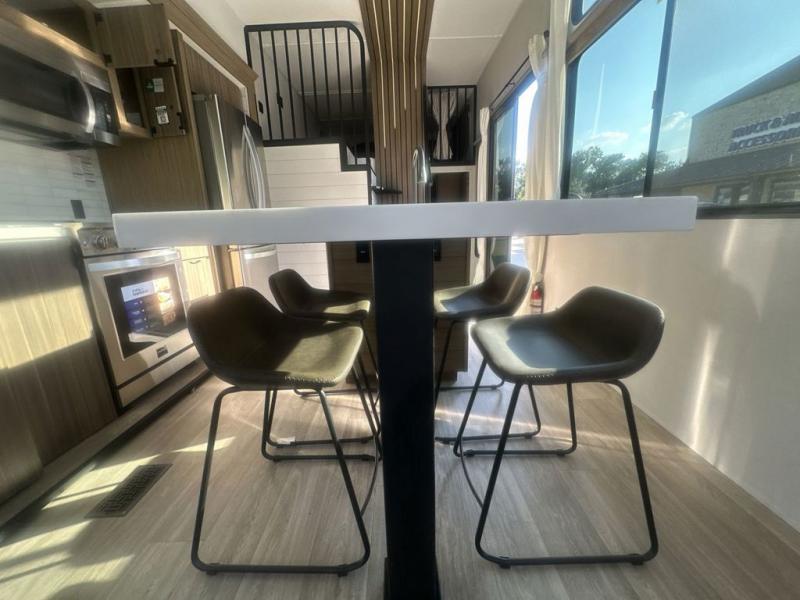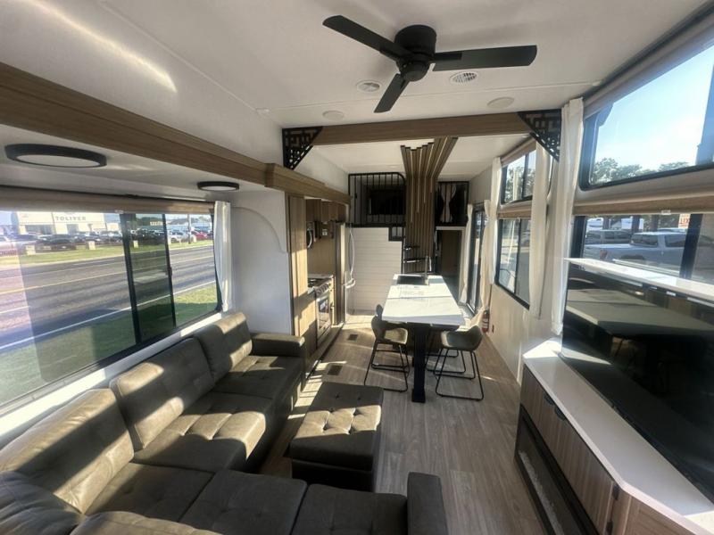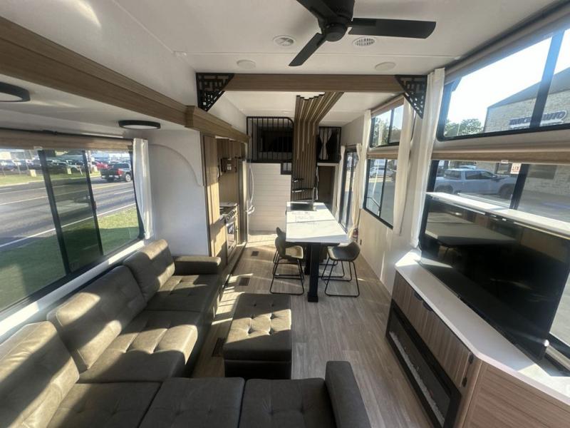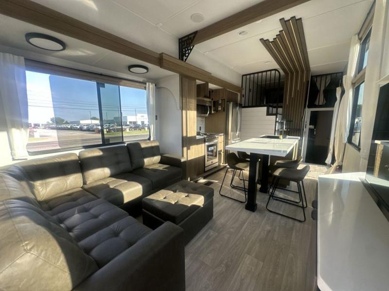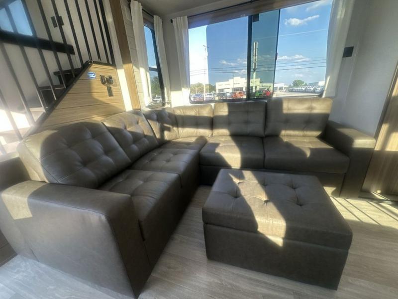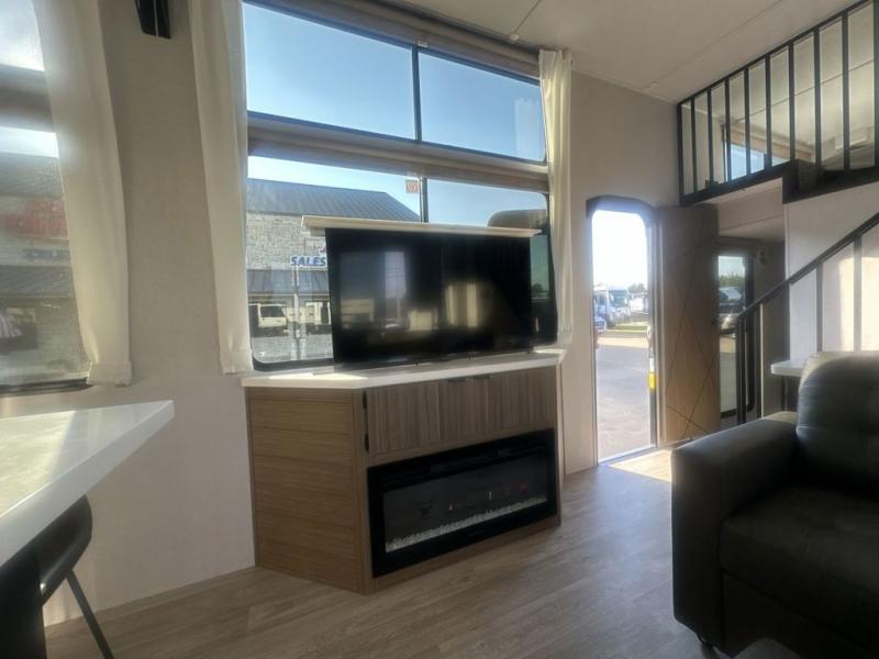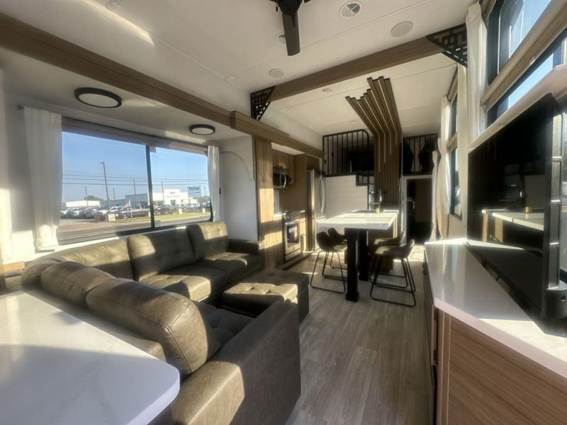 This thoughtfully designed 42ZEN model provides a blend of comfort and functionality. It features two lofts for added sleeping and living space, one includes a 62" x 74" Versa queen mattress and a dresser for storing clothes and essentials, while the second loft offers another Versa queen bed, plus a table with recessed footing, perfect for getting work or study done on the road. There is also a cabinet and shelf to keep everything organized. On the main floor, you'll find a large rear full bathroom, complete with a walk-in shower, linen closet, and washer/dryer prep, providing all the comforts of home. The main living area centers around a large sectional sofa with room for the whole crew, facing a fireplace and Televator TV, making it the perfect space to relax after a long day. The kitchen island also adds valuable prep space and also serves as a gathering spot with room for stools. Up front, the master bedroom features a king-size bed with Versa Tilt, a dresser, and its own private bathroom, offering convenience and privacy whenever you need it.