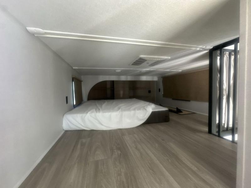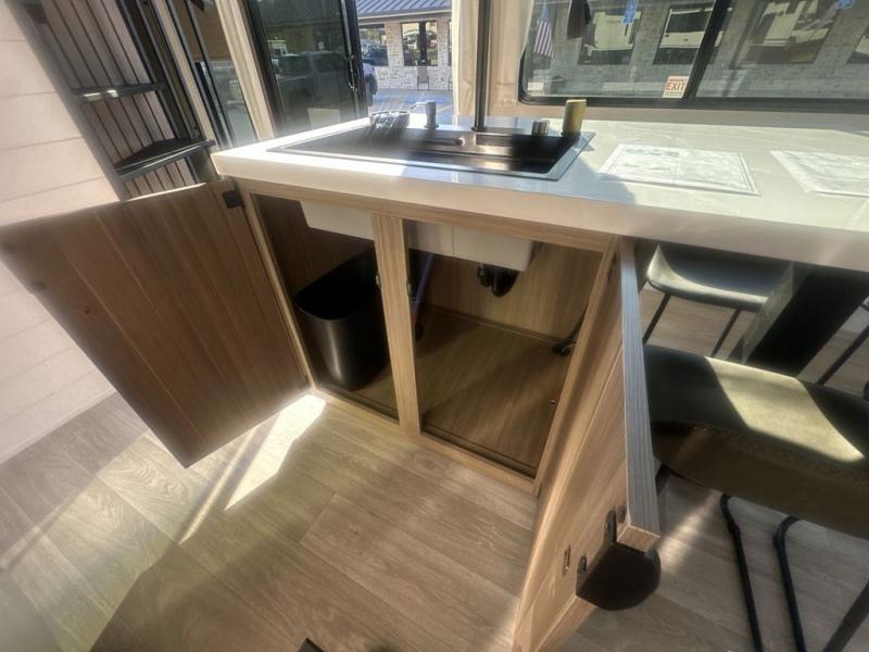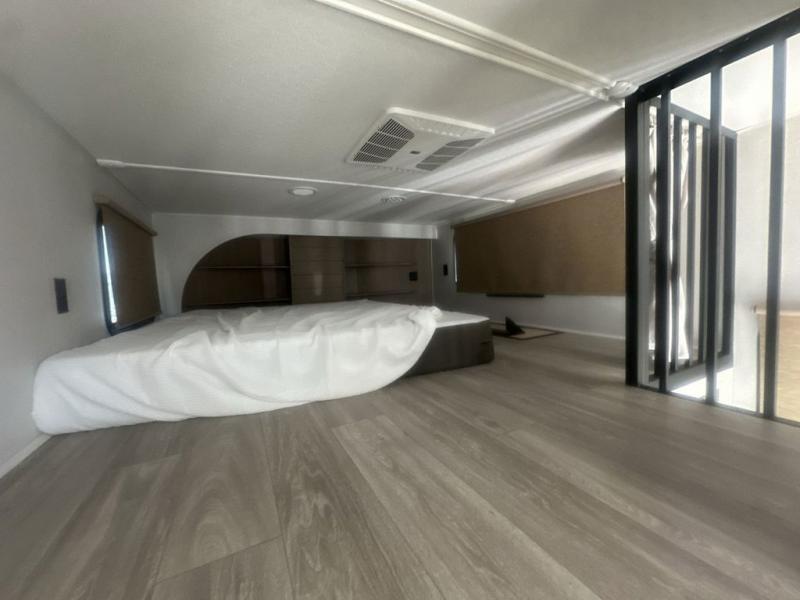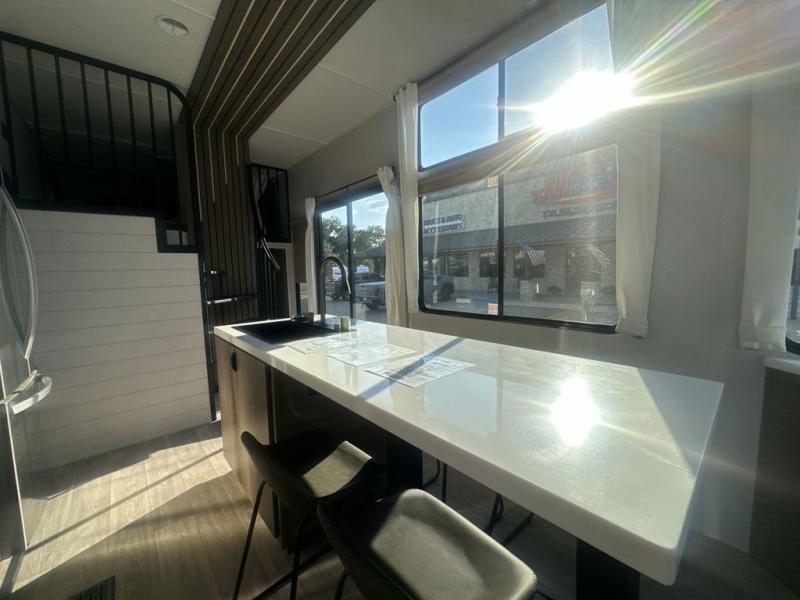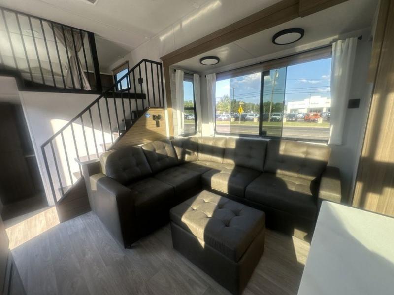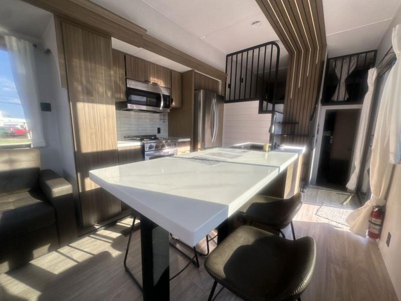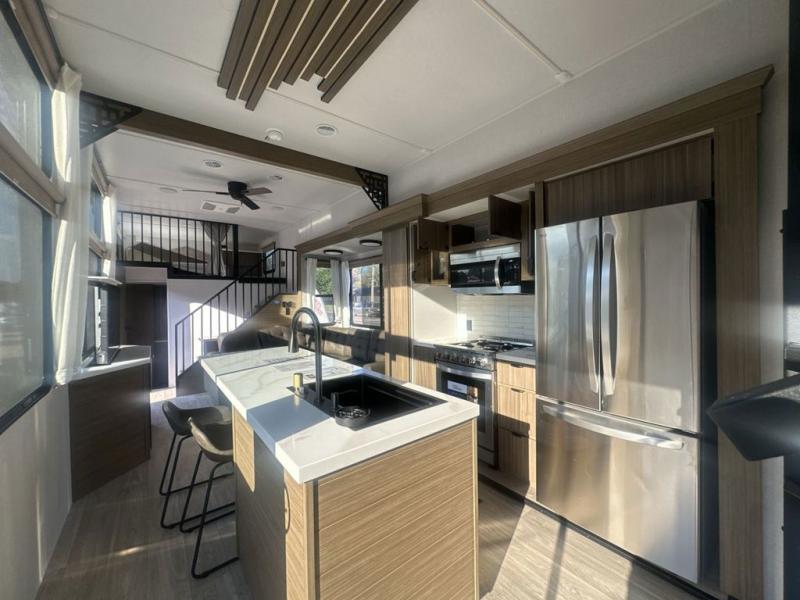 This thoughtfully designed 42ZEN model provides a blend of comfort and functionality. It features two lofts for added sleeping and living space, one includes a 62" x 74" Versa queen mattress and a dresser for storing clothes and essentials, while the second loft offers another Versa queen bed, plus a table with recessed footing, perfect for getting work or study done on the road. There is also a cabinet and shelf to keep everything organized. On the main floor, you'll find a large rear full bathroom, complete with a walk-in shower, linen closet, and washer/dryer prep, providing all the comforts of home. The main living area centers around a large sectional sofa with room for the whole crew, facing a fireplace and Televator TV, making it the perfect space to relax after a long day. The kitchen island also adds valuable prep space and also serves as a gathering spot with room for stools. Up front, the master bedroom features a king-size bed with Versa Tilt, a dresser, and its own private bathroom, offering convenience and privacy whenever you need it.