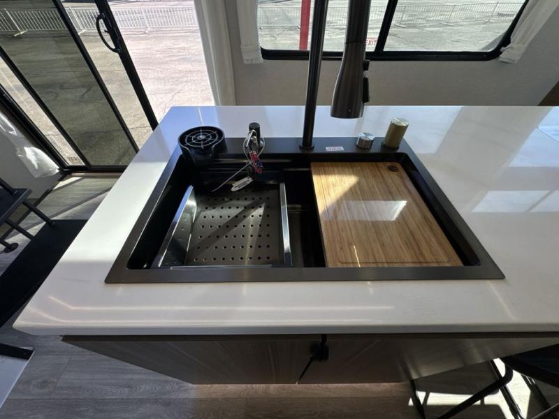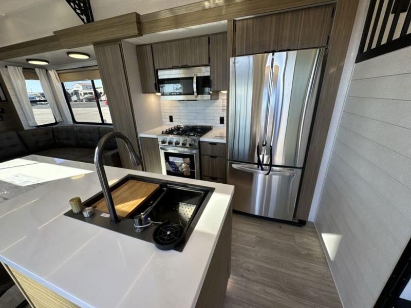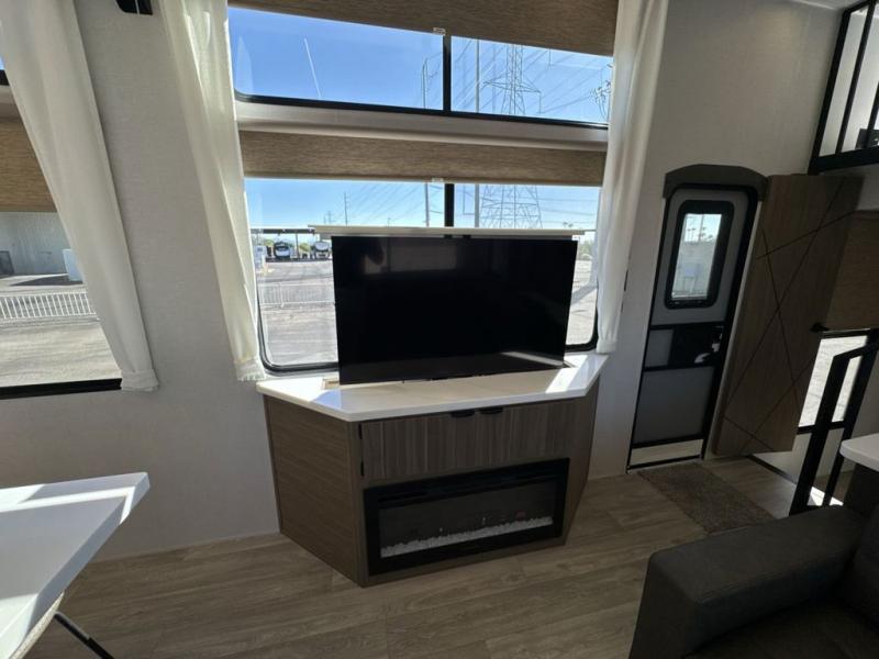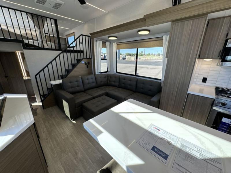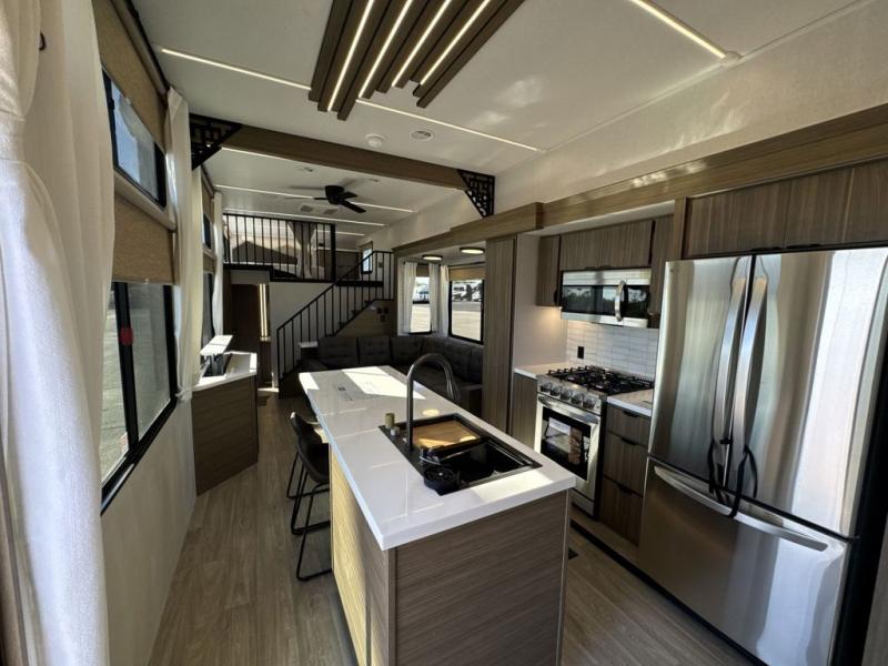 This thoughtfully designed 42ZEN model provides a blend of comfort and functionality. It features two lofts for added sleeping and living space, one includes a 62" x 74" Versa queen mattress and a dresser for storing clothes and essentials, while the second loft offers another Versa queen bed, plus a table with recessed footing, perfect for getting work or study done on the road. There is also a cabinet and shelf to keep everything organized. On the main floor, you'll find a large rear full bathroom, complete with a walk-in shower, linen closet, and washer/dryer prep, providing all the comforts of home. The main living area centers around a large sectional sofa with room for the whole crew, facing a fireplace and Televator TV, making it the perfect space to relax after a long day. The kitchen island also adds valuable prep space and also serves as a gathering spot with room for stools. Up front, the master bedroom features a king-size bed with Versa Tilt, a dresser, and its own private bathroom, offering convenience and privacy whenever you need it.