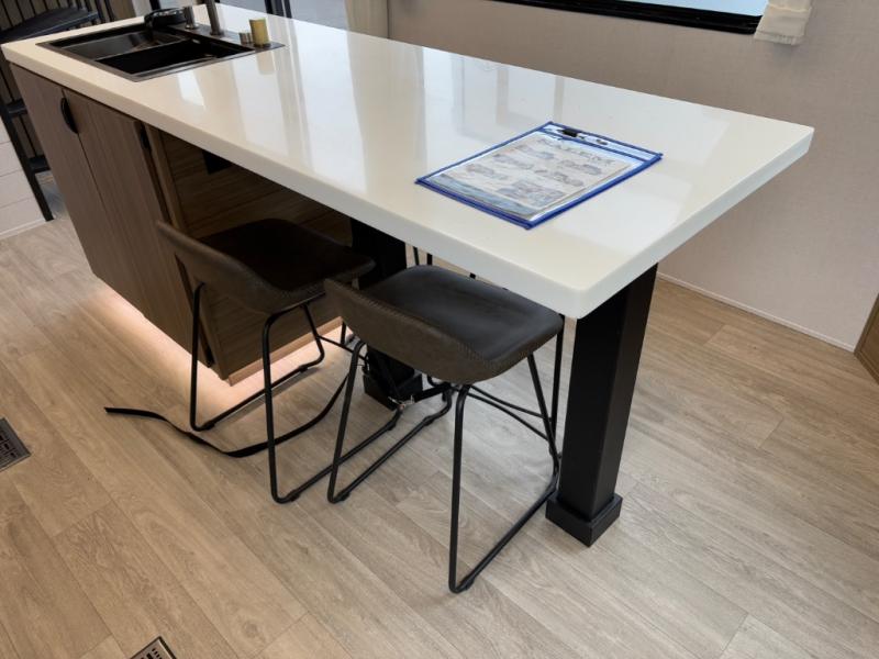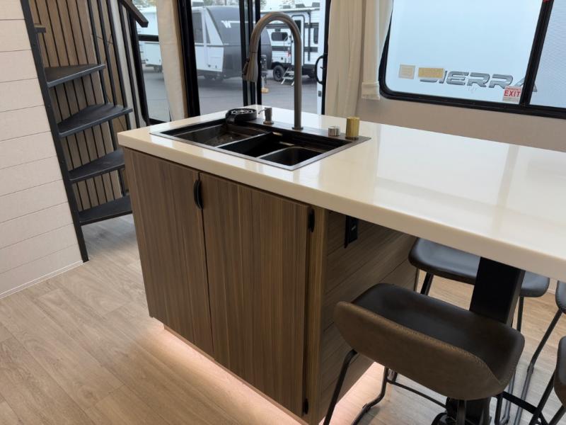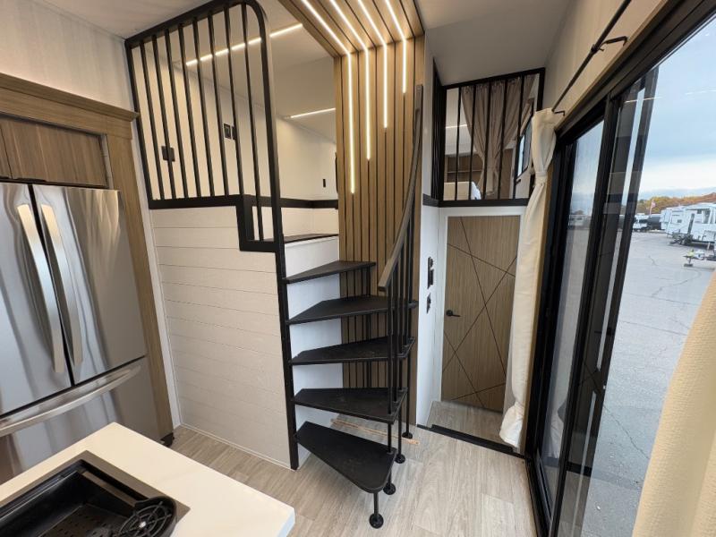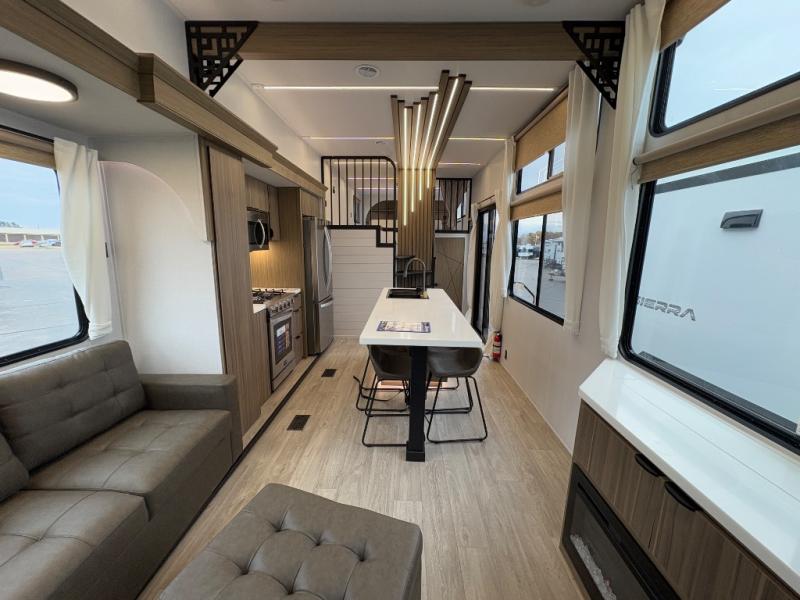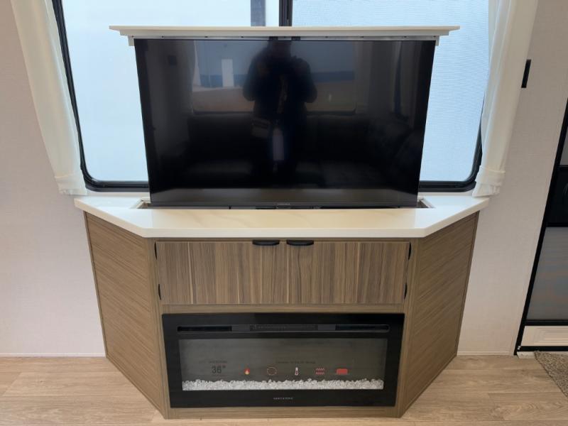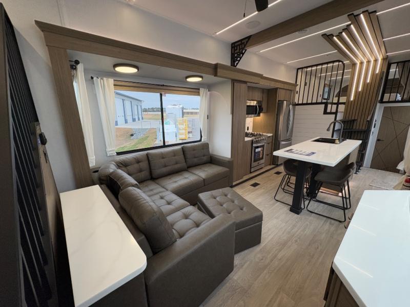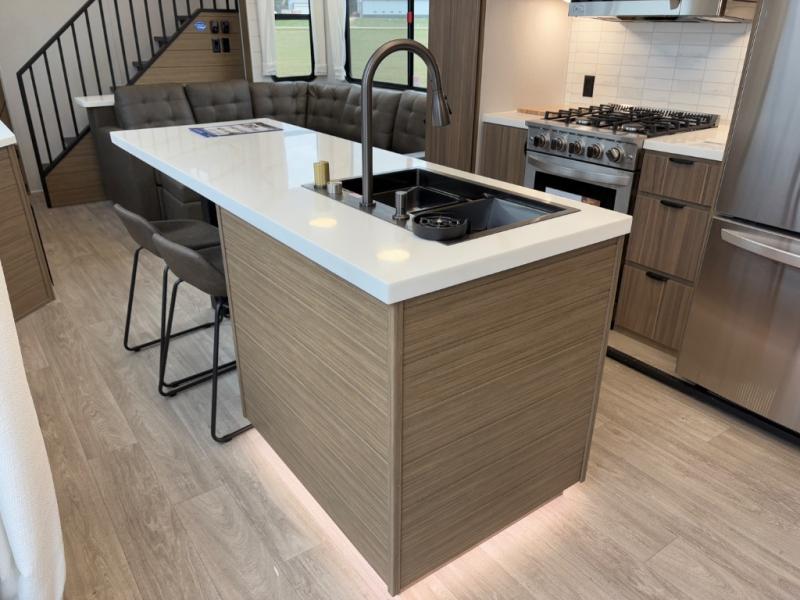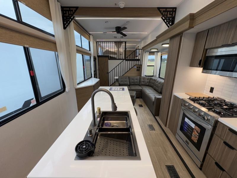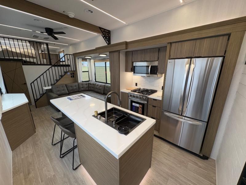 This thoughtfully designed 42ZEN model provides a blend of comfort and functionality. It features two lofts for added sleeping and living space, one includes a 62" x 74" Versa queen mattress and a dresser for storing clothes and essentials, while the second loft offers another Versa queen bed, plus a table with recessed footing, perfect for getting work or study done on the road. There is also a cabinet and shelf to keep everything organized. On the main floor, you'll find a large rear full bathroom, complete with a walk-in shower, linen closet, and washer/dryer prep, providing all the comforts of home. The main living area centers around a large sectional sofa with room for the whole crew, facing a fireplace and Televator TV, making it the perfect space to relax after a long day. The kitchen island also adds valuable prep space and also serves as a gathering spot with room for stools. Up front, the master bedroom features a king-size bed with Versa Tilt, a dresser, and its own private bathroom, offering convenience and privacy whenever you need it.