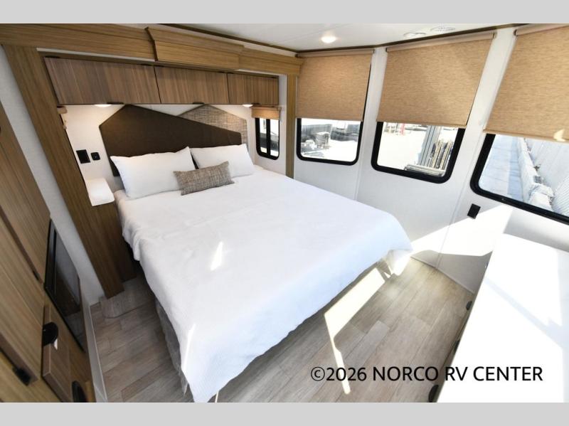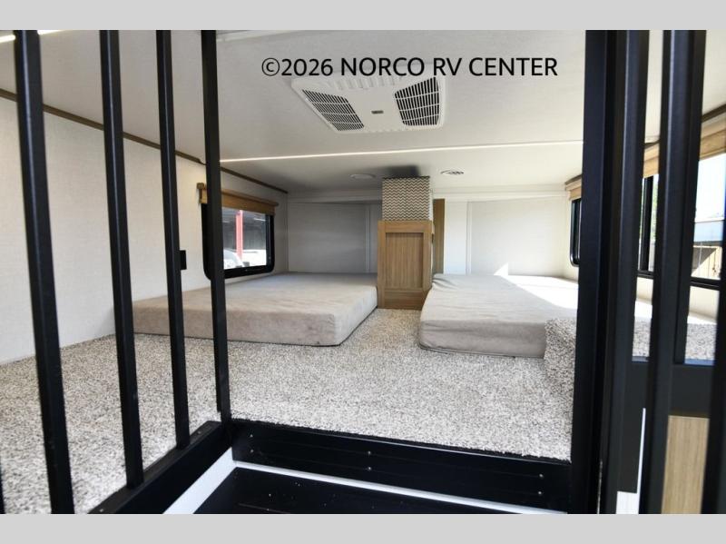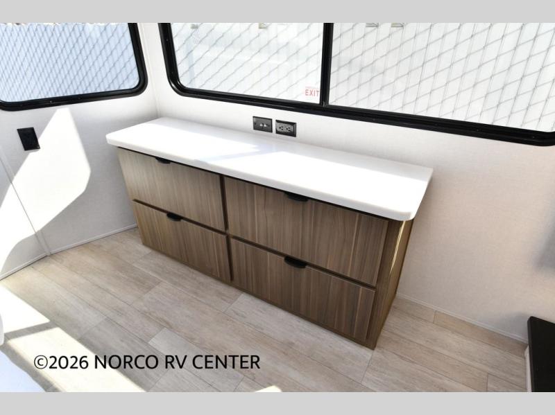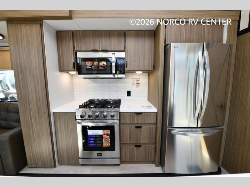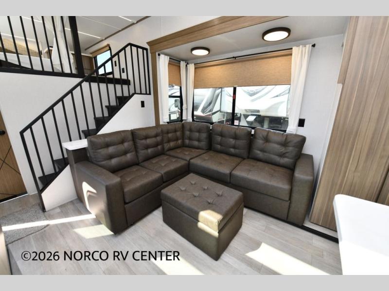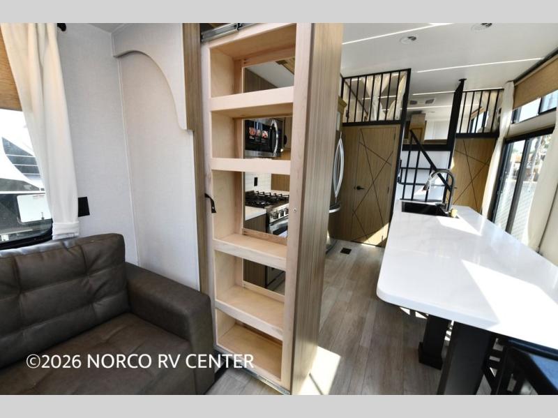 You will feel like you are home when you step inside! Not only will you be impressed with the super large slide in the main combined kitchen and living area, but check out the island with four counter height seats! The main entry closest to the front features a private bedroom with a custom king bed with Versa-Tilt within a slide, plus a fireplace and a dresser for your belongings. Just outside this door is a spiral staircase to the front loft with two 42" x 74" bunk mats above. The kitchen is fully equipped for you to provide the best home cooked meals with a pull-out pantry, range and microwave, plus side-by-side refrigerator. There is also a half bath off of the kitchen for added convenience! An L-shaped sectional sofa with an ottoman provides a cozy space to relax, and there is an entertainment center with a fireplace for a relaxing evenings indoors. A full rear bath features a spacious walk-in shower, a linen closet plus washer and dryer prep for the option to make laundry day easier. And the second loft with stairs is above the bath for even more sleeping space!