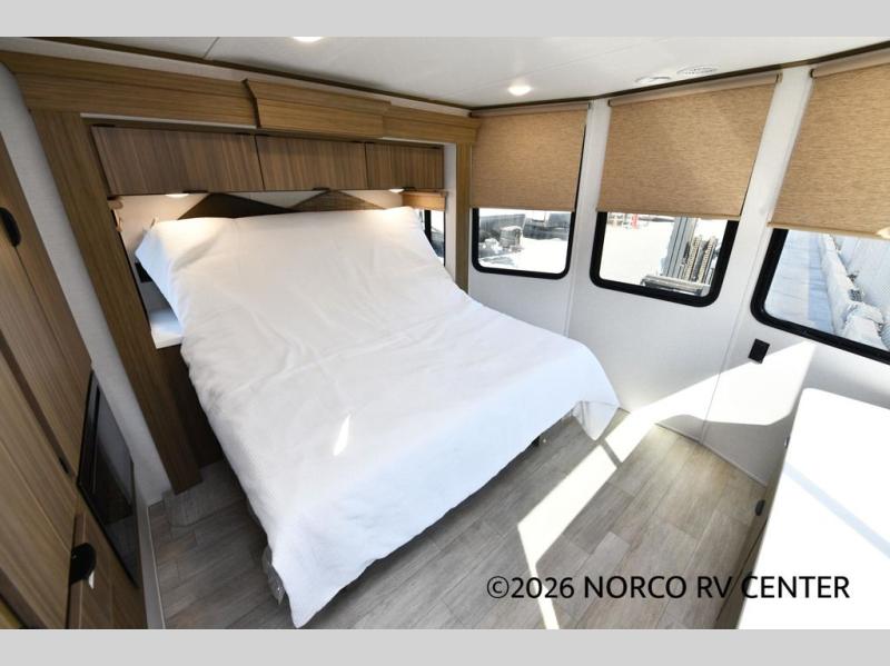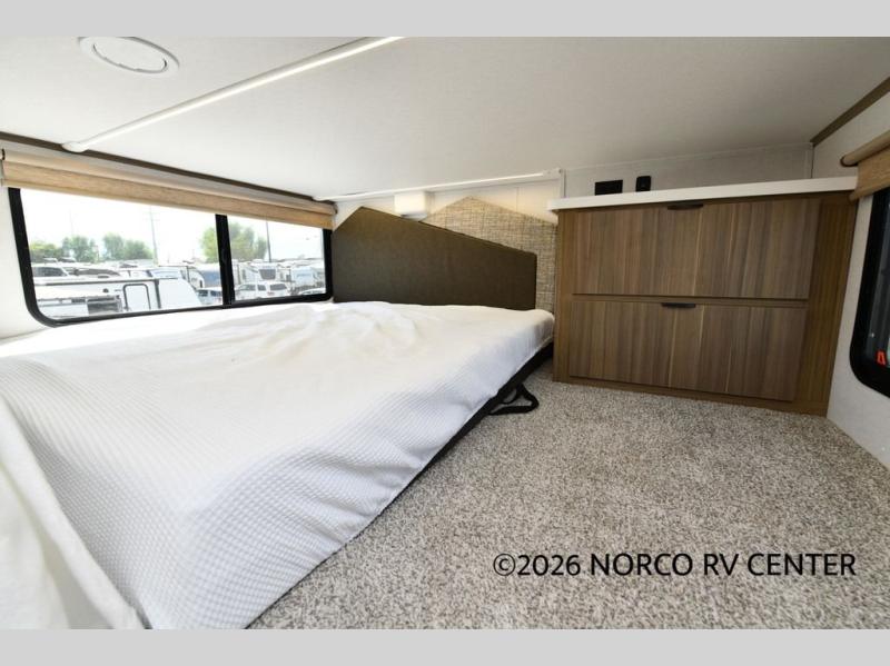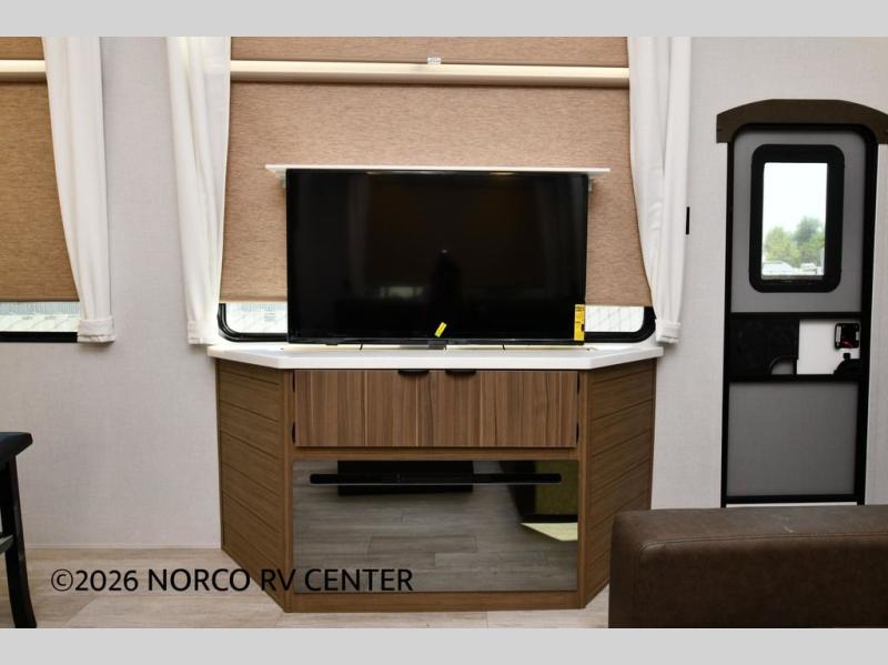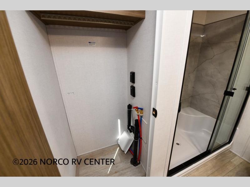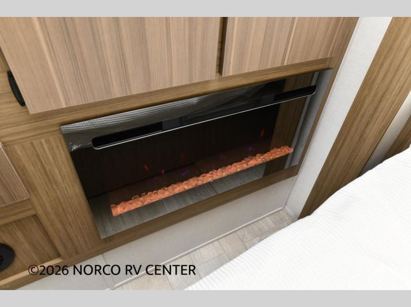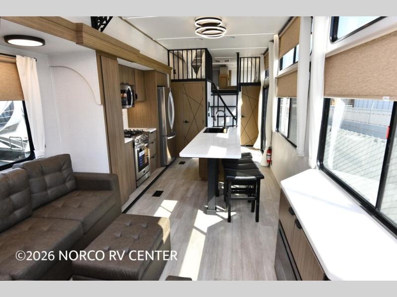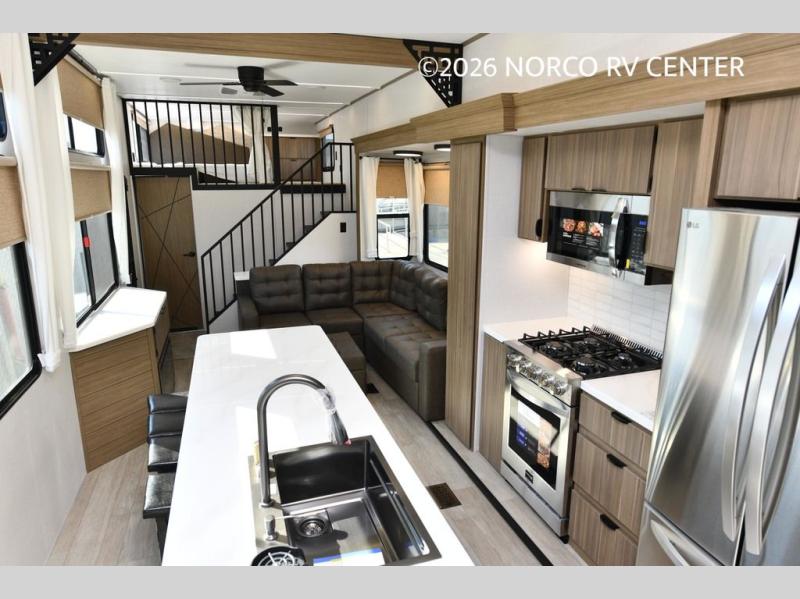 You will feel like you are home when you step inside! Not only will you be impressed with the super large slide in the main combined kitchen and living area, but check out the island with four counter height seats! The main entry closest to the front features a private bedroom with a custom king bed with Versa-Tilt within a slide, plus a fireplace and a dresser for your belongings. Just outside this door is a spiral staircase to the front loft with two 42" x 74" bunk mats above. The kitchen is fully equipped for you to provide the best home cooked meals with a pull-out pantry, range and microwave, plus side-by-side refrigerator. There is also a half bath off of the kitchen for added convenience! An L-shaped sectional sofa with an ottoman provides a cozy space to relax, and there is an entertainment center with a fireplace for a relaxing evenings indoors. A full rear bath features a spacious walk-in shower, a linen closet plus washer and dryer prep for the option to make laundry day easier. And the second loft with stairs is above the bath for even more sleeping space!