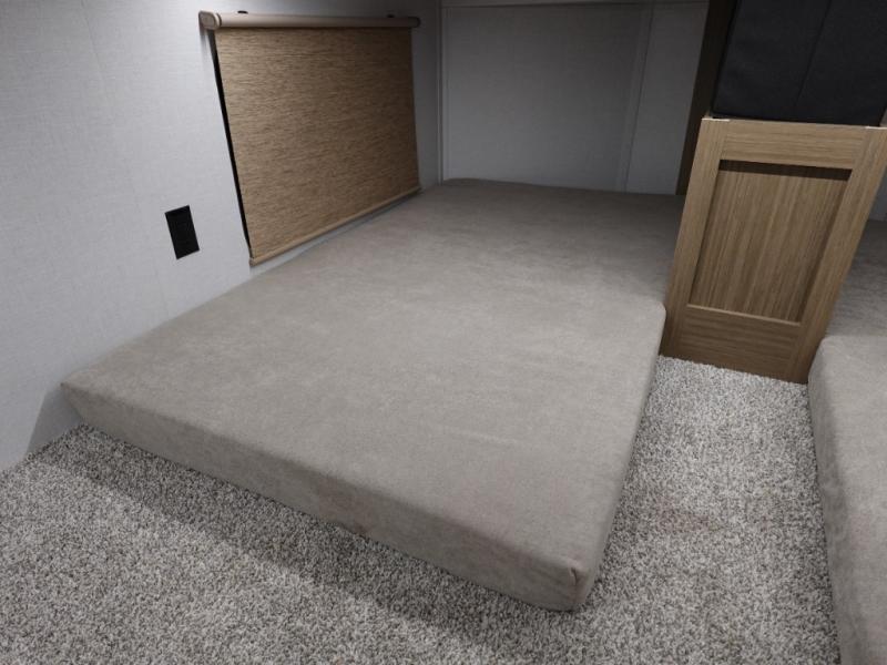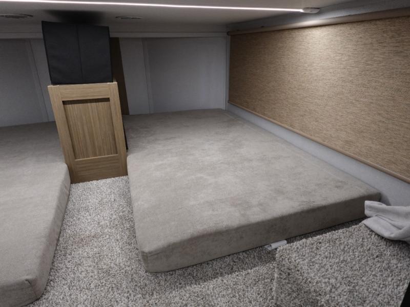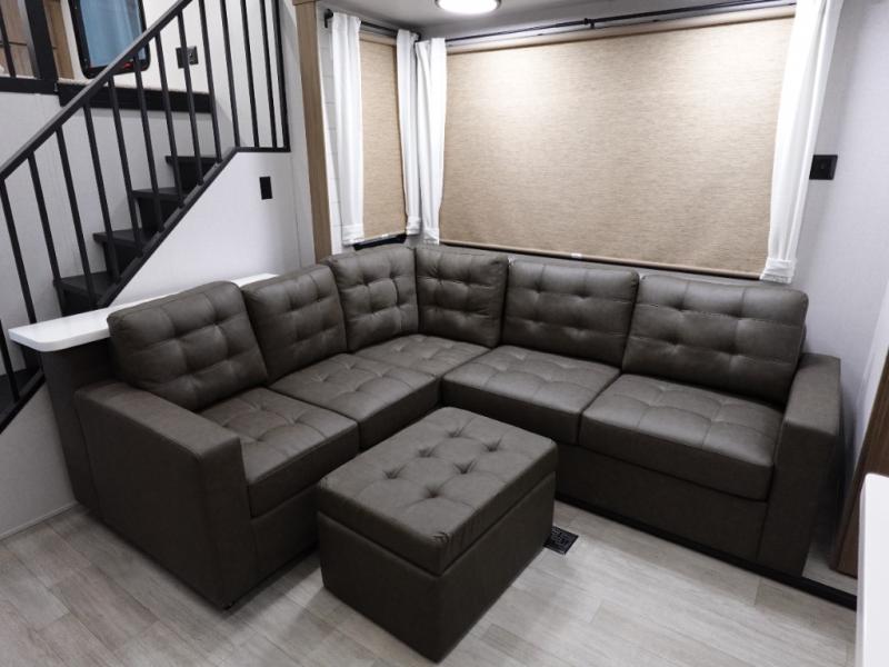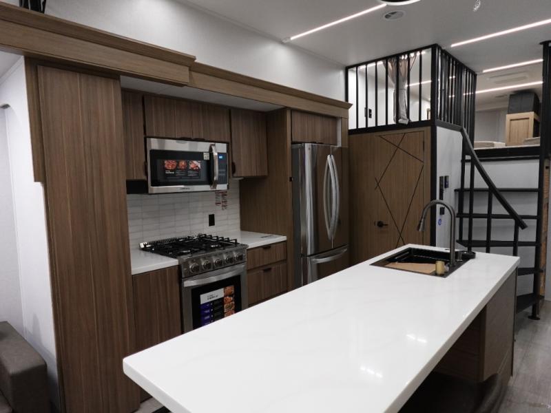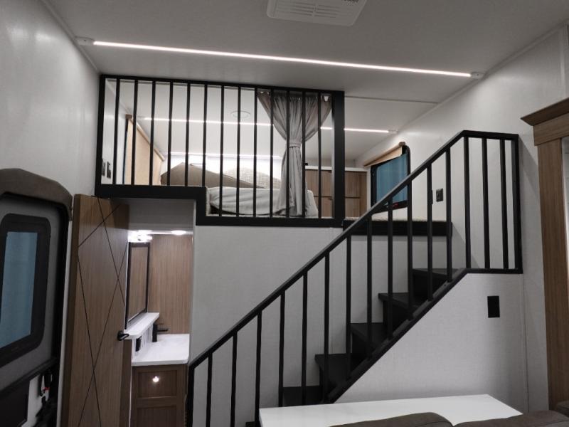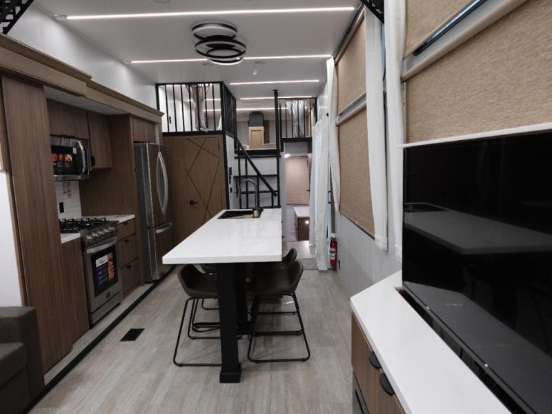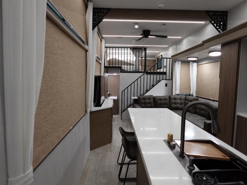 This 44ZEN trailer is designed to offer maximum comfort and space. It features two lofts that adds extra sleeping space, one includes a 62" x 74" Versa queen mattress and a dresser for personal items, while the second loft comes with a Versa queen bed, shelf and cabinet storage, and a table with recessed footing, perfect for remote work or study sessions. On the main floor, the rear full bathroom is fully equipped with a walk-in shower, linen closet, and washer/dryer prep. At the center we have a large sectional sofa invites everyone to gather, facing a fireplace and Televator TV, great for movie nights or relaxing. The kitchen island adds prep space but also doubles as a casual dining area with barstool seating. For added convenience, a half bath is tucked beside the second stairway, providing easy access if needed. Up front, the master bedroom offers a retreat with a king-size bed with Versa Tilt, a dresser for storage, and a wall of windows that provides a view of the scenery outside.