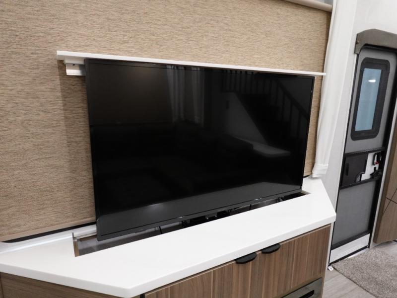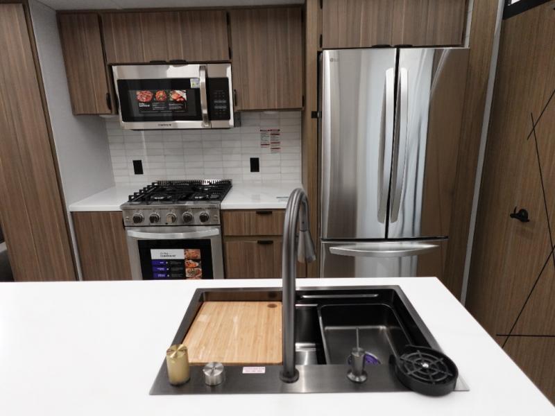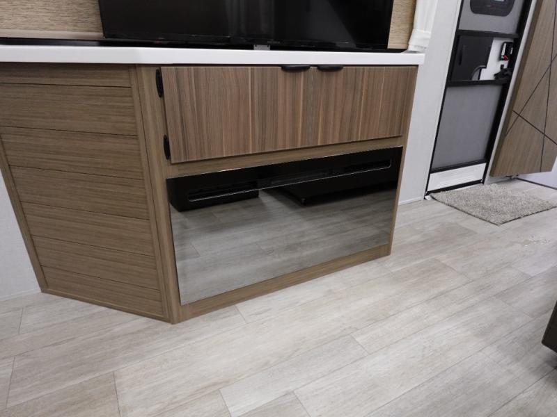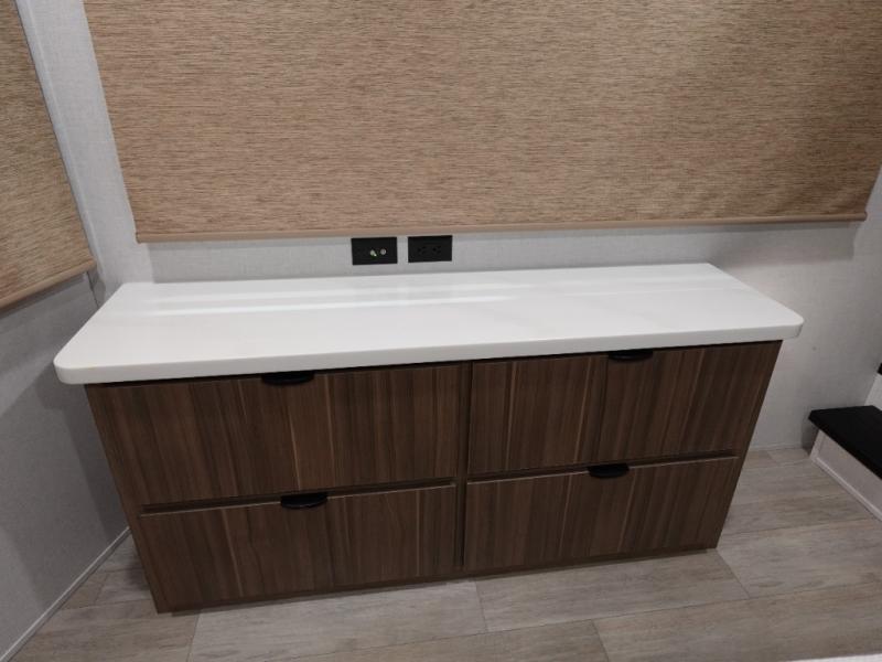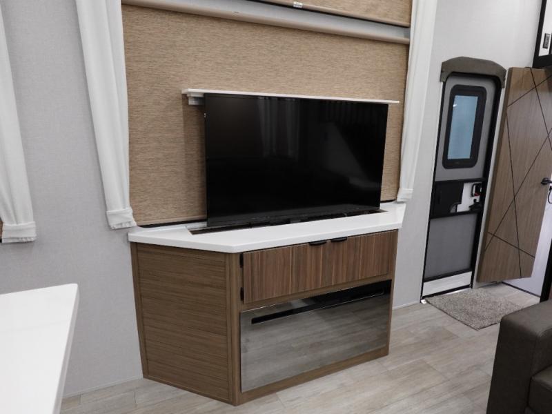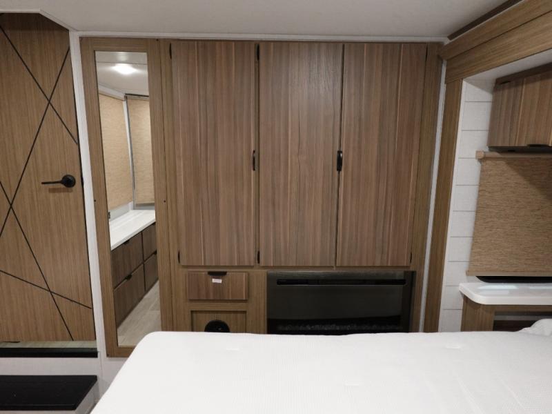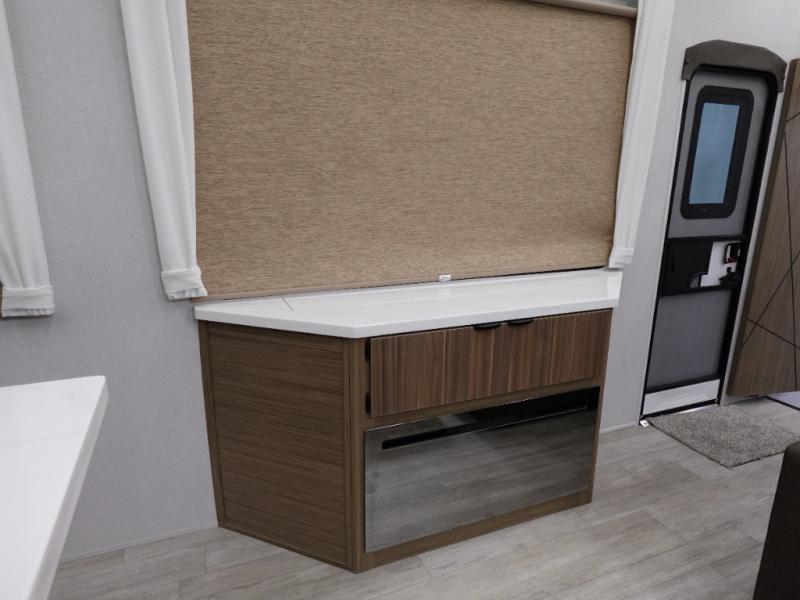 This 44ZEN trailer is designed to offer maximum comfort and space. It features two lofts that adds extra sleeping space, one includes a 62" x 74" Versa queen mattress and a dresser for personal items, while the second loft comes with a Versa queen bed, shelf and cabinet storage, and a table with recessed footing, perfect for remote work or study sessions. On the main floor, the rear full bathroom is fully equipped with a walk-in shower, linen closet, and washer/dryer prep. At the center we have a large sectional sofa invites everyone to gather, facing a fireplace and Televator TV, great for movie nights or relaxing. The kitchen island adds prep space but also doubles as a casual dining area with barstool seating. For added convenience, a half bath is tucked beside the second stairway, providing easy access if needed. Up front, the master bedroom offers a retreat with a king-size bed with Versa Tilt, a dresser for storage, and a wall of windows that provides a view of the scenery outside.