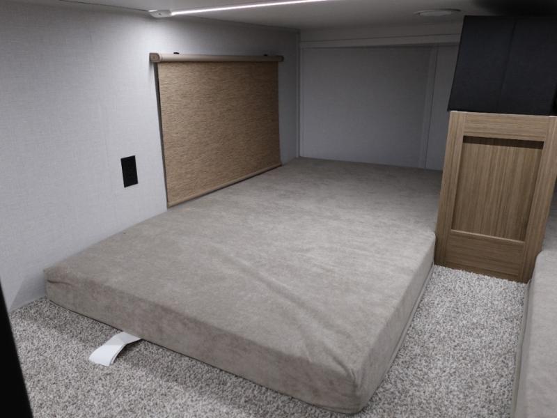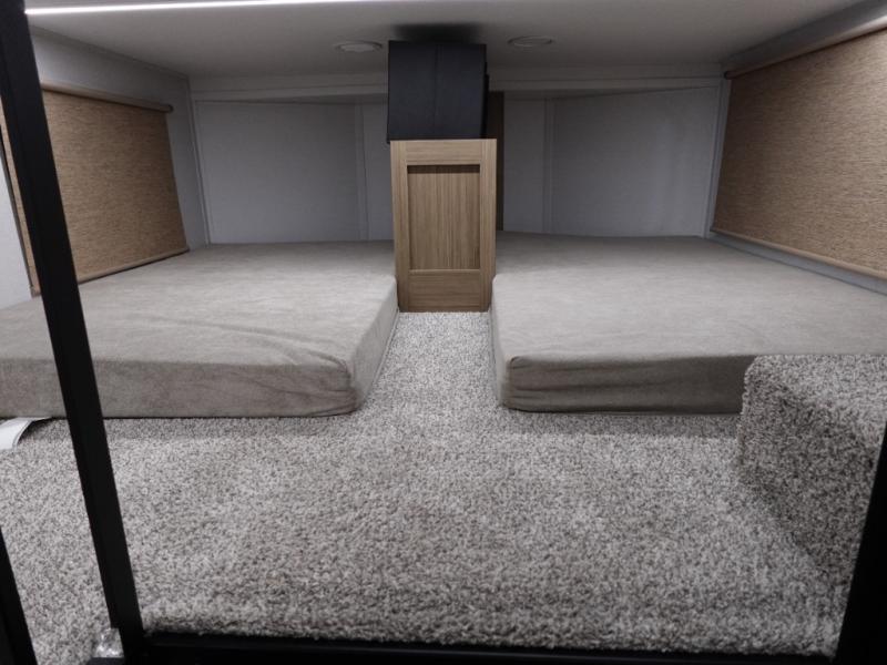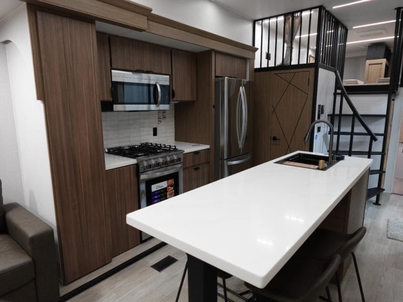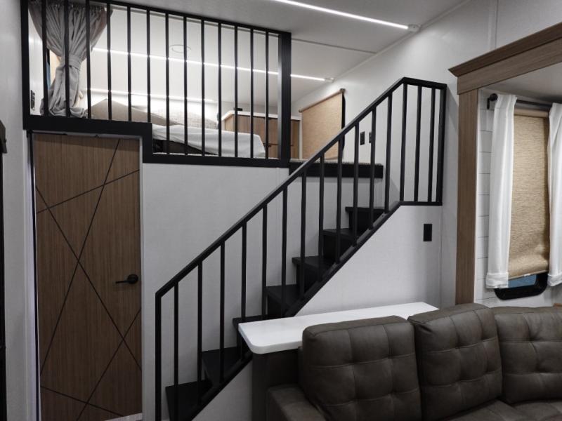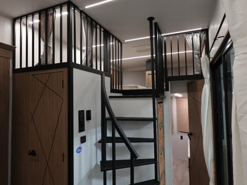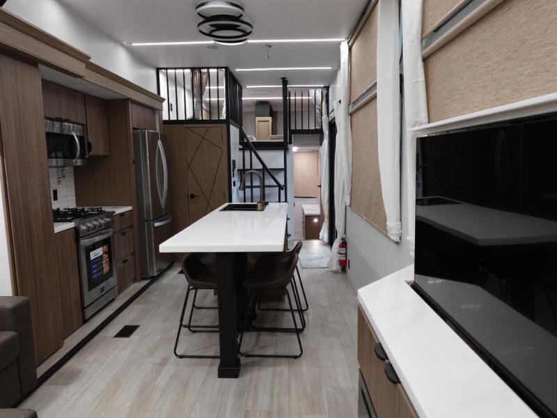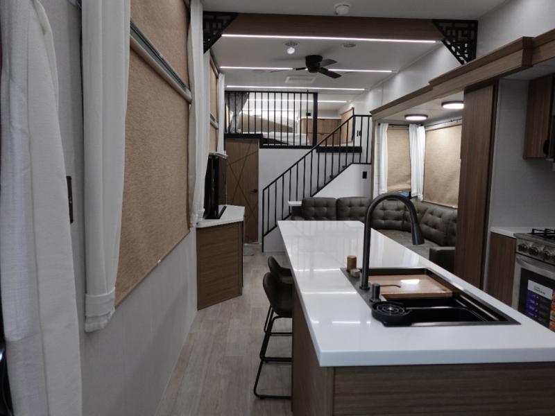 This 44ZEN trailer is designed to offer maximum comfort and space. It features two lofts that adds extra sleeping space, one includes a 62" x 74" Versa queen mattress and a dresser for personal items, while the second loft comes with a Versa queen bed, shelf and cabinet storage, and a table with recessed footing, perfect for remote work or study sessions. On the main floor, the rear full bathroom is fully equipped with a walk-in shower, linen closet, and washer/dryer prep. At the center we have a large sectional sofa invites everyone to gather, facing a fireplace and Televator TV, great for movie nights or relaxing. The kitchen island adds prep space but also doubles as a casual dining area with barstool seating. For added convenience, a half bath is tucked beside the second stairway, providing easy access if needed. Up front, the master bedroom offers a retreat with a king-size bed with Versa Tilt, a dresser for storage, and a wall of windows that provides a view of the scenery outside.