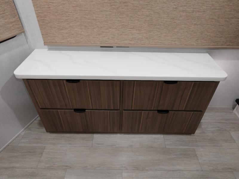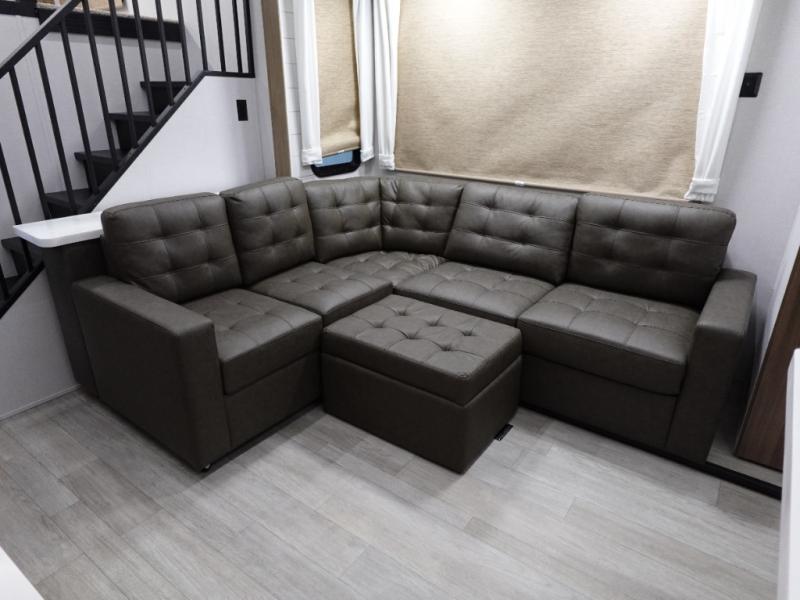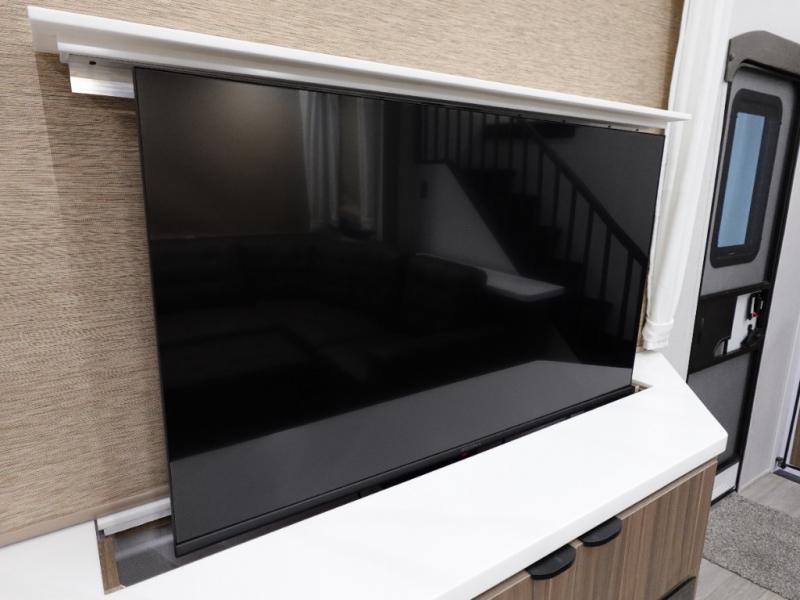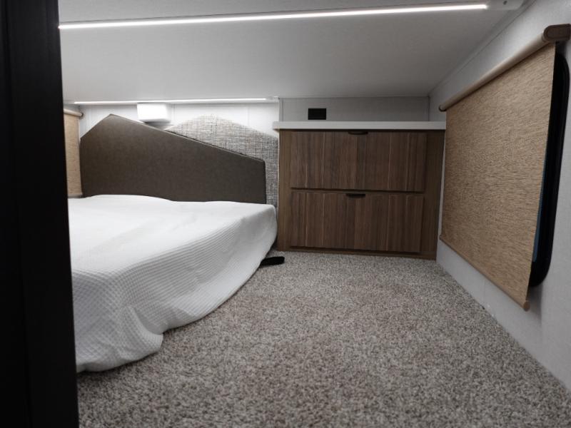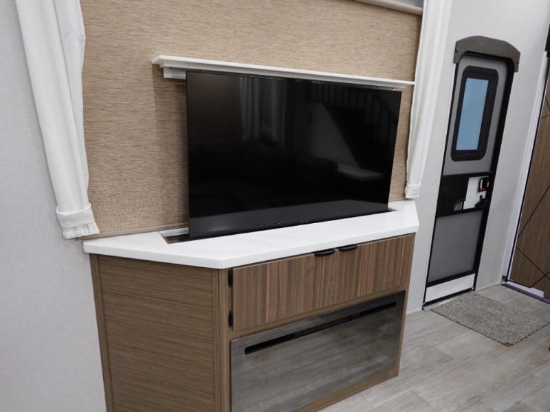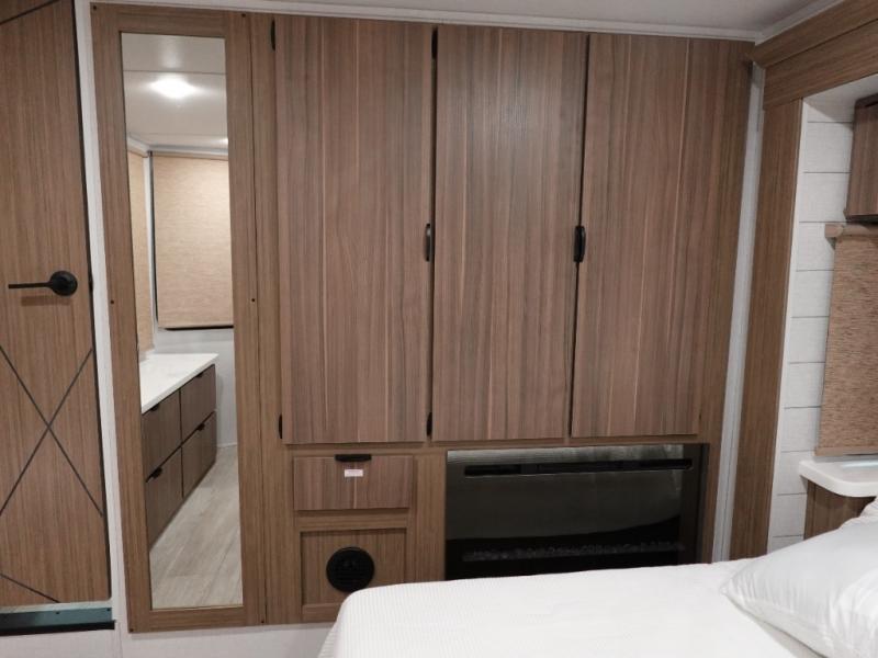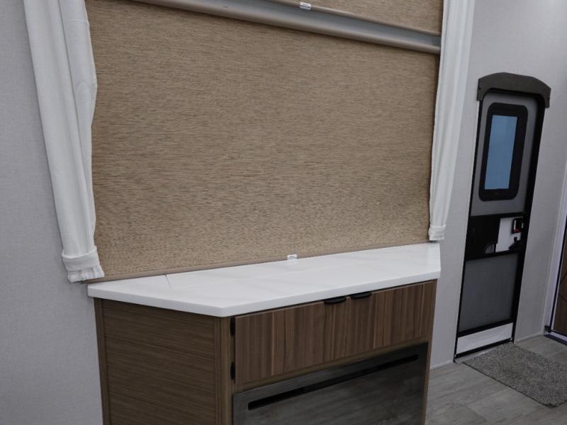 This 44ZEN trailer is designed to offer maximum comfort and space. It features two lofts that adds extra sleeping space, one includes a 62" x 74" Versa queen mattress and a dresser for personal items, while the second loft comes with a Versa queen bed, shelf and cabinet storage, and a table with recessed footing, perfect for remote work or study sessions. On the main floor, the rear full bathroom is fully equipped with a walk-in shower, linen closet, and washer/dryer prep. At the center we have a large sectional sofa invites everyone to gather, facing a fireplace and Televator TV, great for movie nights or relaxing. The kitchen island adds prep space but also doubles as a casual dining area with barstool seating. For added convenience, a half bath is tucked beside the second stairway, providing easy access if needed. Up front, the master bedroom offers a retreat with a king-size bed with Versa Tilt, a dresser for storage, and a wall of windows that provides a view of the scenery outside.