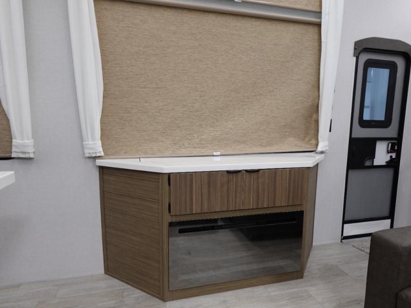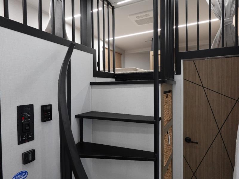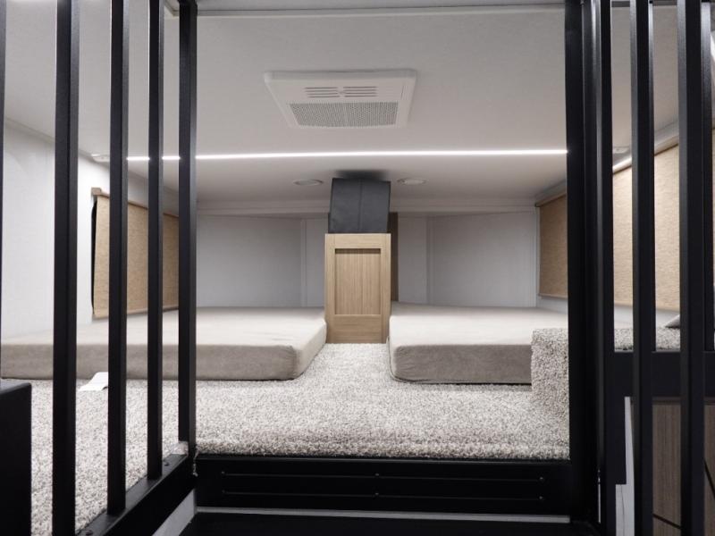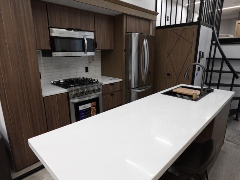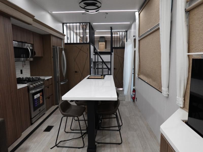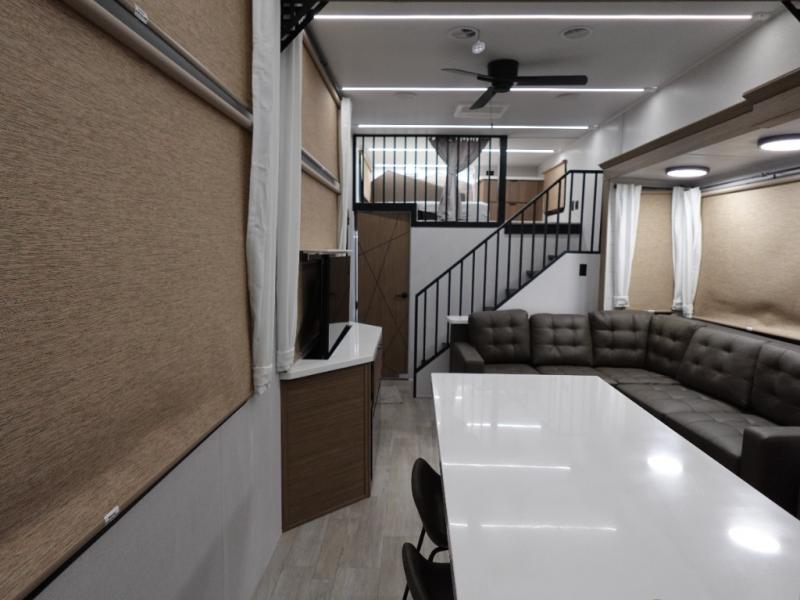 This 44ZEN trailer is designed to offer maximum comfort and space. It features two lofts that adds extra sleeping space, one includes a 62" x 74" Versa queen mattress and a dresser for personal items, while the second loft comes with a Versa queen bed, shelf and cabinet storage, and a table with recessed footing, perfect for remote work or study sessions. On the main floor, the rear full bathroom is fully equipped with a walk-in shower, linen closet, and washer/dryer prep. At the center we have a large sectional sofa invites everyone to gather, facing a fireplace and Televator TV, great for movie nights or relaxing. The kitchen island adds prep space but also doubles as a casual dining area with barstool seating. For added convenience, a half bath is tucked beside the second stairway, providing easy access if needed. Up front, the master bedroom offers a retreat with a king-size bed with Versa Tilt, a dresser for storage, and a wall of windows that provides a view of the scenery outside.