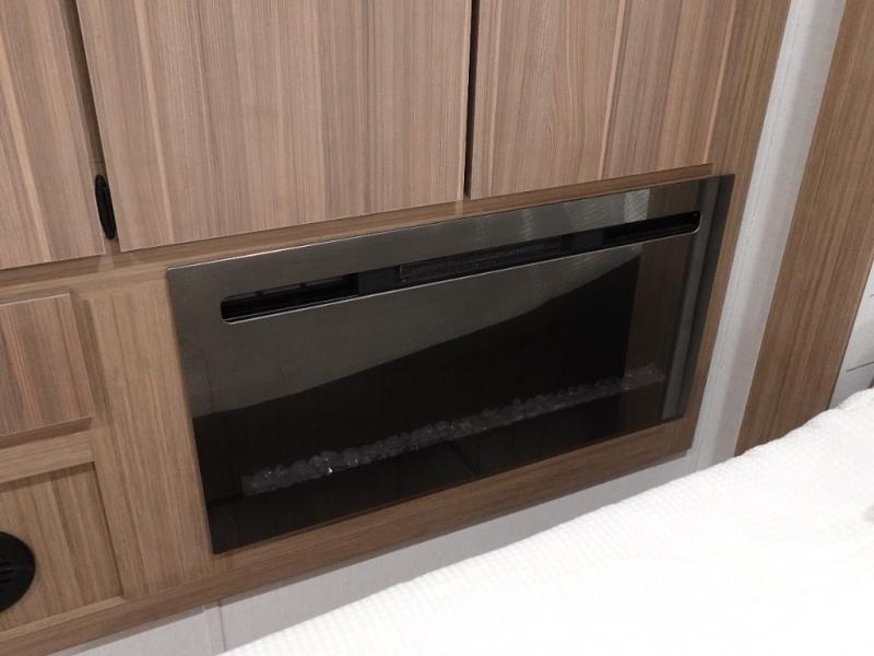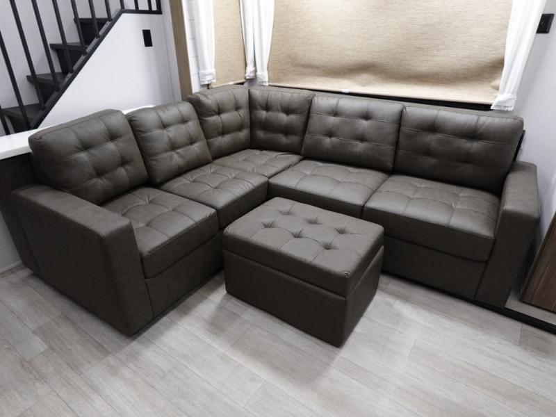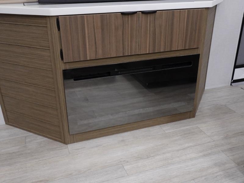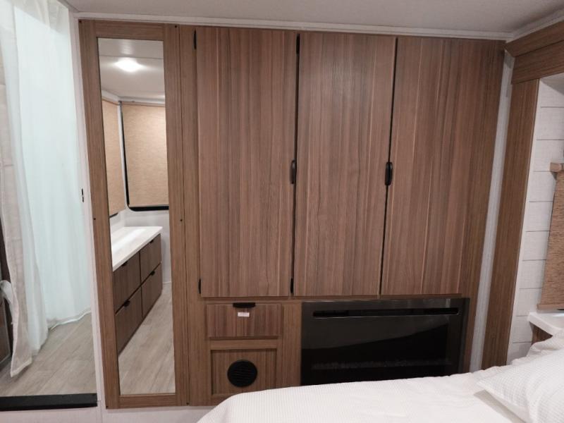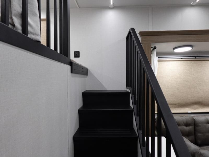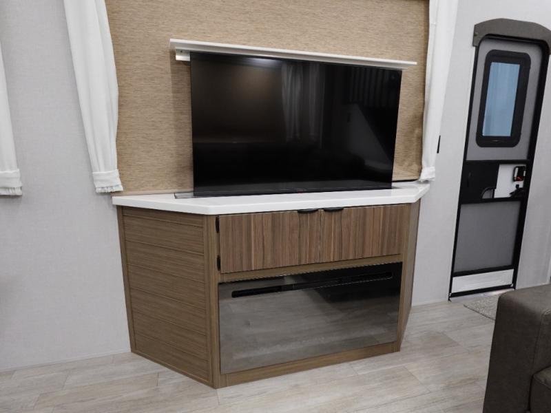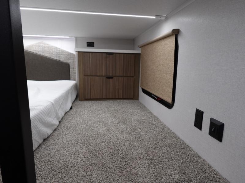 This 44ZEN trailer is designed to offer maximum comfort and space. It features two lofts that adds extra sleeping space, one includes a 62" x 74" Versa queen mattress and a dresser for personal items, while the second loft comes with a Versa queen bed, shelf and cabinet storage, and a table with recessed footing, perfect for remote work or study sessions. On the main floor, the rear full bathroom is fully equipped with a walk-in shower, linen closet, and washer/dryer prep. At the center we have a large sectional sofa invites everyone to gather, facing a fireplace and Televator TV, great for movie nights or relaxing. The kitchen island adds prep space but also doubles as a casual dining area with barstool seating. For added convenience, a half bath is tucked beside the second stairway, providing easy access if needed. Up front, the master bedroom offers a retreat with a king-size bed with Versa Tilt, a dresser for storage, and a wall of windows that provides a view of the scenery outside.