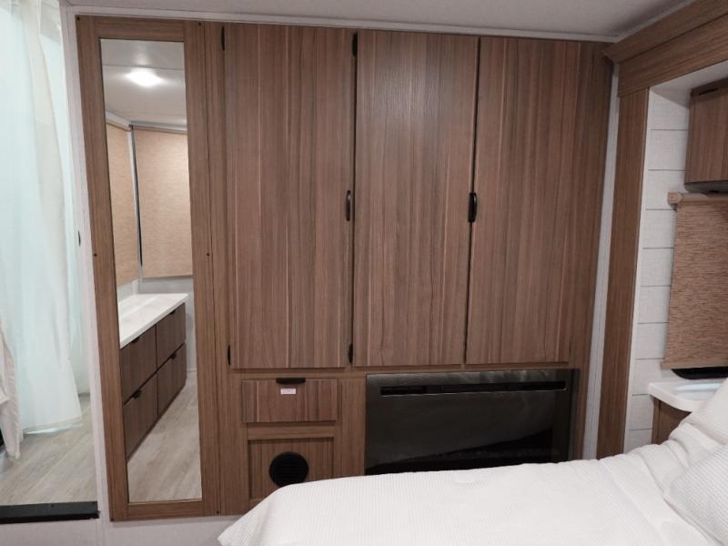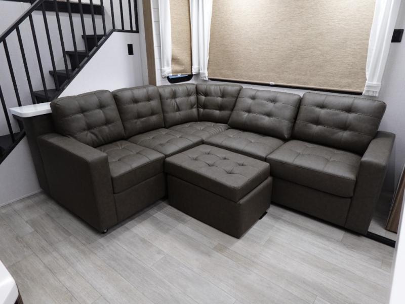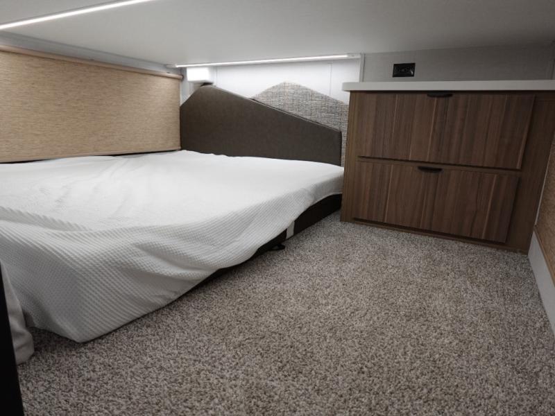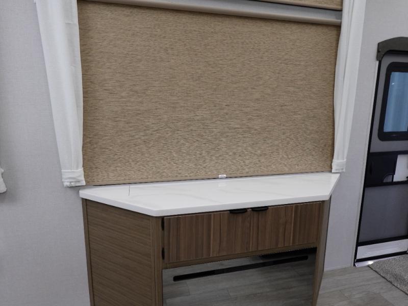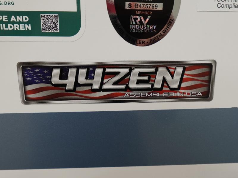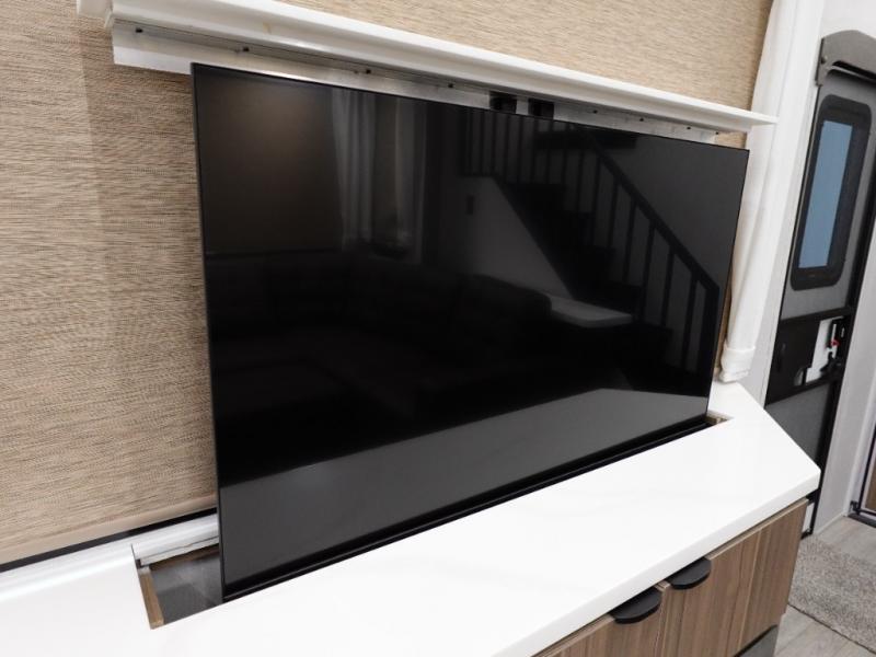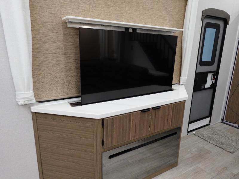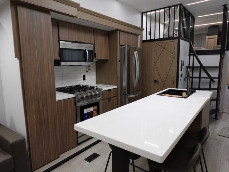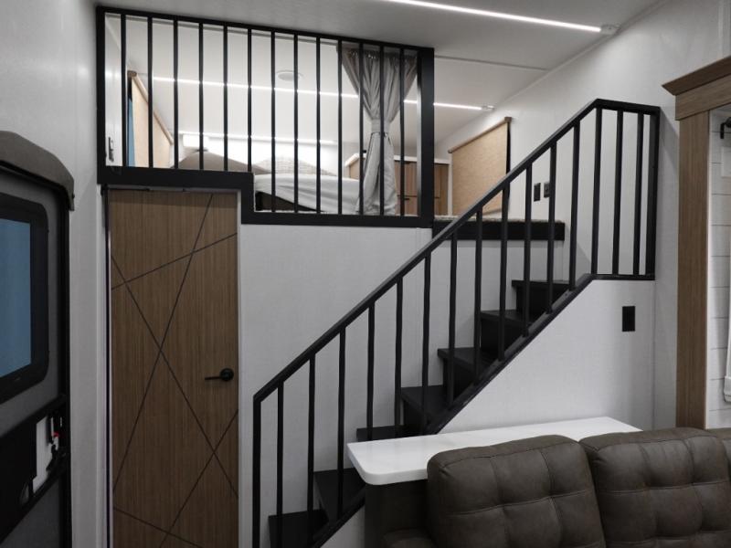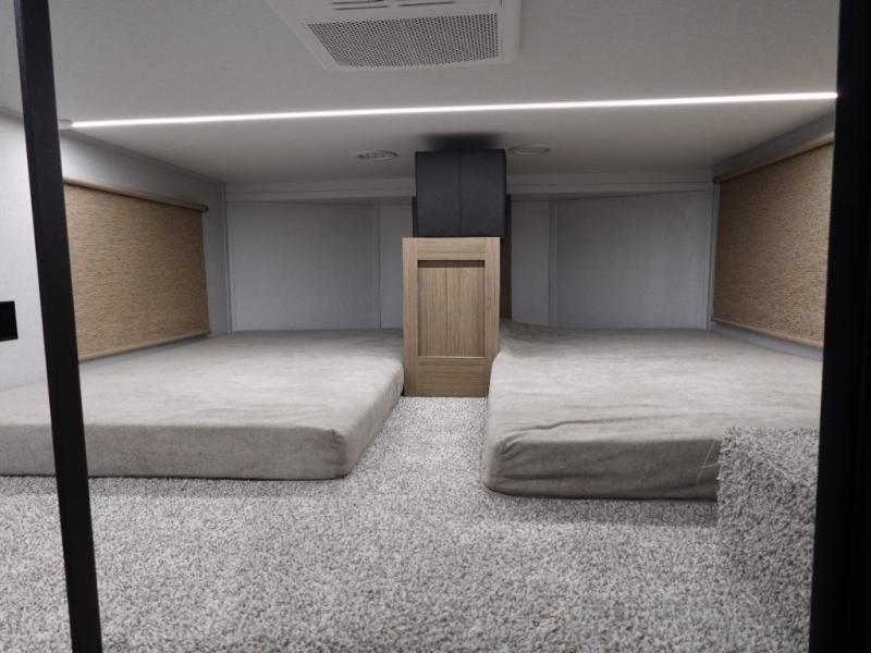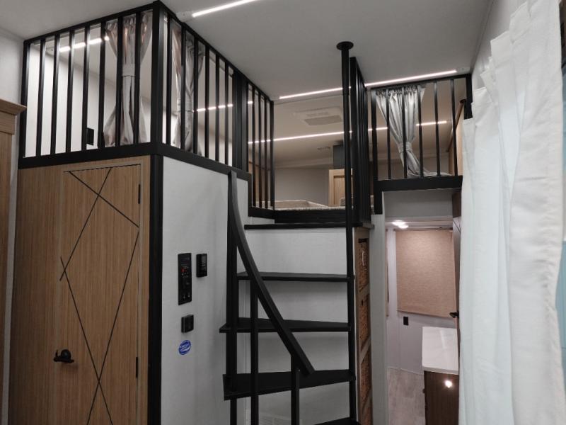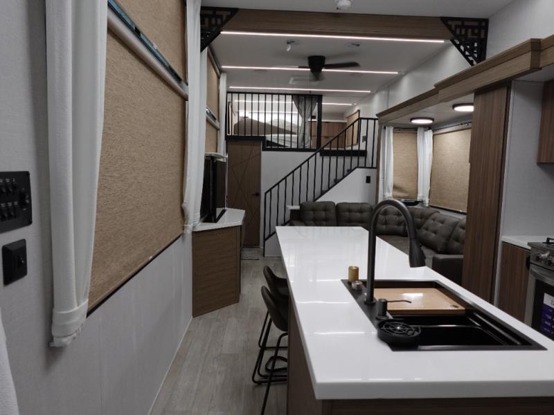 This 44ZEN trailer is designed to offer maximum comfort and space. It features two lofts that adds extra sleeping space, one includes a 62" x 74" Versa queen mattress and a dresser for personal items, while the second loft comes with a Versa queen bed, shelf and cabinet storage, and a table with recessed footing, perfect for remote work or study sessions. On the main floor, the rear full bathroom is fully equipped with a walk-in shower, linen closet, and washer/dryer prep. At the center we have a large sectional sofa invites everyone to gather, facing a fireplace and Televator TV, great for movie nights or relaxing. The kitchen island adds prep space but also doubles as a casual dining area with barstool seating. For added convenience, a half bath is tucked beside the second stairway, providing easy access if needed. Up front, the master bedroom offers a retreat with a king-size bed with Versa Tilt, a dresser for storage, and a wall of windows that provides a view of the scenery outside.