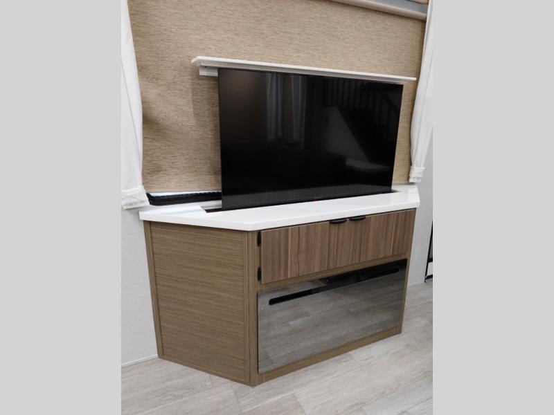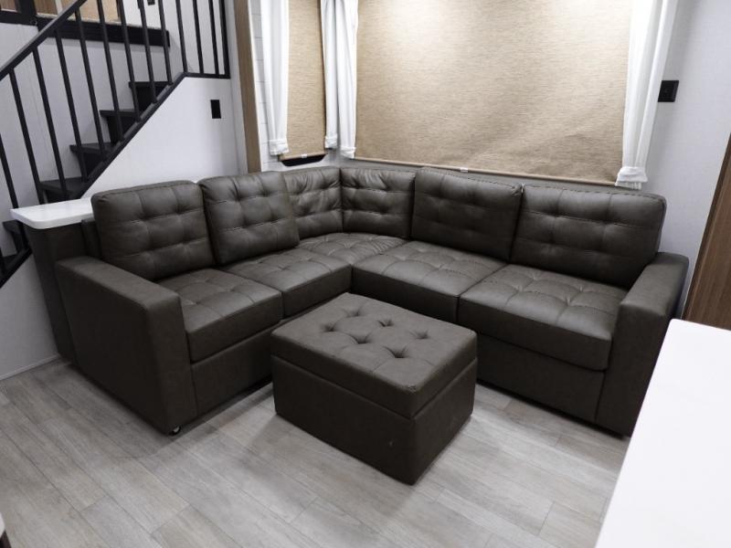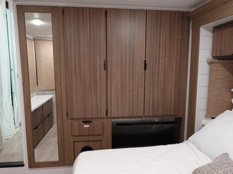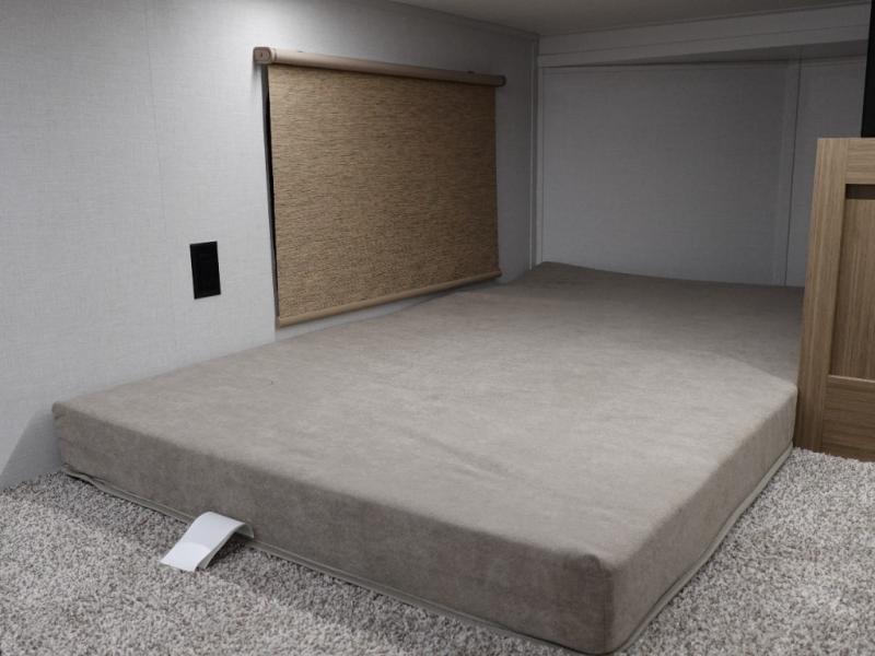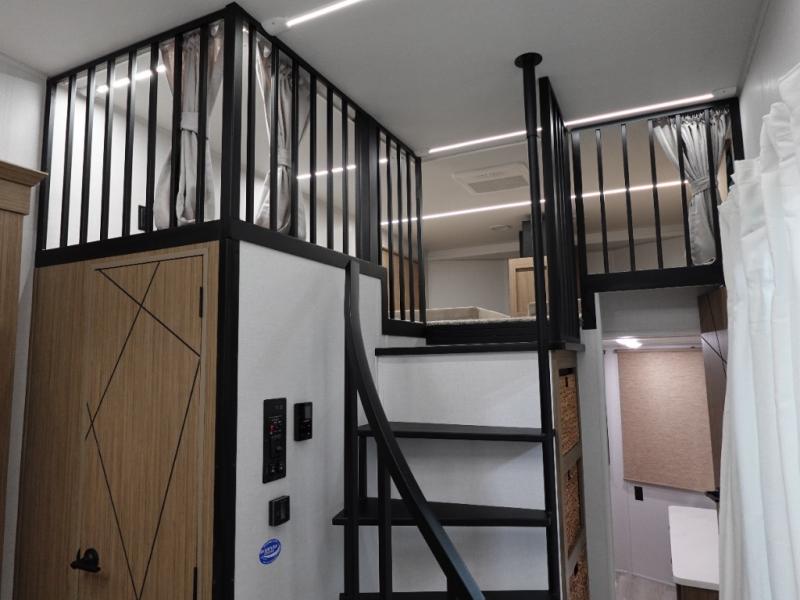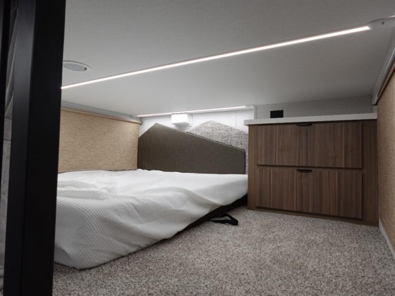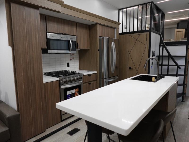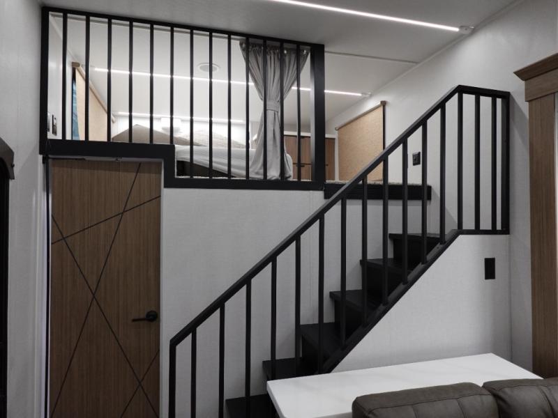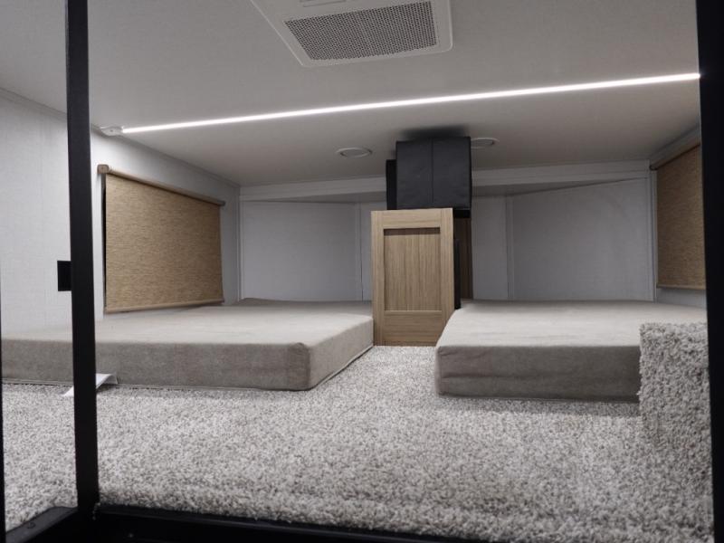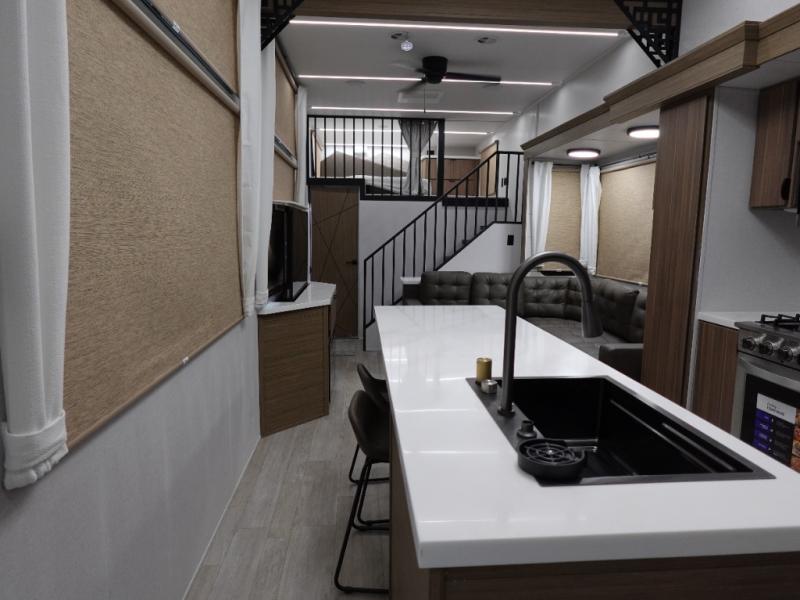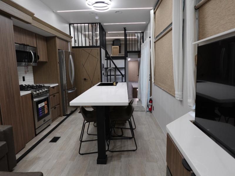 This 44ZEN trailer is designed to offer maximum comfort and space. It features two lofts that adds extra sleeping space, one includes a 62" x 74" Versa queen mattress and a dresser for personal items, while the second loft comes with a Versa queen bed, shelf and cabinet storage, and a table with recessed footing, perfect for remote work or study sessions. On the main floor, the rear full bathroom is fully equipped with a walk-in shower, linen closet, and washer/dryer prep. At the center we have a large sectional sofa invites everyone to gather, facing a fireplace and Televator TV, great for movie nights or relaxing. The kitchen island adds prep space but also doubles as a casual dining area with barstool seating. For added convenience, a half bath is tucked beside the second stairway, providing easy access if needed. Up front, the master bedroom offers a retreat with a king-size bed with Versa Tilt, a dresser for storage, and a wall of windows that provides a view of the scenery outside.