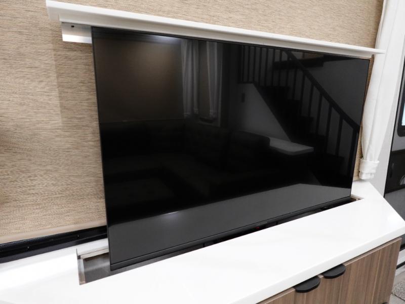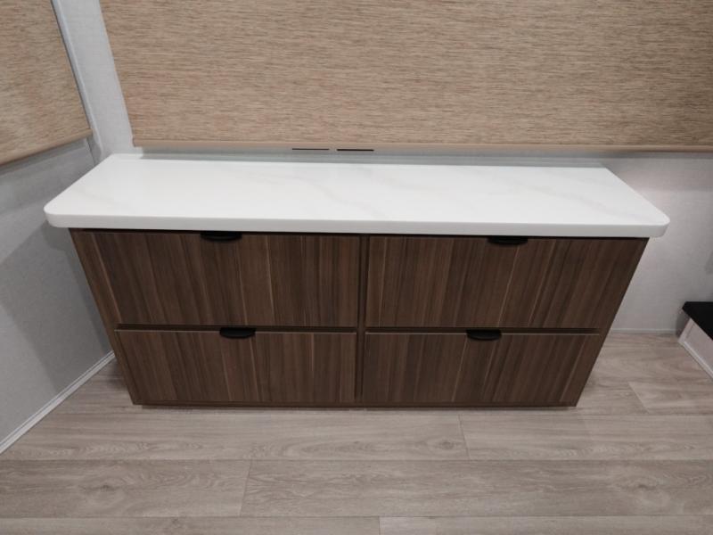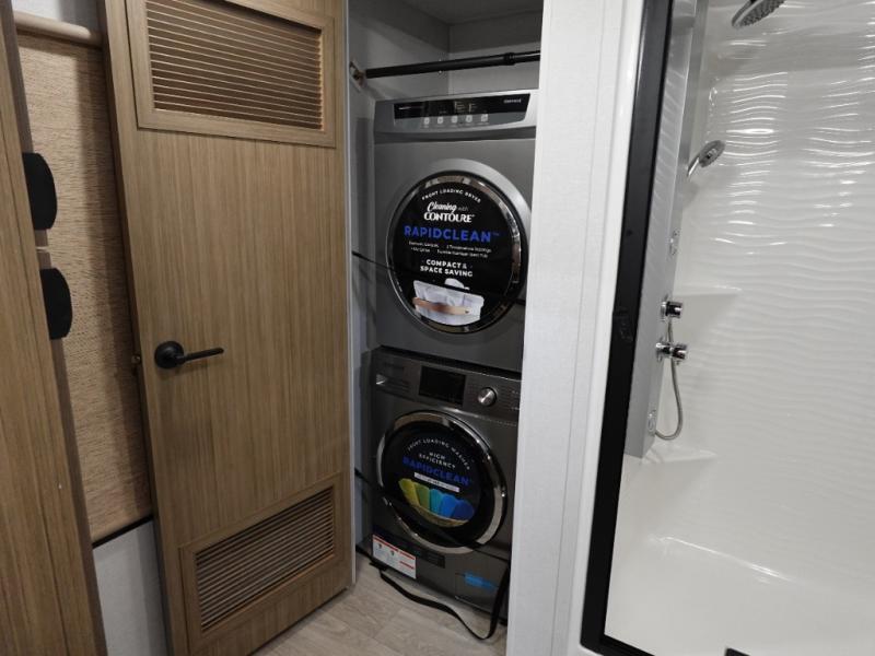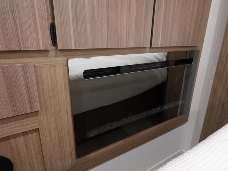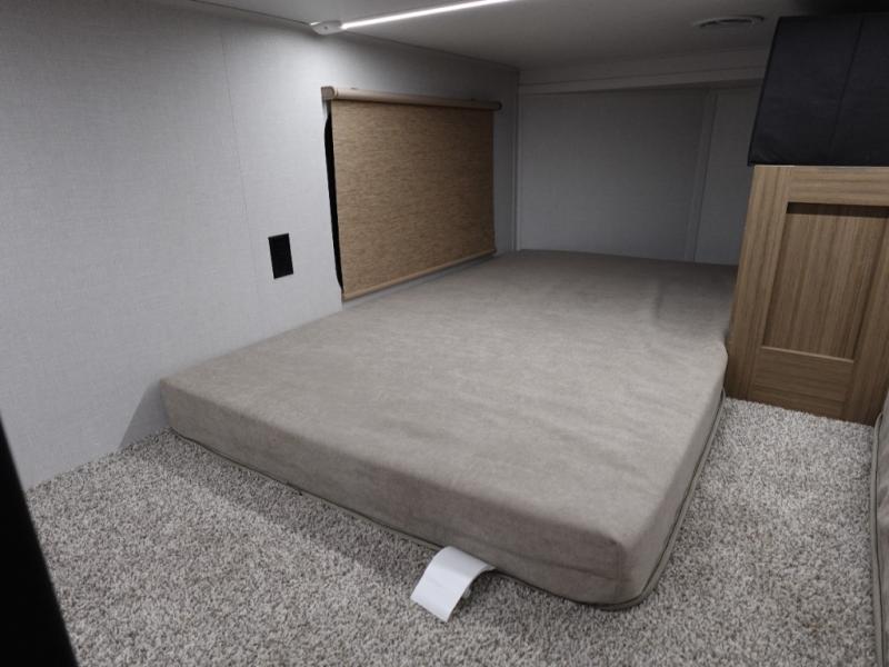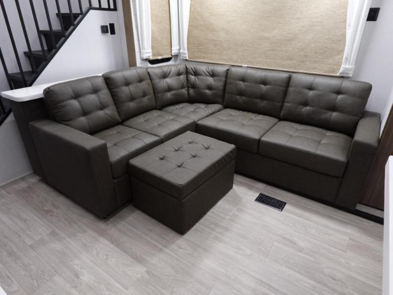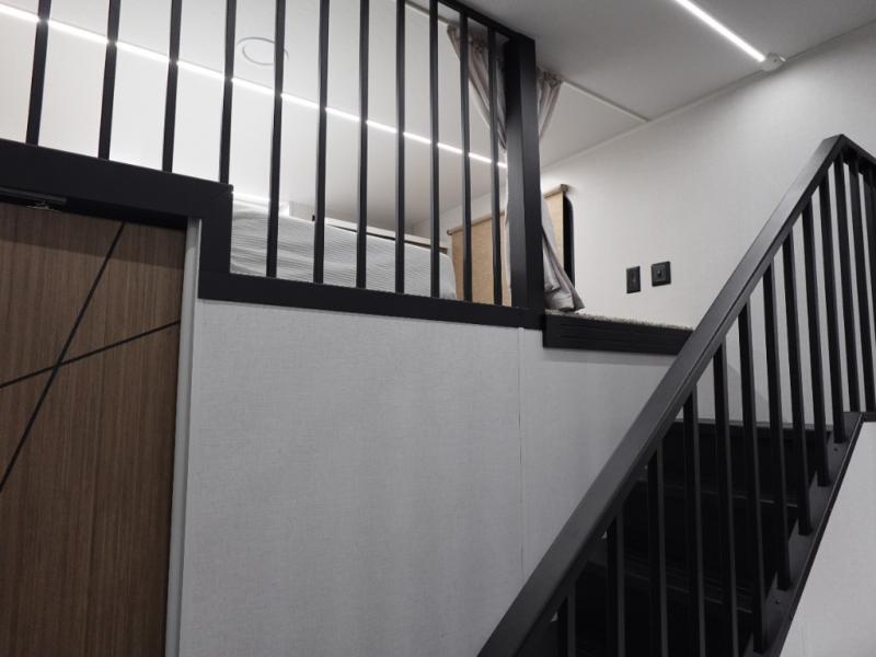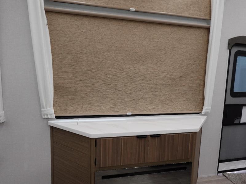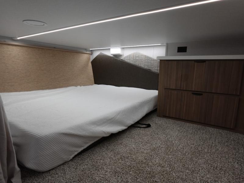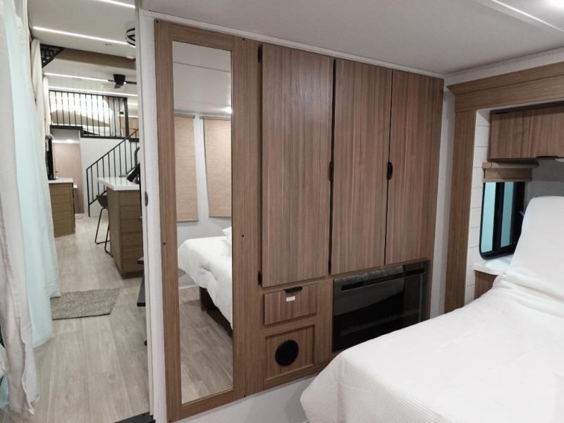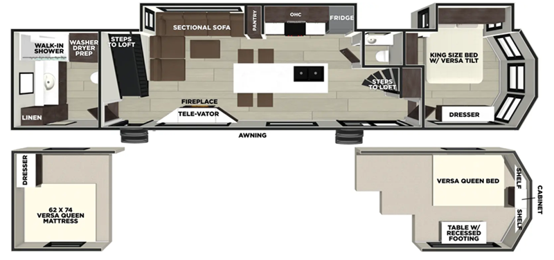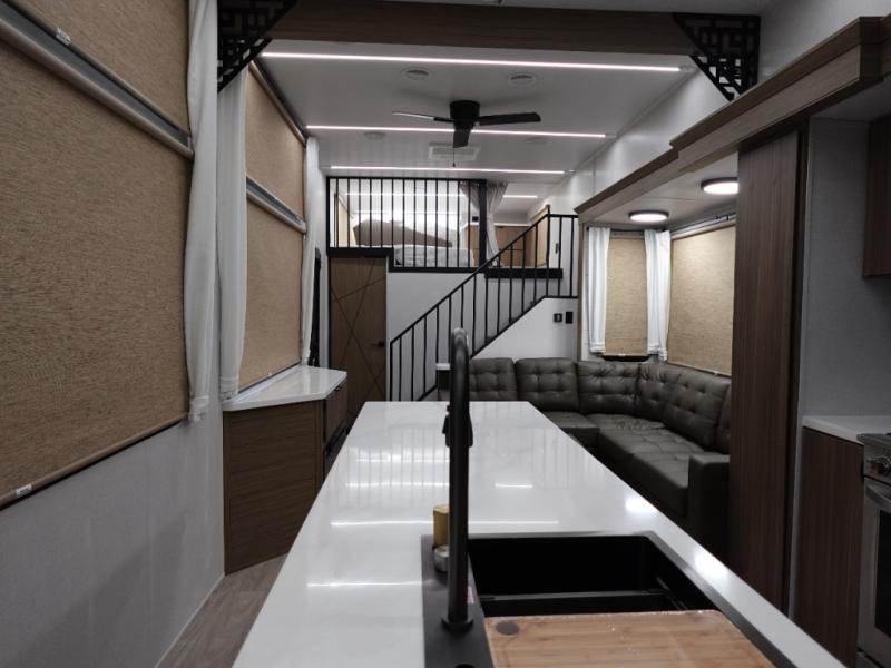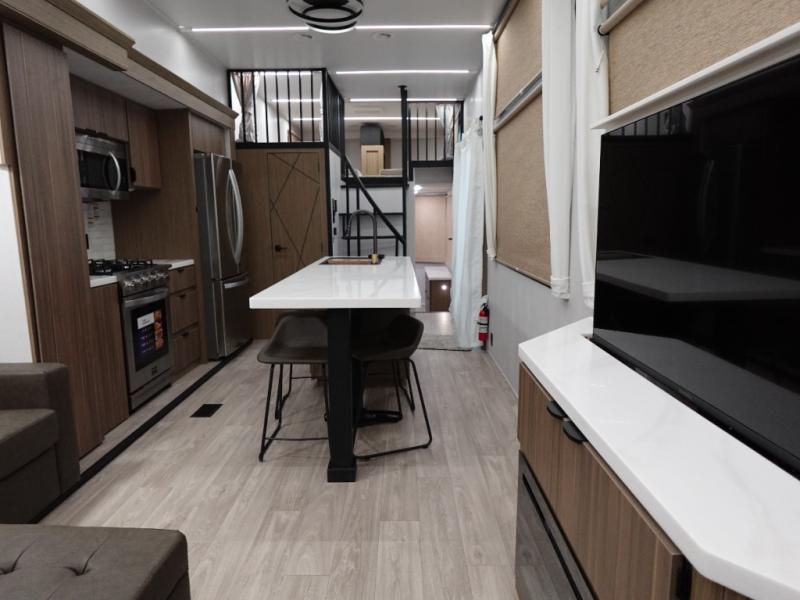 This 44ZEN trailer is designed to offer maximum comfort and space. It features two lofts that adds extra sleeping space, one includes a 62" x 74" Versa queen mattress and a dresser for personal items, while the second loft comes with a Versa queen bed, shelf and cabinet storage, and a table with recessed footing, perfect for remote work or study sessions. On the main floor, the rear full bathroom is fully equipped with a walk-in shower, linen closet, and washer/dryer prep. At the center we have a large sectional sofa invites everyone to gather, facing a fireplace and Televator TV, great for movie nights or relaxing. The kitchen island adds prep space but also doubles as a casual dining area with barstool seating. For added convenience, a half bath is tucked beside the second stairway, providing easy access if needed. Up front, the master bedroom offers a retreat with a king-size bed with Versa Tilt, a dresser for storage, and a wall of windows that provides a view of the scenery outside.