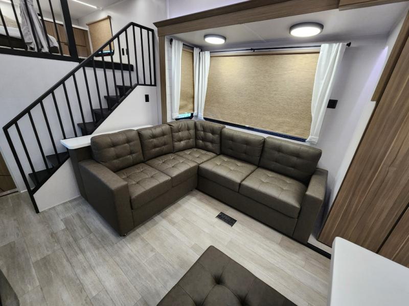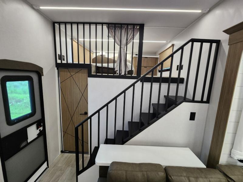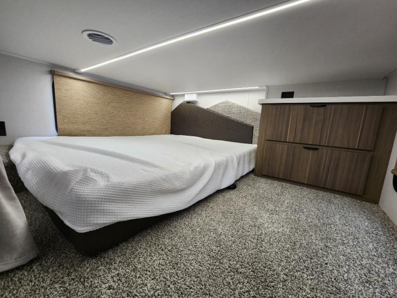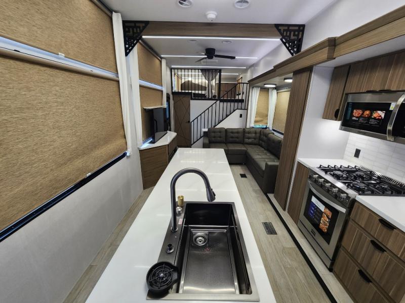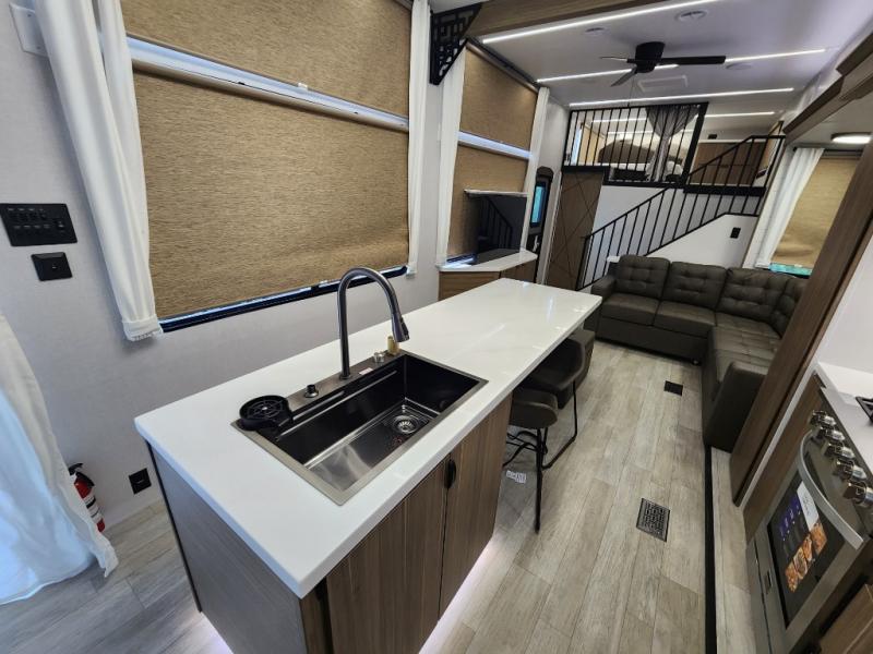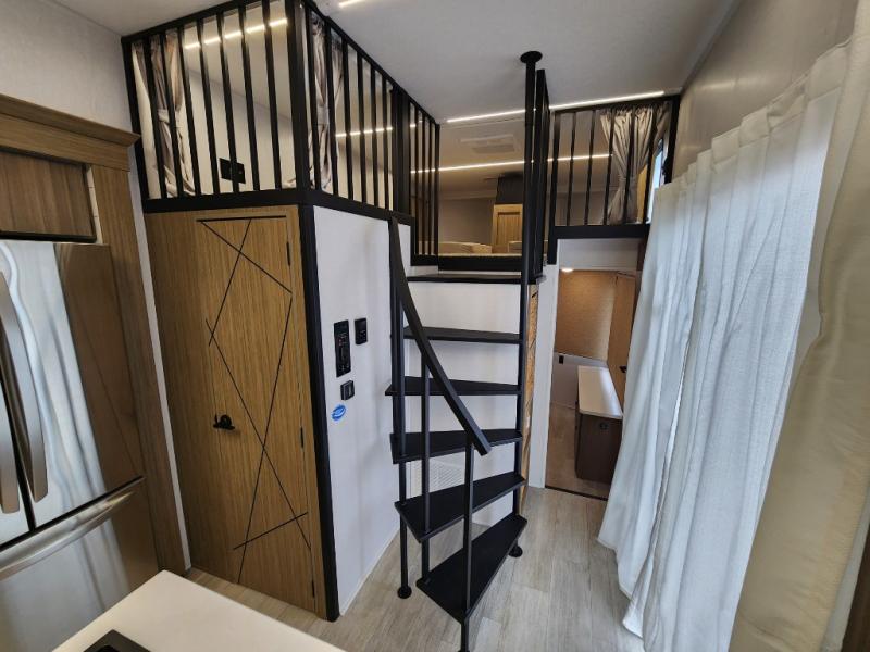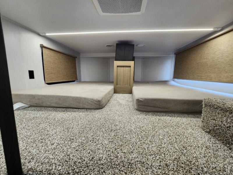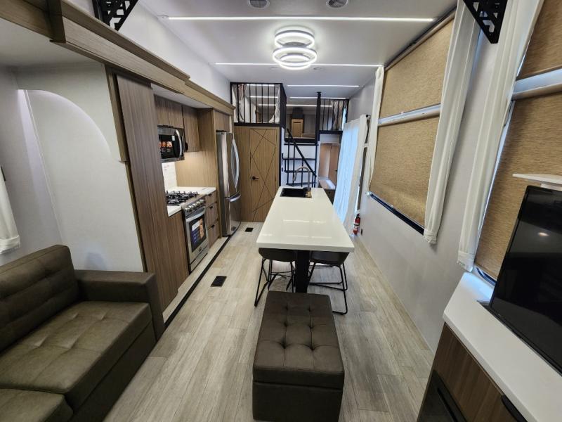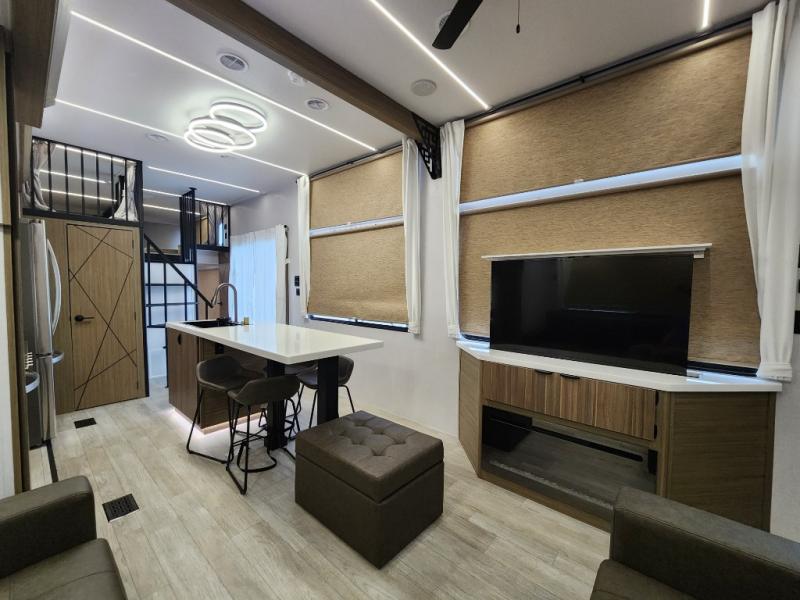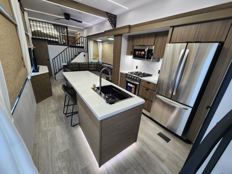 Your dream destination trailer awaits! The rear bathroom is a haven for convenience and comfort, featuring a spacious walk-in shower, a linen closet, and washer and dryer prep. The sectional sofa is a hub for socializing and relaxation, and the entertainment center with fireplace creates a warm and inviting ambiance. The ceiling fan adds a touch of elegance to the living area. The kitchen is well-equipped with a roll-out pantry, microwave, and side-by-side refrigerator, making meal prep and dining a breeze. Plus, the kitchen island with stools is perfect for casual meals or socializing. The half bath provides additional convenience for guests. The front bedroom is a serene retreat, featuring a custom king bed with VersaTilt, a stylish dresser, and plenty of storage space. Finishing with the loft area, which is perfect for kids or adults alike, with a versatile queen bunk mattress and two 42” x 74” bunk mats, providing ample sleeping space for family and friends