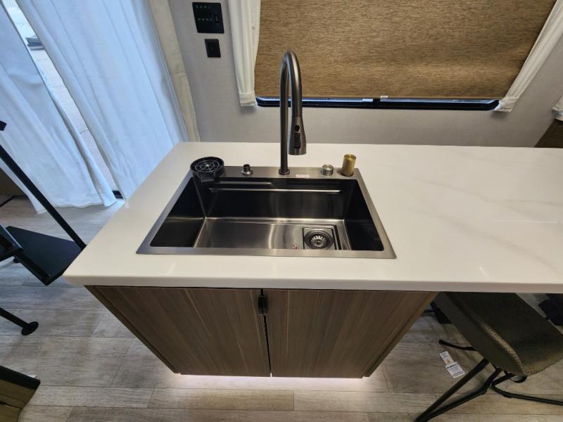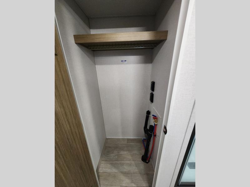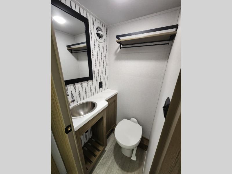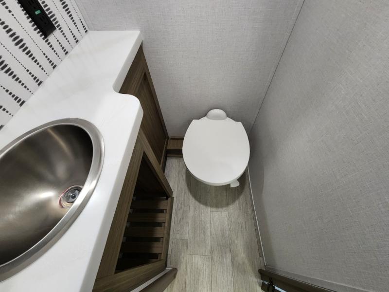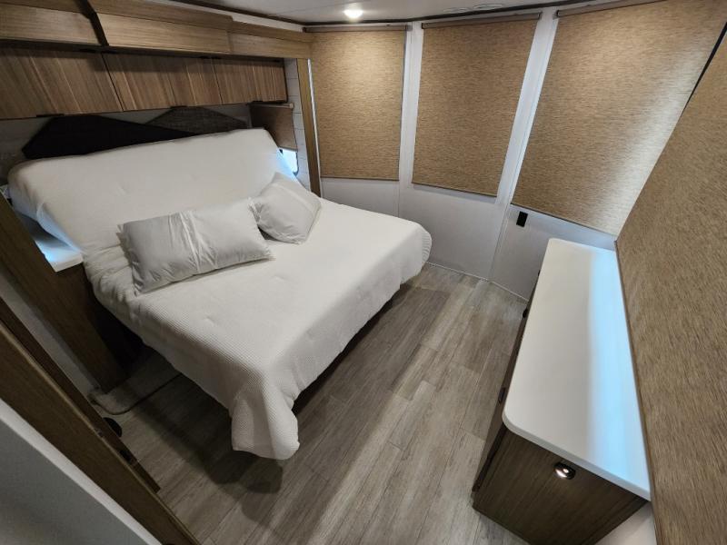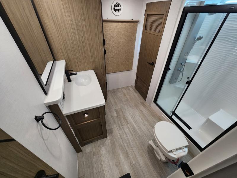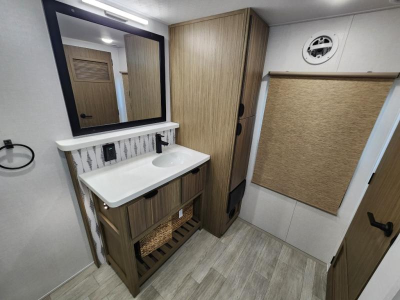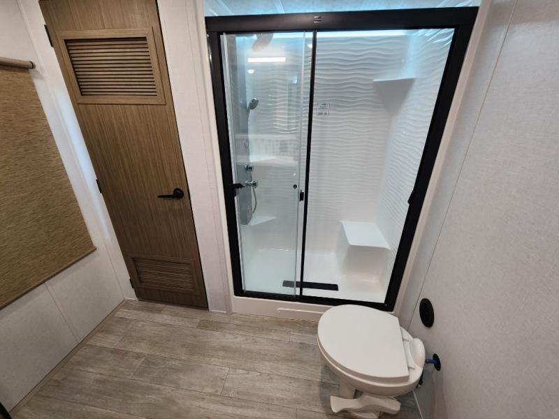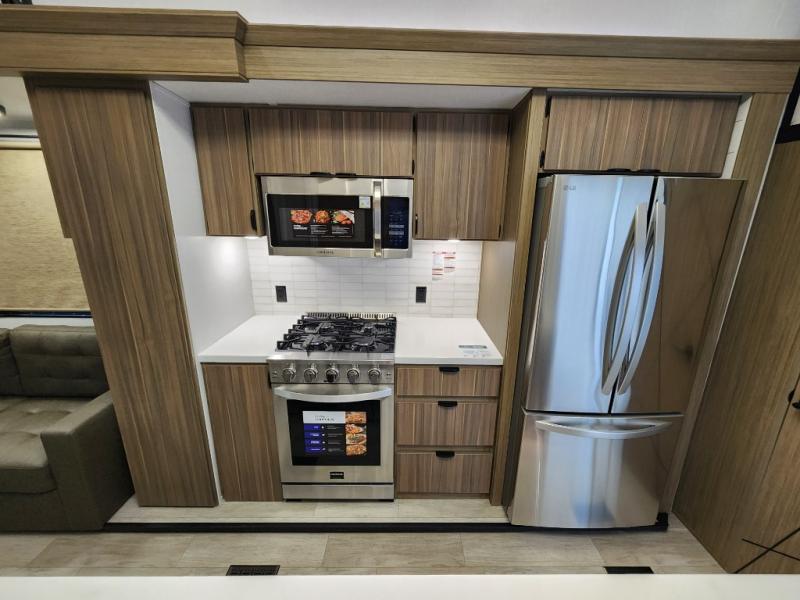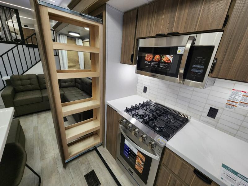 Your dream destination trailer awaits! The rear bathroom is a haven for convenience and comfort, featuring a spacious walk-in shower, a linen closet, and washer and dryer prep. The sectional sofa is a hub for socializing and relaxation, and the entertainment center with fireplace creates a warm and inviting ambiance. The ceiling fan adds a touch of elegance to the living area. The kitchen is well-equipped with a roll-out pantry, microwave, and side-by-side refrigerator, making meal prep and dining a breeze. Plus, the kitchen island with stools is perfect for casual meals or socializing. The half bath provides additional convenience for guests. The front bedroom is a serene retreat, featuring a custom king bed with VersaTilt, a stylish dresser, and plenty of storage space. Finishing with the loft area, which is perfect for kids or adults alike, with a versatile queen bunk mattress and two 42” x 74” bunk mats, providing ample sleeping space for family and friends