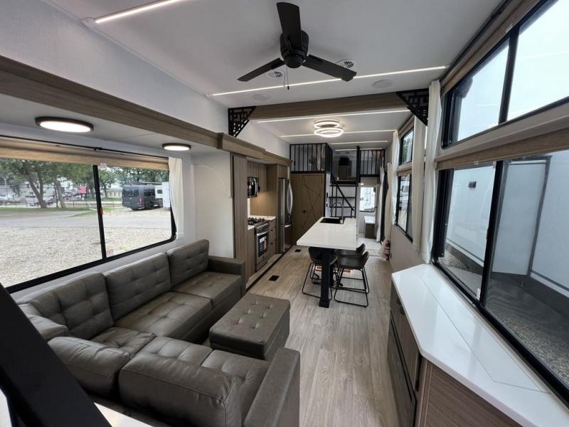 This 44ZEN trailer is designed to offer maximum comfort and space. It features two lofts that adds extra sleeping space, one includes a 62" x 74" Versa queen mattress and a dresser for personal items, while the second loft comes with a Versa queen bed, shelf and cabinet storage, and a table with recessed footing, perfect for remote work or study sessions. On the main floor, the rear full bathroom is fully equipped with a walk-in shower, linen closet, and washer/dryer prep. At the center we have a large sectional sofa invites everyone to gather, facing a fireplace and Televator TV, great for movie nights or relaxing. The kitchen island adds prep space but also doubles as a casual dining area with barstool seating. For added convenience, a half bath is tucked beside the second stairway, providing easy access if needed. Up front, the master bedroom offers a retreat with a king-size bed with Versa Tilt, a dresser for storage, and a wall of windows that provides a view of the scenery outside.