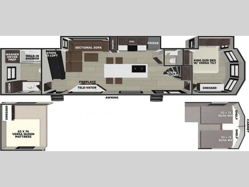 This 44ZEN trailer is designed to offer maximum comfort and space. It features two lofts that adds extra sleeping space, one includes a 62" x 74" Versa queen mattress and a dresser for personal items, while the second loft comes with a Versa queen bed, shelf and cabinet storage, and a table with recessed footing, perfect for remote work or study sessions. On the main floor, the rear full bathroom is fully equipped with a walk-in shower, linen closet, and washer/dryer prep. At the center we have a large sectional sofa invites everyone to gather, facing a fireplace and Televator TV, great for movie nights or relaxing. The kitchen island adds prep space but also doubles as a casual dining area with barstool seating. For added convenience, a half bath is tucked beside the second stairway, providing easy access if needed. Up front, the master bedroom offers a retreat with a king-size bed with Versa Tilt, a dresser for storage, and a wall of windows that provides a view of the scenery outside.