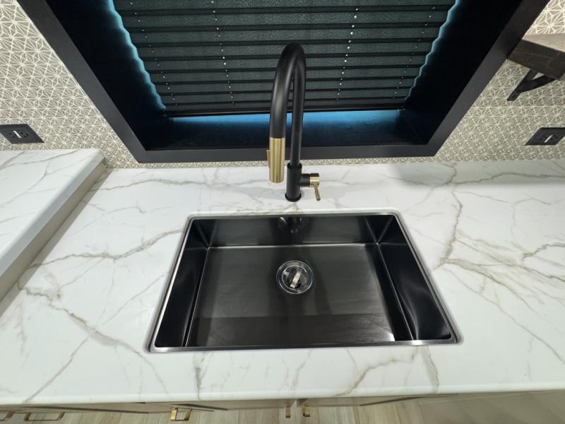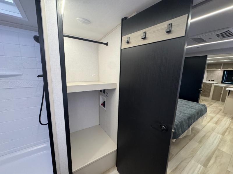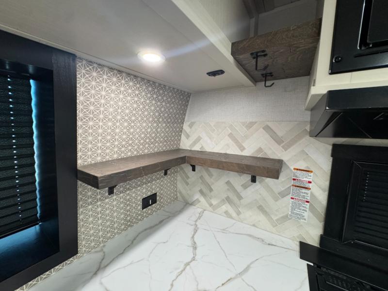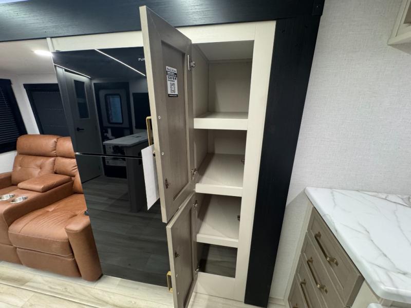 This is the perfect couple's trailer for weekend trips to the campground. The front kitchen includes ample counter space, including a bar top with two stools. You can relax on the theater seat within the slide out here, and the pantry and 12V refrigerator is close by so you can grab a snack. A master bedroom includes a custom king bed slide out, a panoramic window, an ottoman, plus a dresser with a fireplace to make your space cozy. The full rear bath includes dual bath sinks, a walk-in shower with a skylight, plus washer and dryer connections if you want to add those appliances.