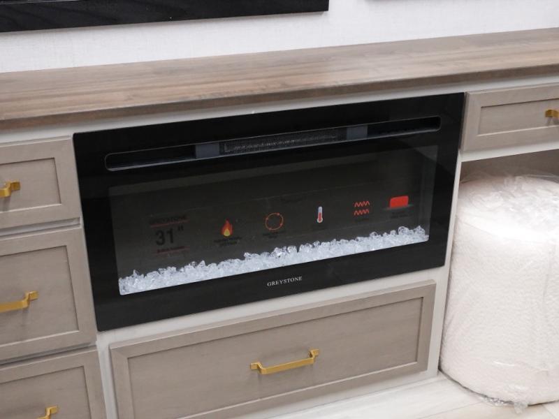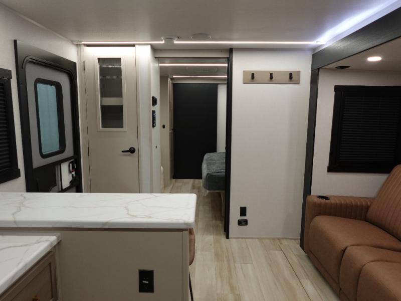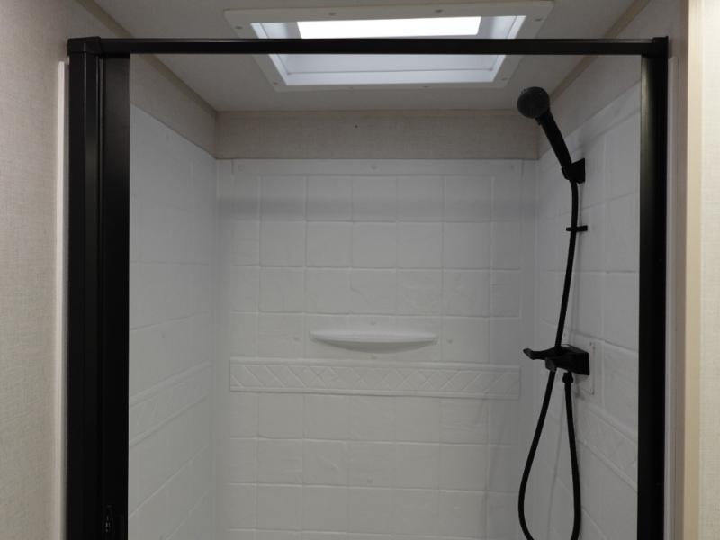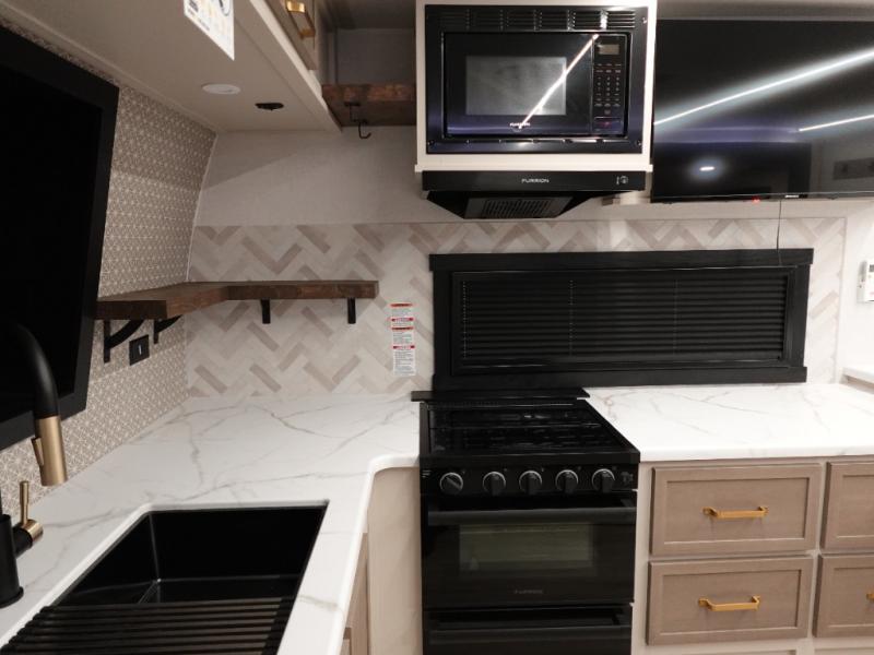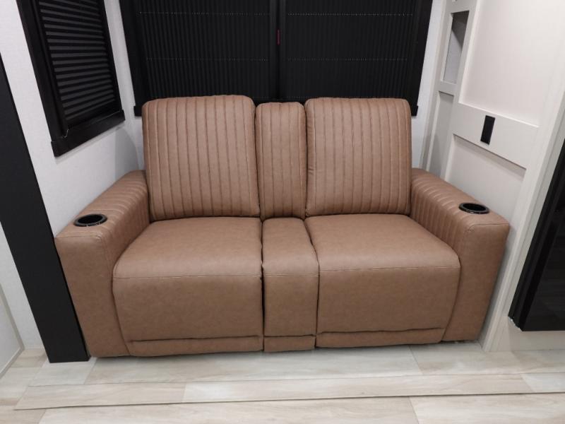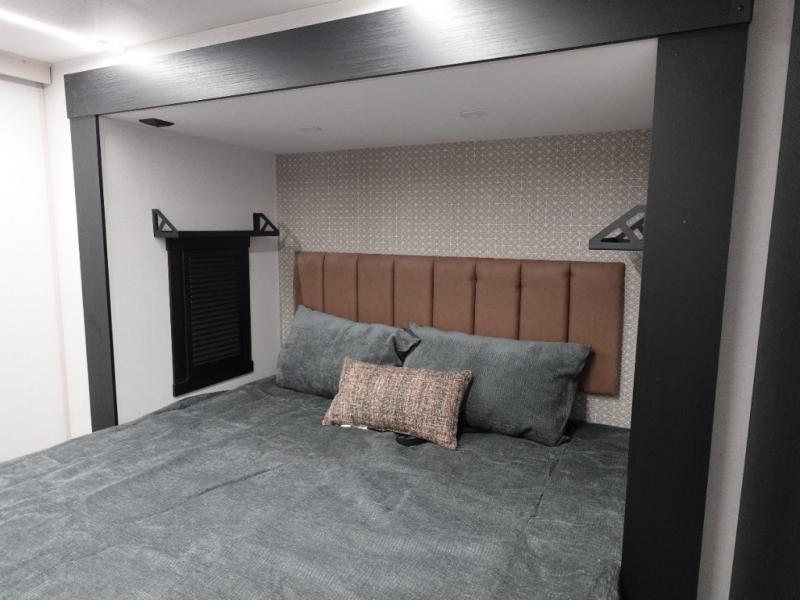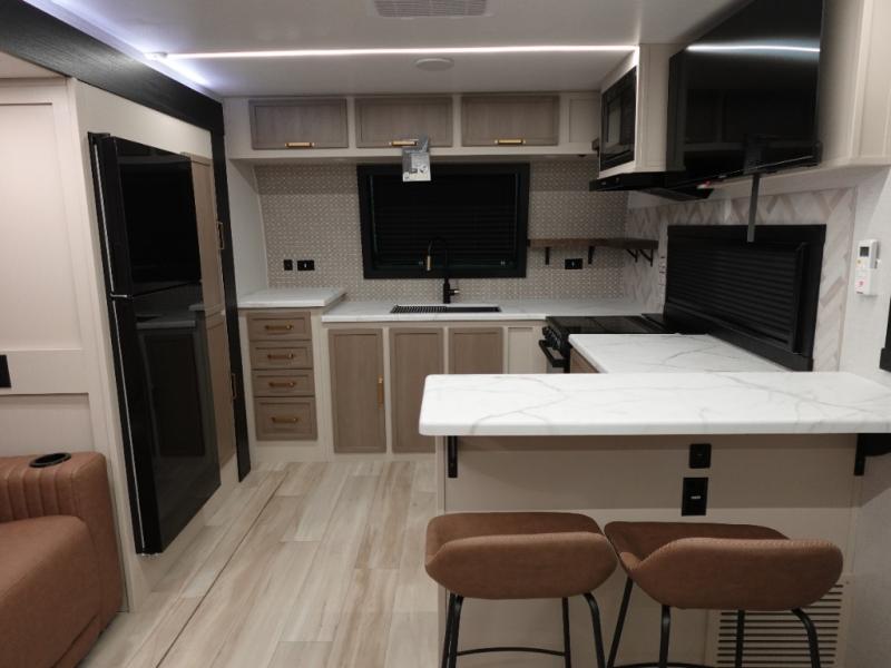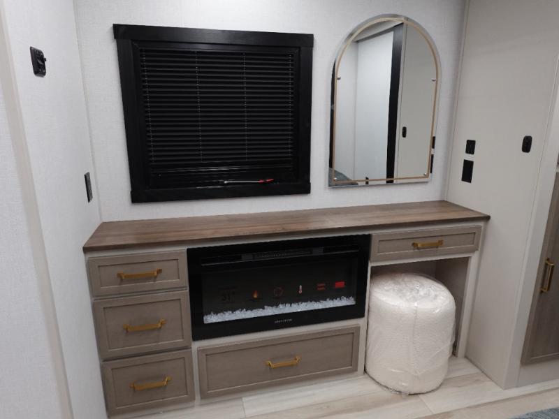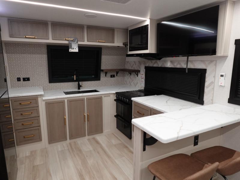 This is the perfect couple's trailer for weekend trips to the campground. The front kitchen includes ample counter space, including a bar top with two stools. You can relax on the theater seat within the slide out here, and the pantry and 12V refrigerator is close by so you can grab a snack. A master bedroom includes a custom king bed slide out, a panoramic window, an ottoman, plus a dresser with a fireplace to make your space cozy. The full rear bath includes dual bath sinks, a walk-in shower with a skylight, plus washer and dryer connections if you want to add those appliances.