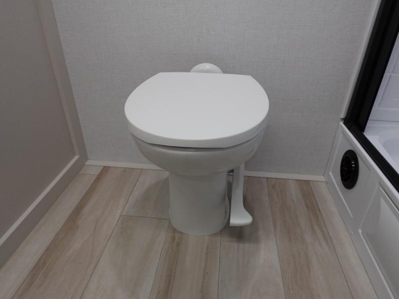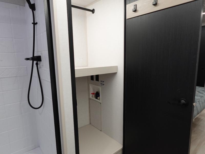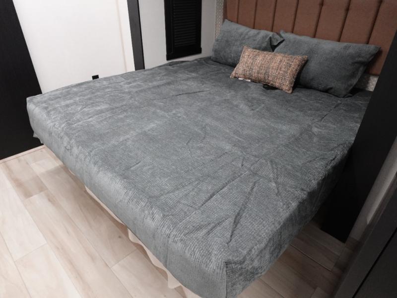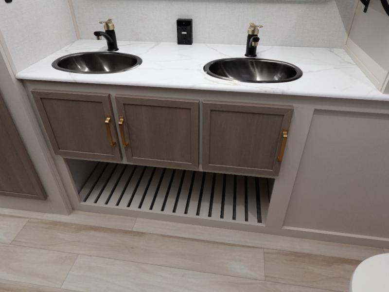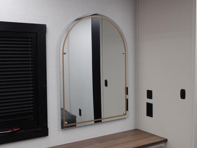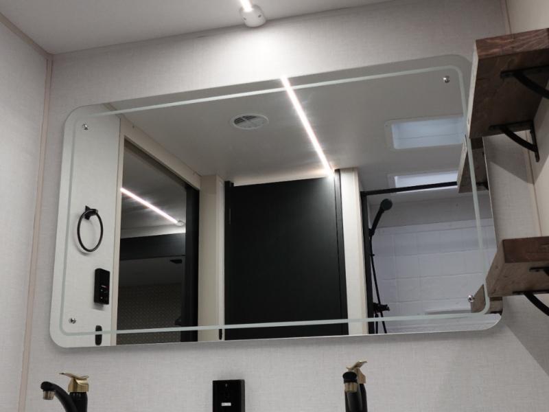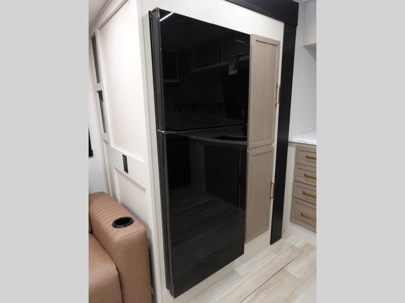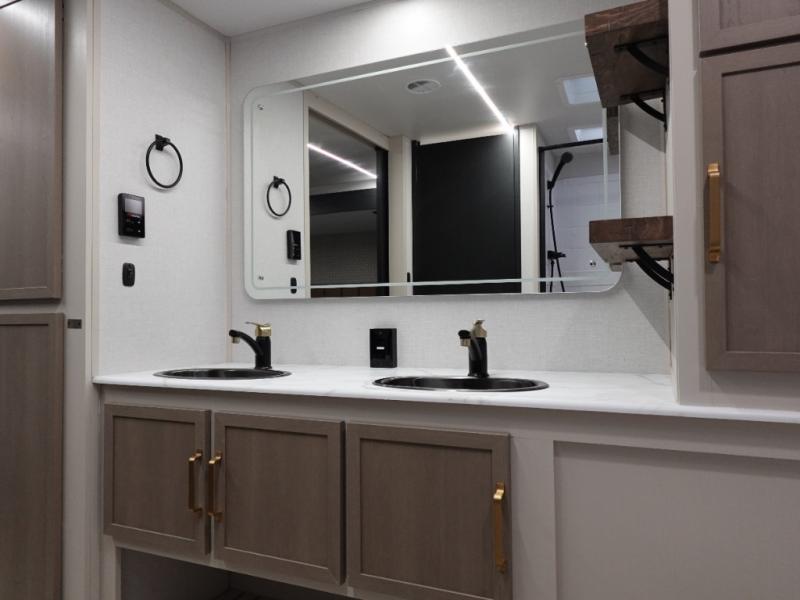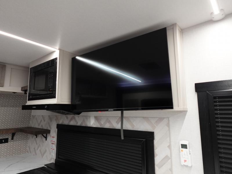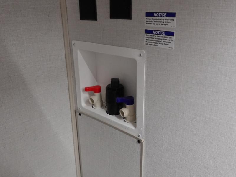 This is the perfect couple's trailer for weekend trips to the campground. The front kitchen includes ample counter space, including a bar top with two stools. You can relax on the theater seat within the slide out here, and the pantry and 12V refrigerator is close by so you can grab a snack. A master bedroom includes a custom king bed slide out, a panoramic window, an ottoman, plus a dresser with a fireplace to make your space cozy. The full rear bath includes dual bath sinks, a walk-in shower with a skylight, plus washer and dryer connections if you want to add those appliances.