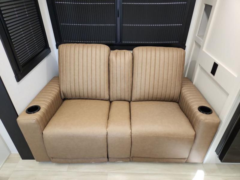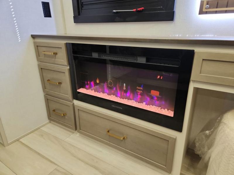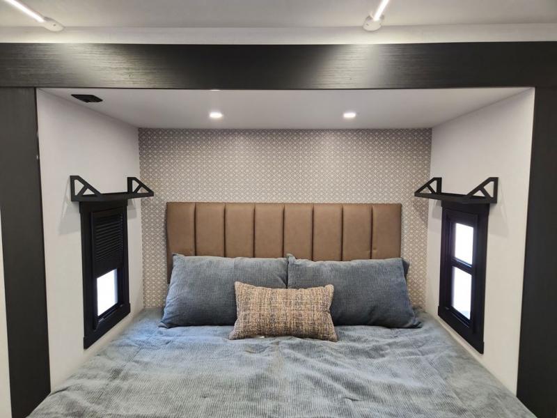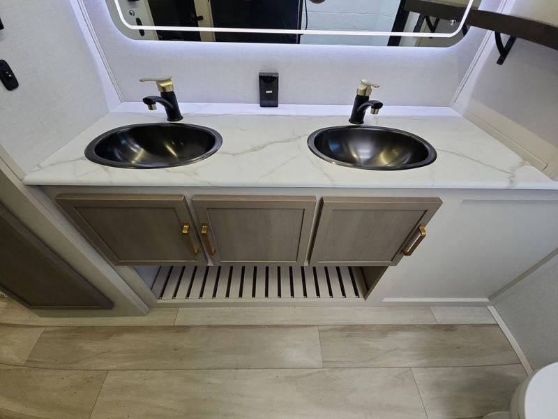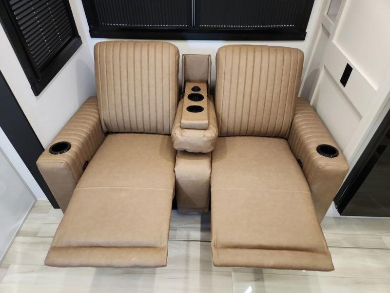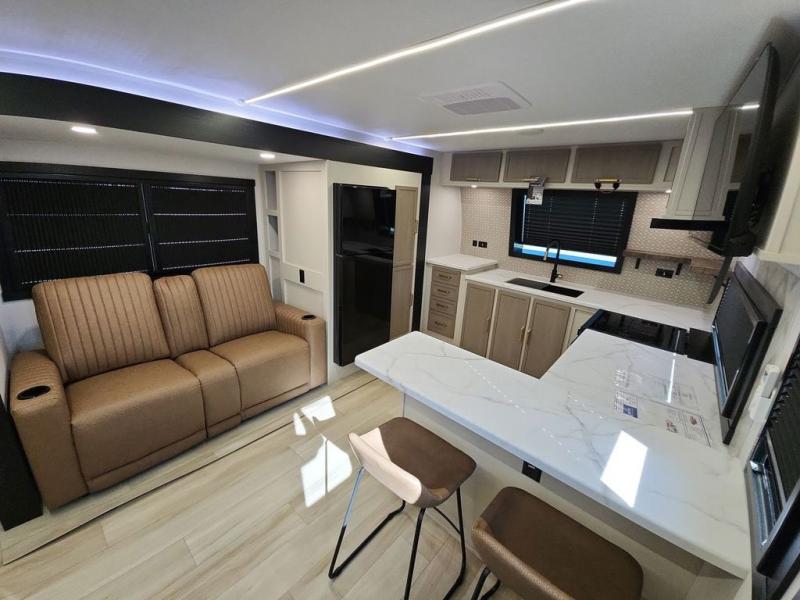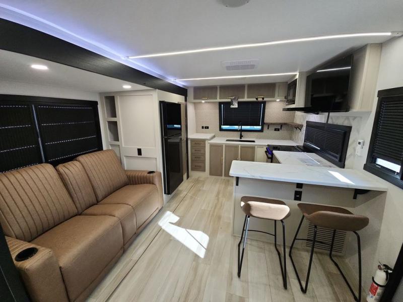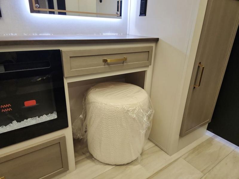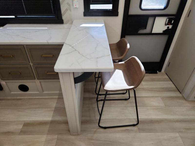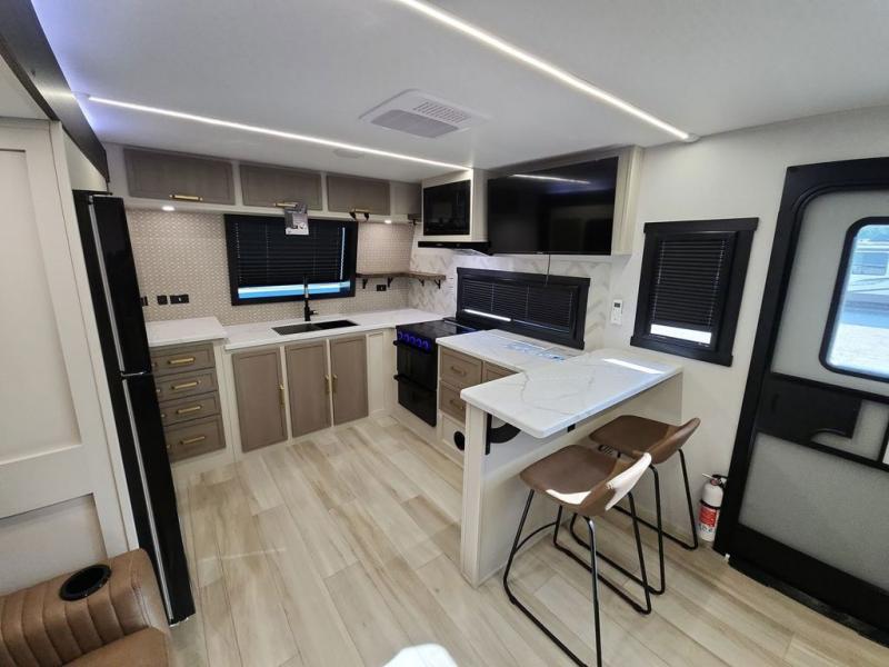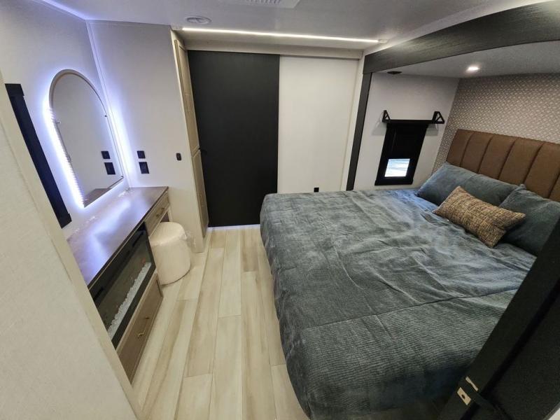 This is the perfect couple's trailer for weekend trips to the campground. The front kitchen includes ample counter space, including a bar top with two stools. You can relax on the theater seat within the slide out here, and the pantry and 12V refrigerator is close by so you can grab a snack. A master bedroom includes a custom king bed slide out, a panoramic window, an ottoman, plus a dresser with a fireplace to make your space cozy. The full rear bath includes dual bath sinks, a walk-in shower with a skylight, plus washer and dryer connections if you want to add those appliances.