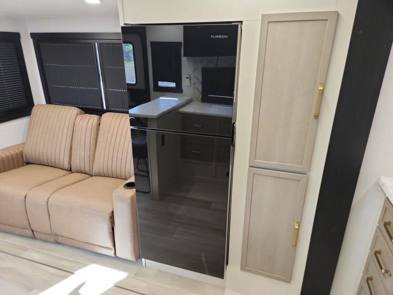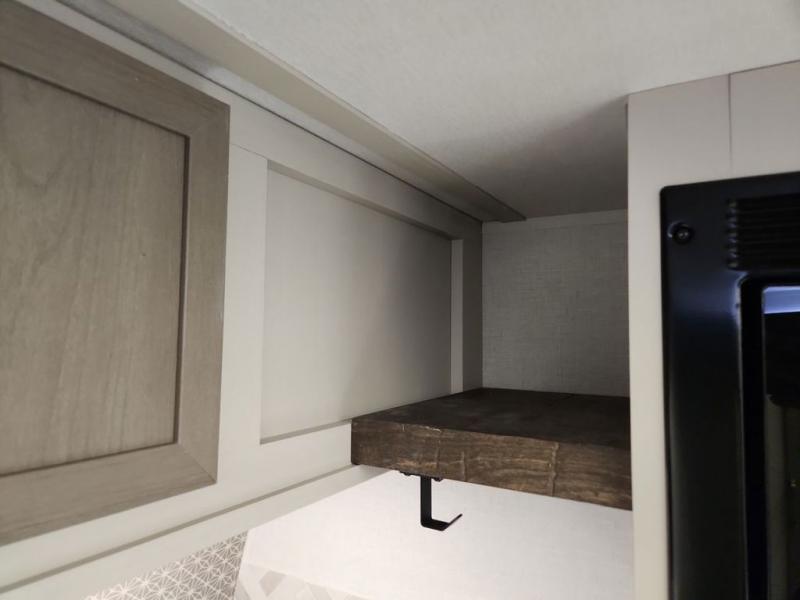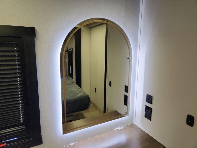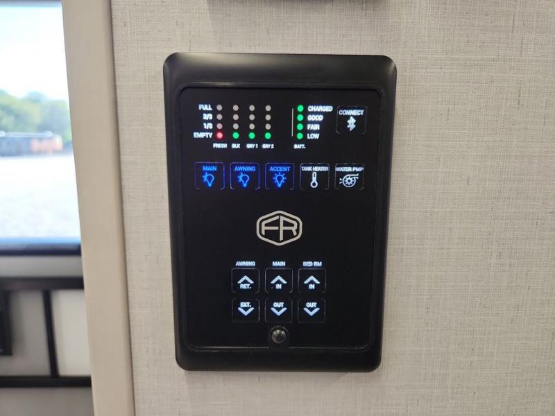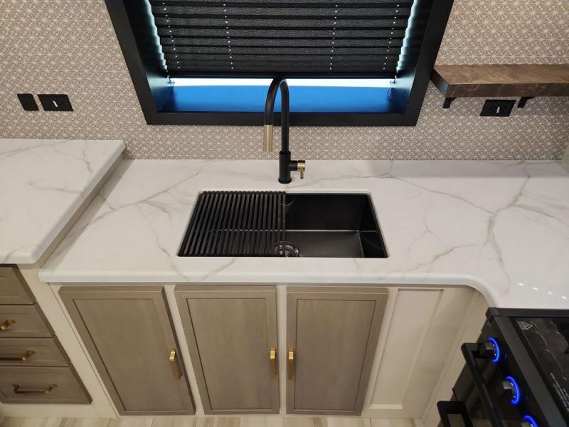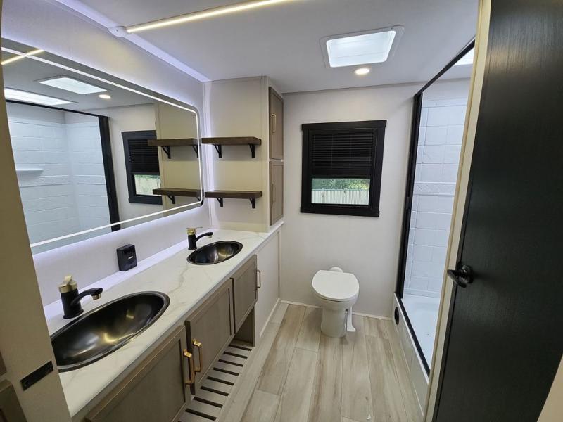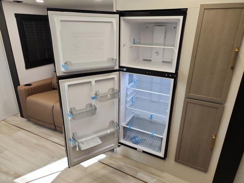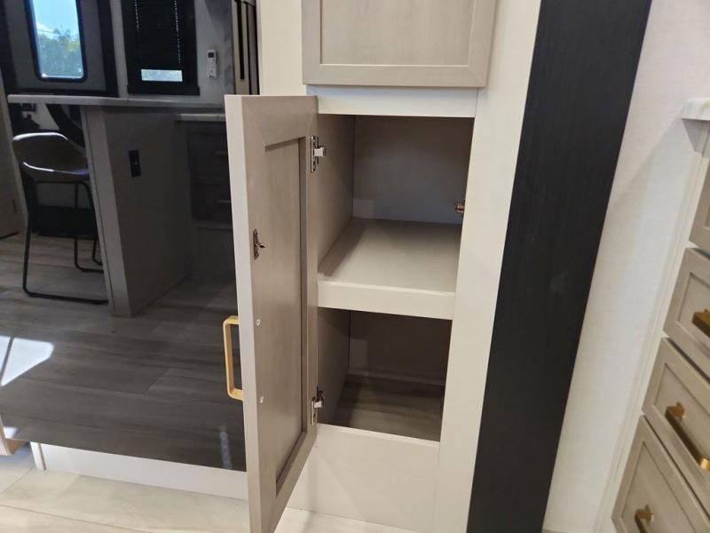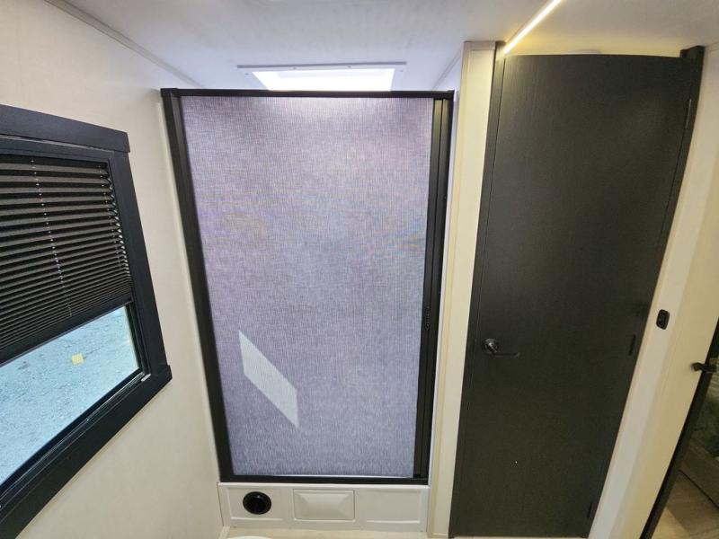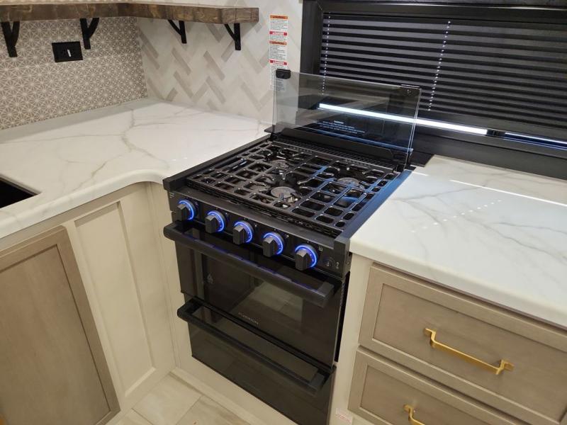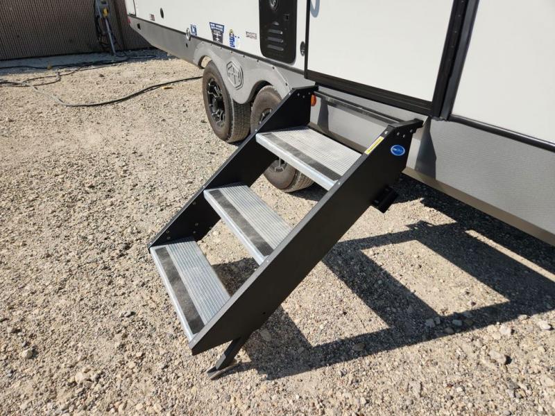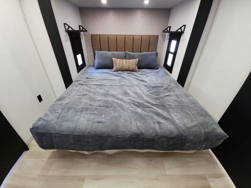 This is the perfect couple's trailer for weekend trips to the campground. The front kitchen includes ample counter space, including a bar top with two stools. You can relax on the theater seat within the slide out here, and the pantry and 12V refrigerator is close by so you can grab a snack. A master bedroom includes a custom king bed slide out, a panoramic window, an ottoman, plus a dresser with a fireplace to make your space cozy. The full rear bath includes dual bath sinks, a walk-in shower with a skylight, plus washer and dryer connections if you want to add those appliances.