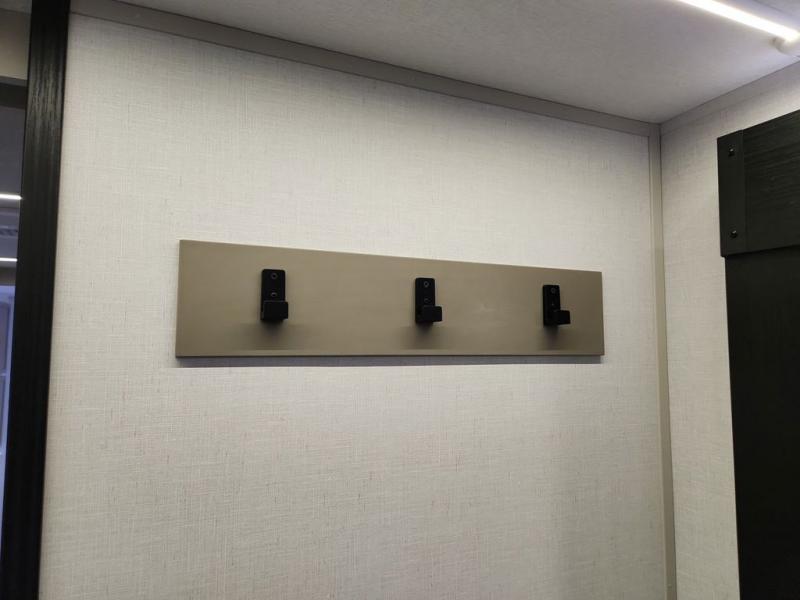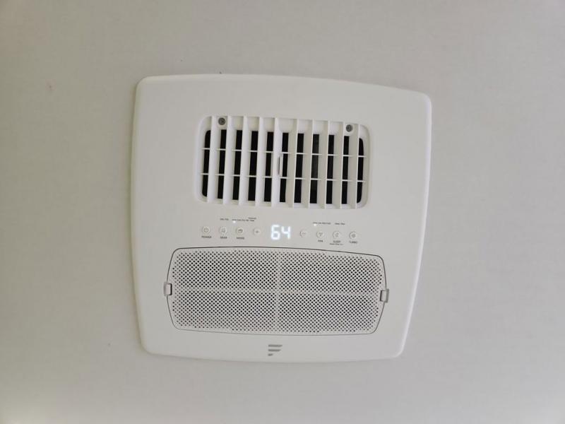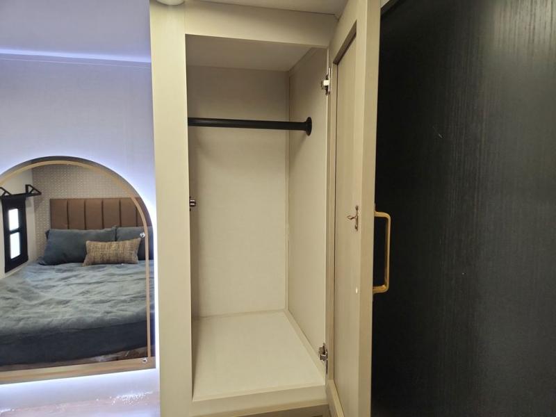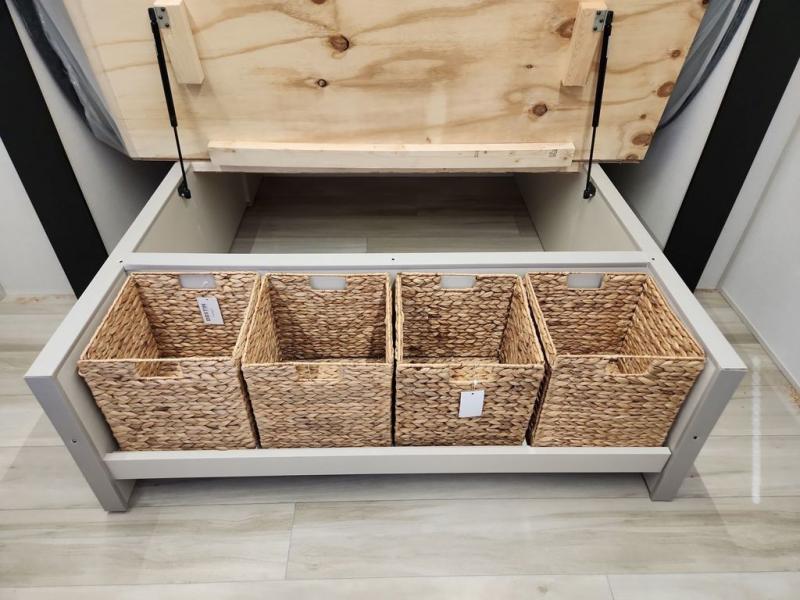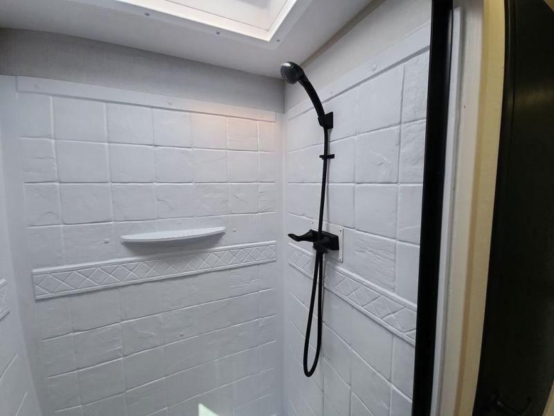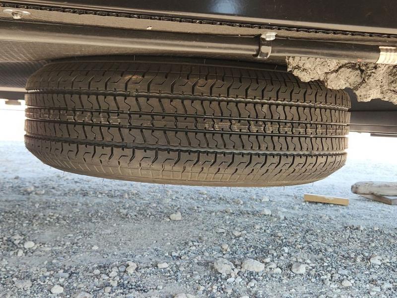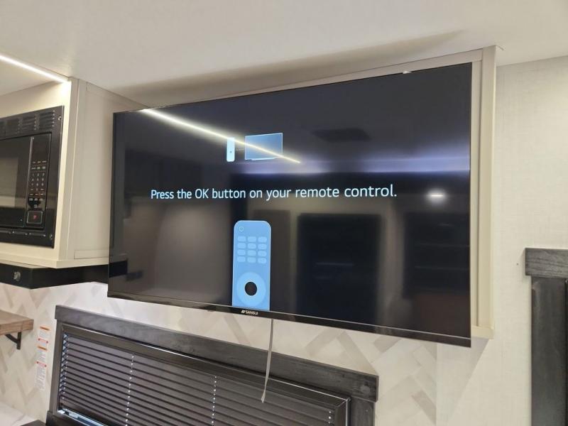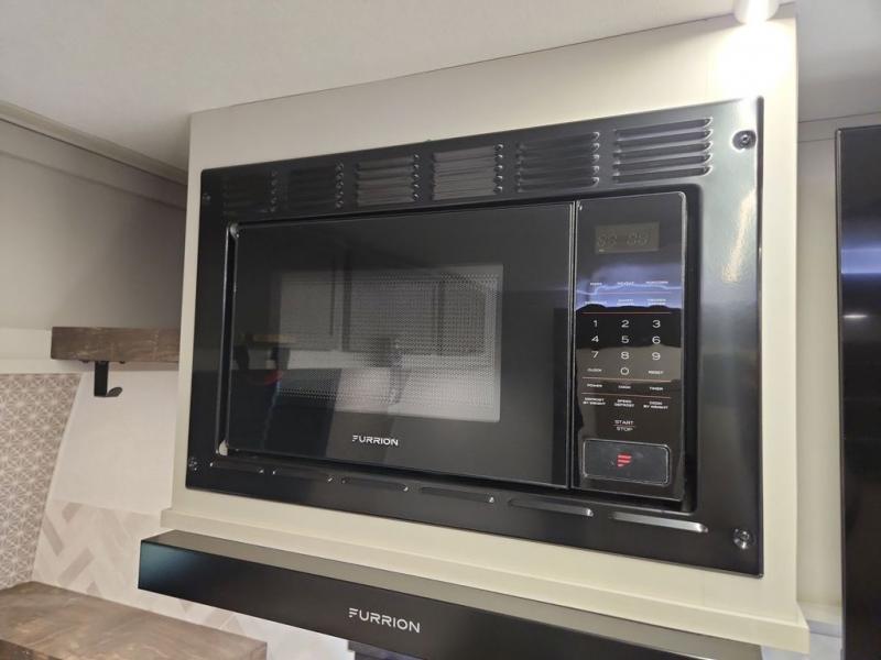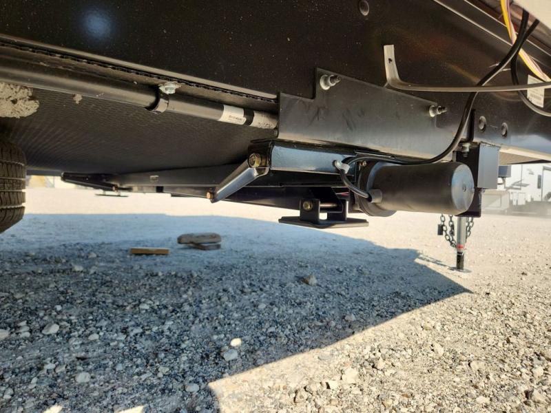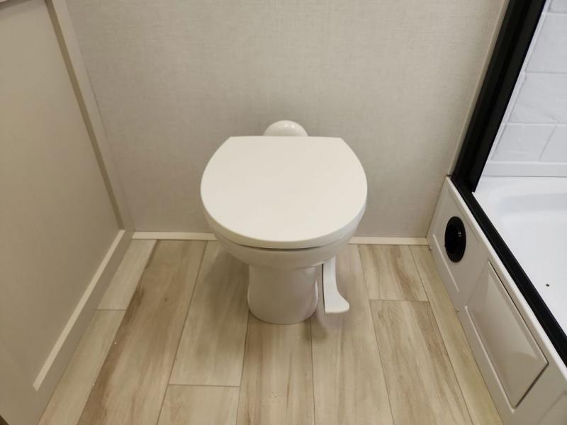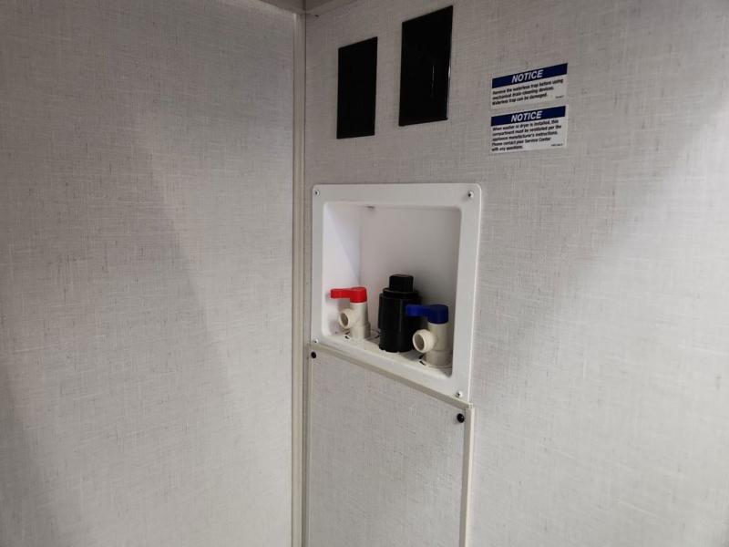 This is the perfect couple's trailer for weekend trips to the campground. The front kitchen includes ample counter space, including a bar top with two stools. You can relax on the theater seat within the slide out here, and the pantry and 12V refrigerator is close by so you can grab a snack. A master bedroom includes a custom king bed slide out, a panoramic window, an ottoman, plus a dresser with a fireplace to make your space cozy. The full rear bath includes dual bath sinks, a walk-in shower with a skylight, plus washer and dryer connections if you want to add those appliances.