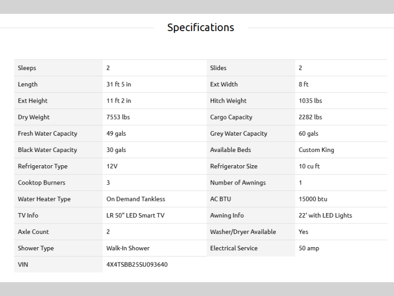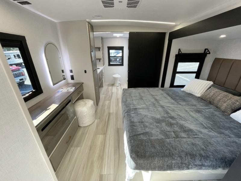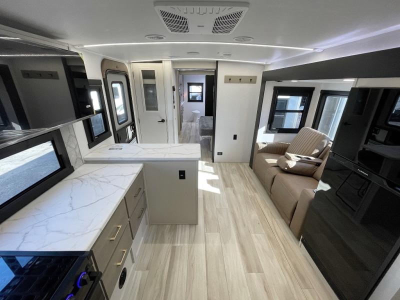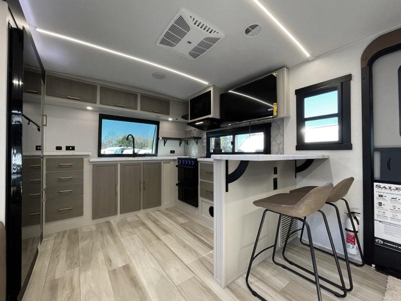 This is the perfect couple's trailer for weekend trips to the campground. The front kitchen includes ample counter space, including a bar top with two stools. You can relax on the theater seat within the slide out here, and the pantry and 12V refrigerator is close by so you can grab a snack. A master bedroom includes a custom king bed slide out, a panoramic window, an ottoman, plus a dresser with a fireplace to make your space cozy. The full rear bath includes dual bath sinks, a walk-in shower with a skylight, plus washer and dryer connections if you want to add those appliances.