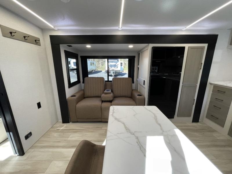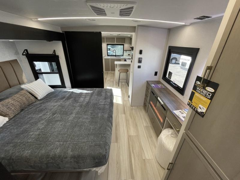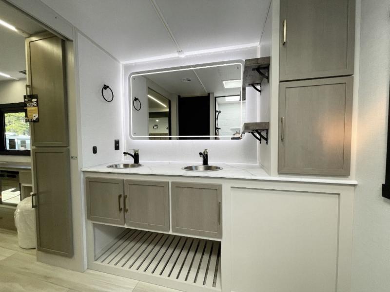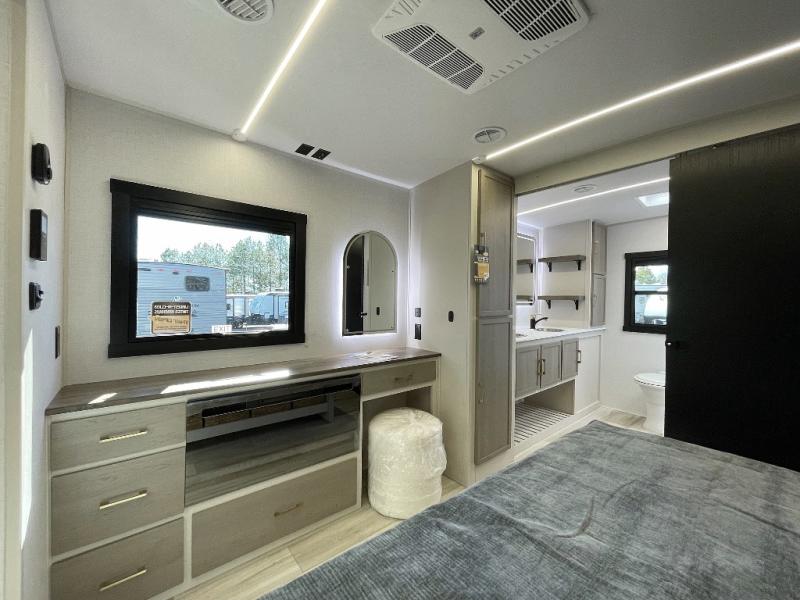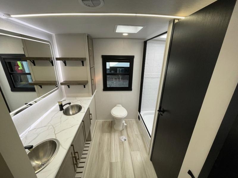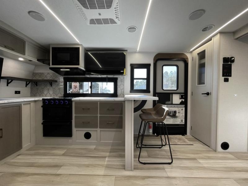 This is the perfect couple's trailer for weekend trips to the campground. The front kitchen includes ample counter space, including a bar top with two stools. You can relax on the theater seat within the slide out here, and the pantry and 12V refrigerator is close by so you can grab a snack. A master bedroom includes a custom king bed slide out, a panoramic window, an ottoman, plus a dresser with a fireplace to make your space cozy. The full rear bath includes dual bath sinks, a walk-in shower with a skylight, plus washer and dryer connections if you want to add those appliances.