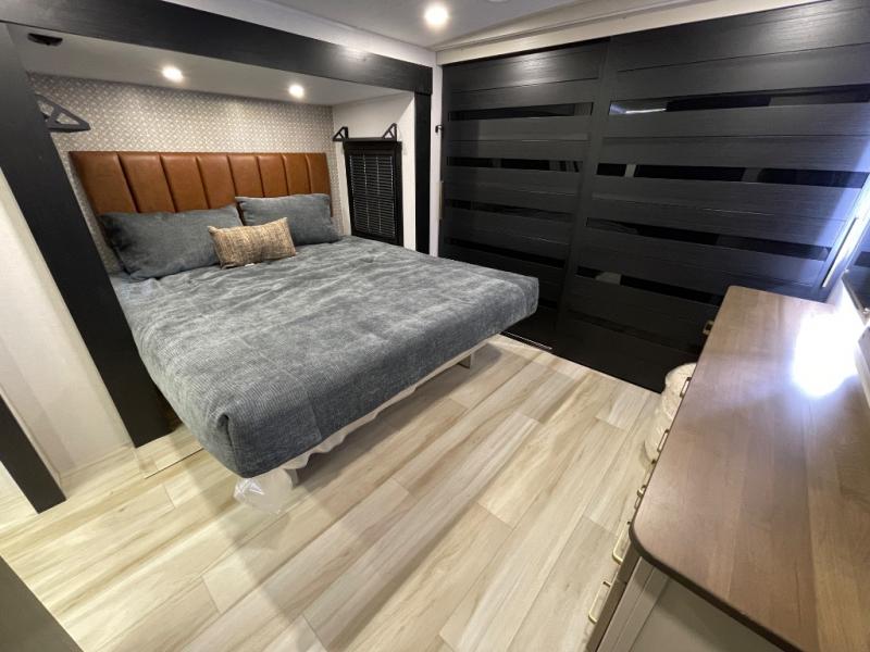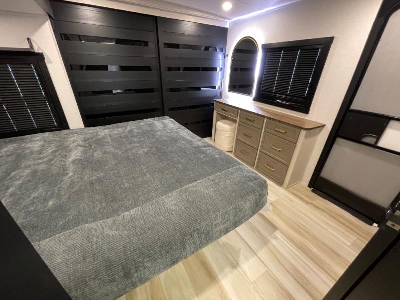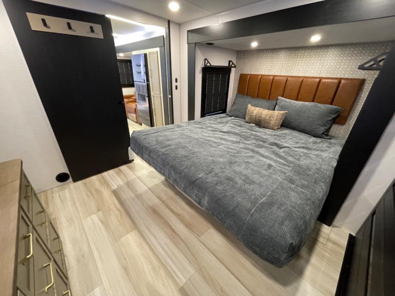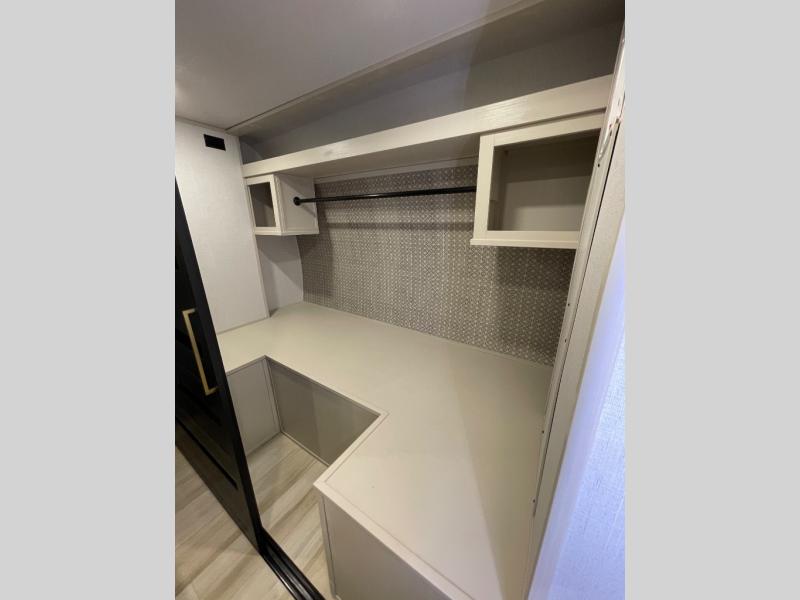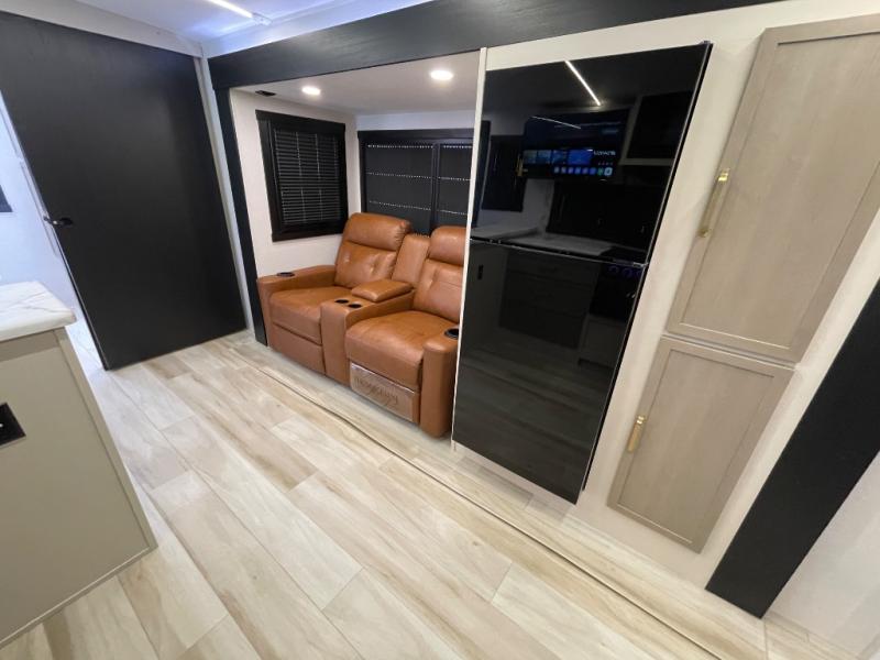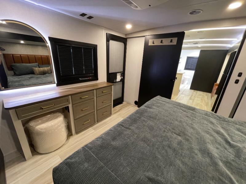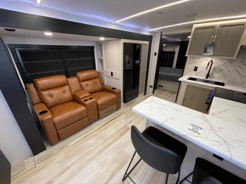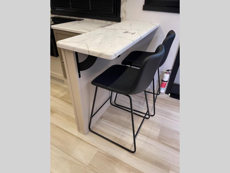 This is the perfect couple's trailer for weekend trips to the campground. The middle kitchen includes ample counter space with two stools where you can enjoy your breakfast at. You can relax on the theater seat within the slide out here, and the pantry and 12V refrigerator is close by so you can grab a snack. A front private bedroom includes a king bed slide out, a large front wardrobe with washer and dryer prep, a dresser, and a vanity with an ottoman. The full rear bath includes dual bath sinks, a walk-in shower with a skylights, and a linen closet to keep towels close by.