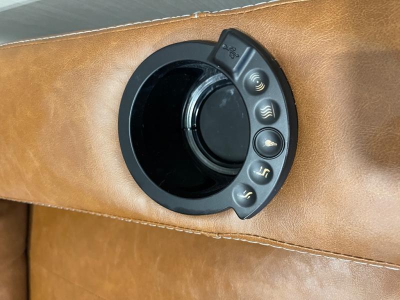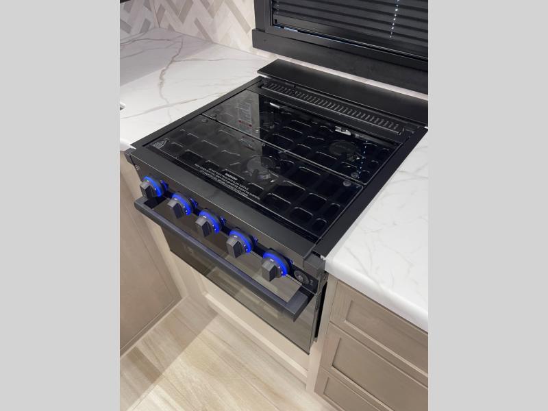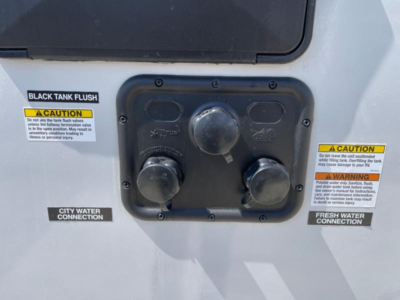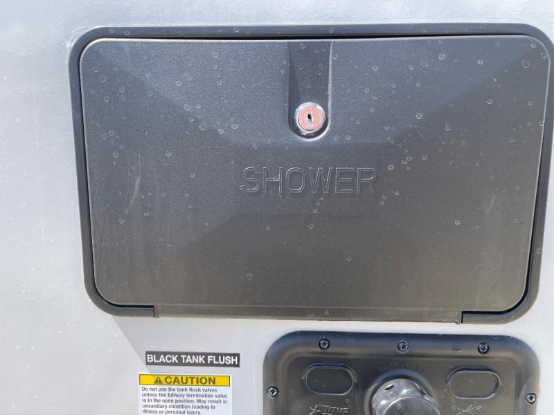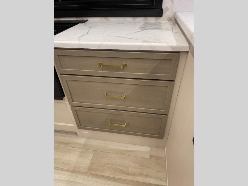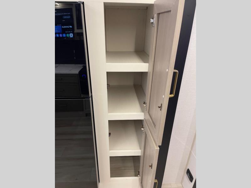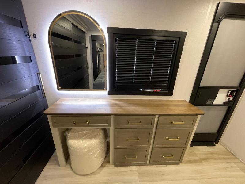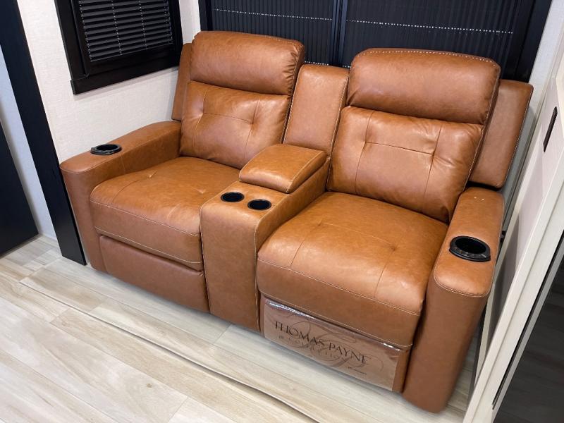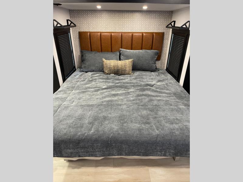 This is the perfect couple's trailer for weekend trips to the campground. The middle kitchen includes ample counter space with two stools where you can enjoy your breakfast at. You can relax on the theater seat within the slide out here, and the pantry and 12V refrigerator is close by so you can grab a snack. A front private bedroom includes a king bed slide out, a large front wardrobe with washer and dryer prep, a dresser, and a vanity with an ottoman. The full rear bath includes dual bath sinks, a walk-in shower with a skylights, and a linen closet to keep towels close by.
