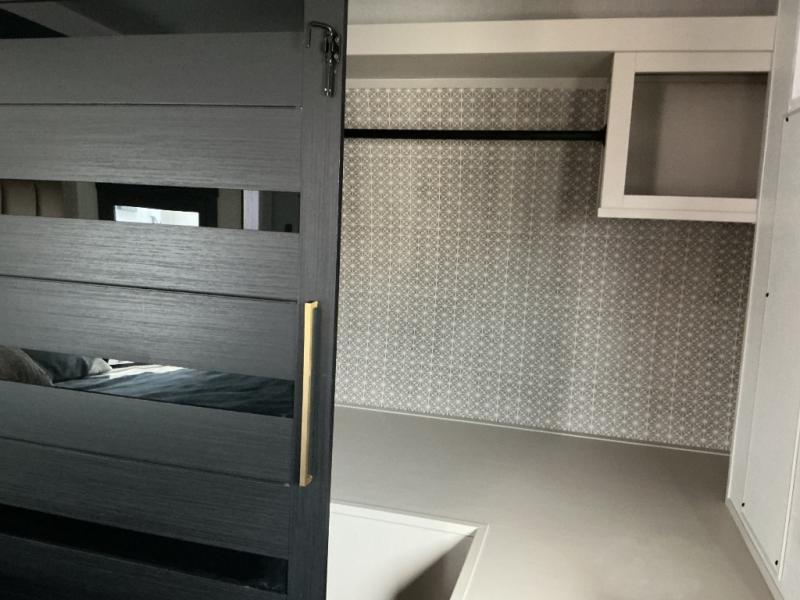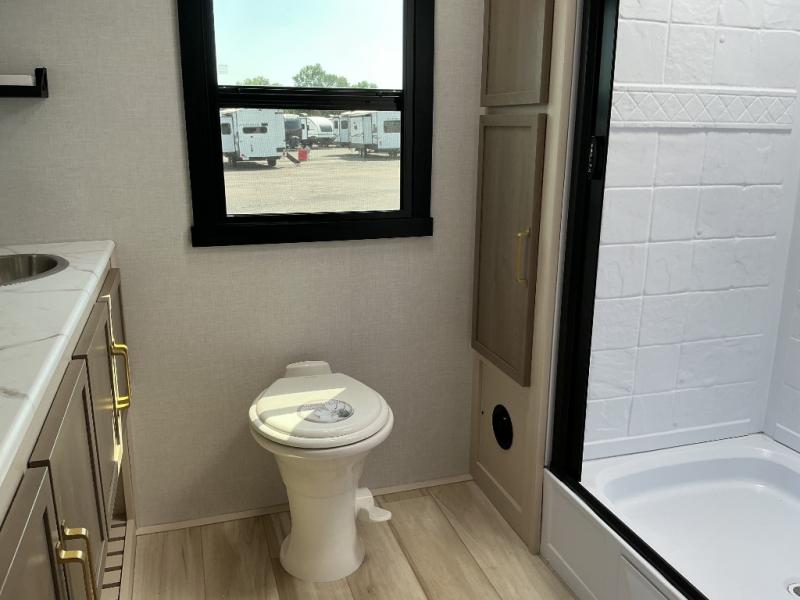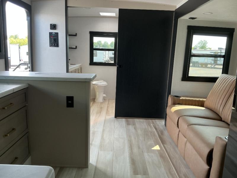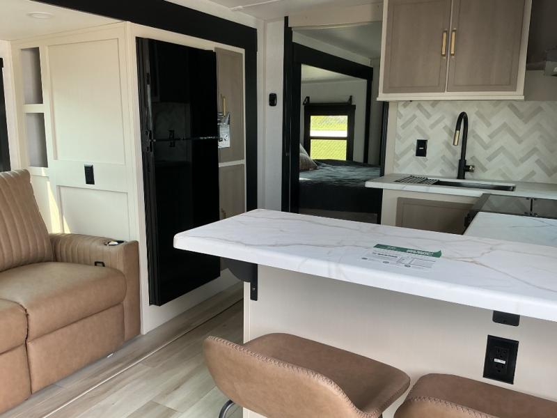 This is the perfect couple's trailer for weekend trips to the campground. The middle kitchen includes ample counter space with two stools where you can enjoy your breakfast at. You can relax on the theater seat within the slide out here, and the pantry and 12V refrigerator is close by so you can grab a snack. A front private bedroom includes a king bed slide out, a large front wardrobe with washer and dryer prep, a dresser, and a vanity with an ottoman. The full rear bath includes dual bath sinks, a walk-in shower with a skylights, and a linen closet to keep towels close by.