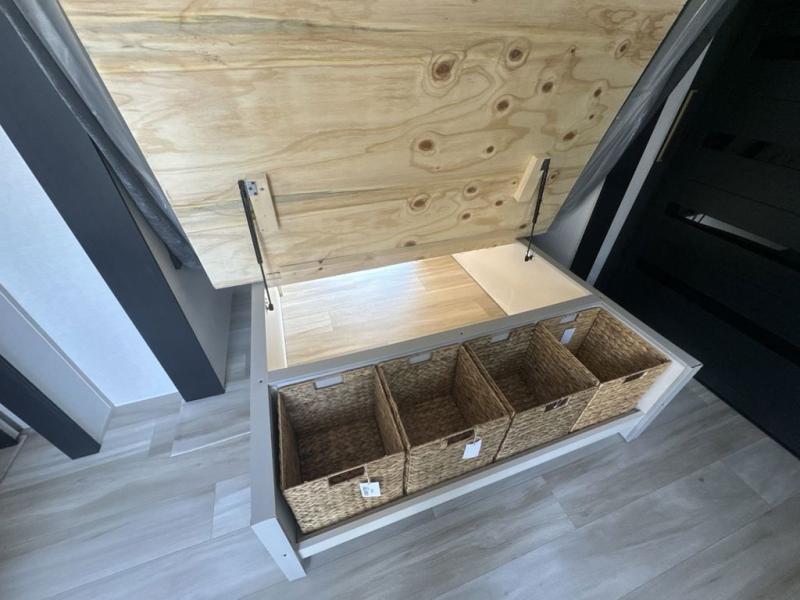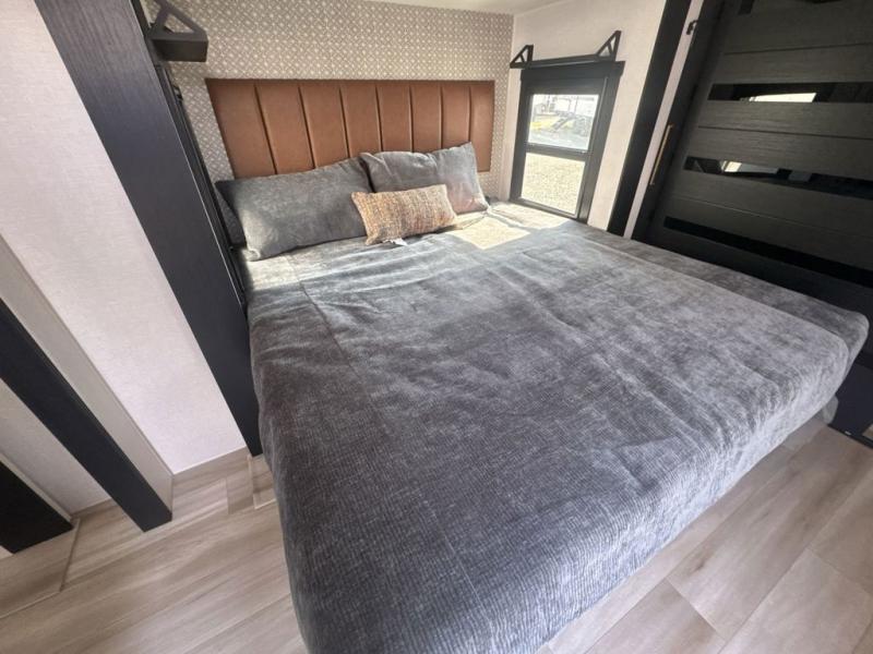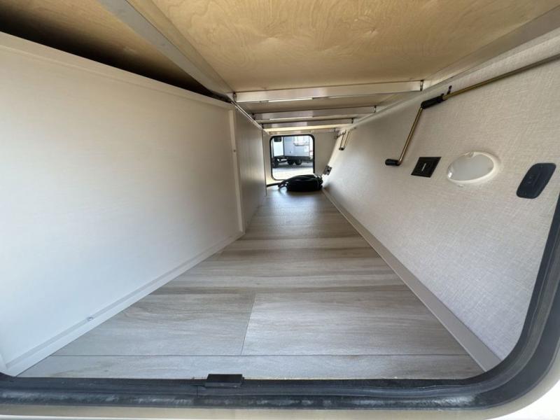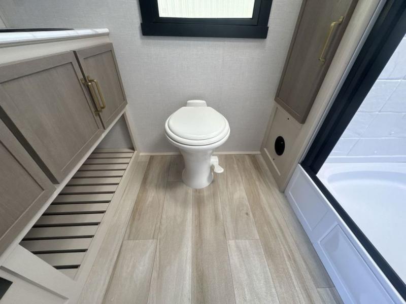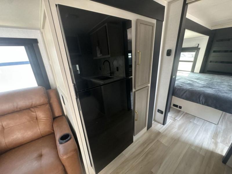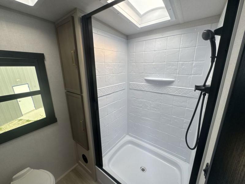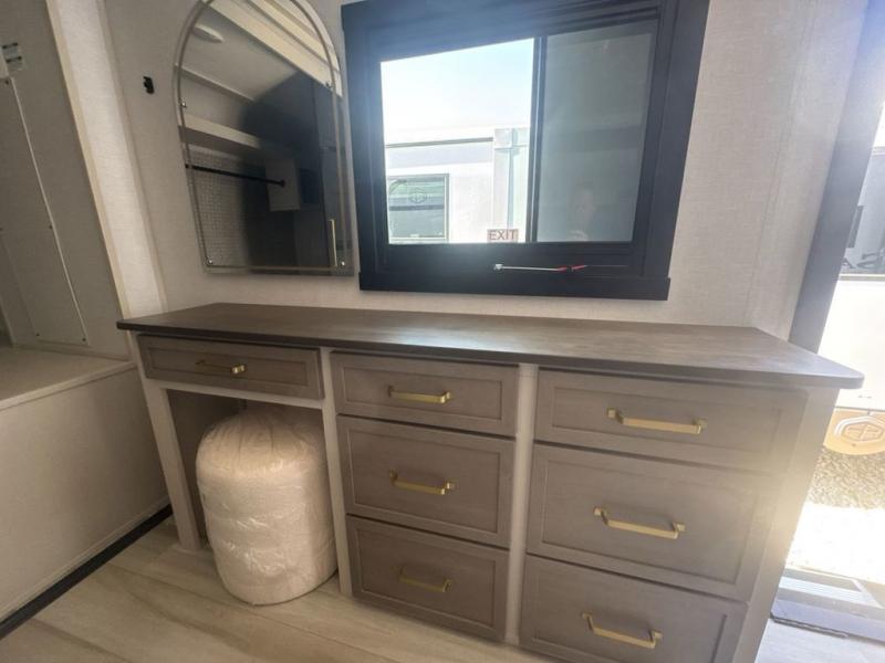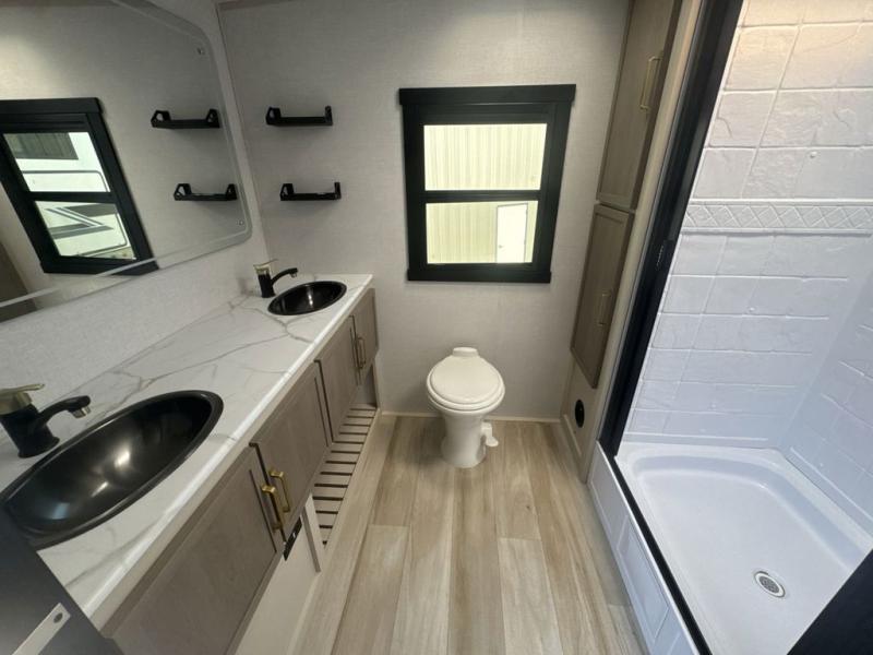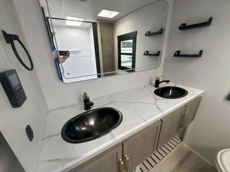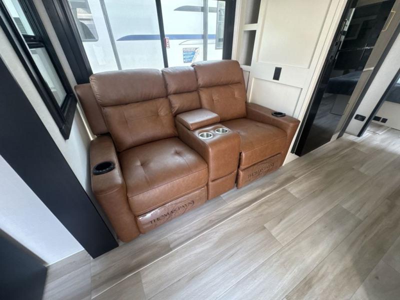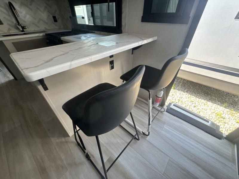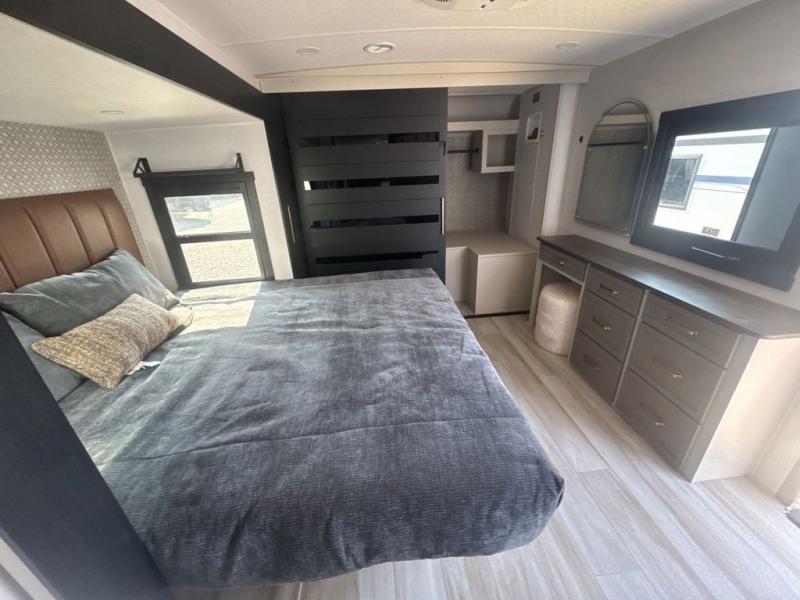 This is the perfect couple's trailer for weekend trips to the campground. The middle kitchen includes ample counter space with two stools where you can enjoy your breakfast at. You can relax on the theater seat within the slide out here, and the pantry and 12V refrigerator is close by so you can grab a snack. A front private bedroom includes a king bed slide out, a large front wardrobe with washer and dryer prep, a dresser, and a vanity with an ottoman. The full rear bath includes dual bath sinks, a walk-in shower with a skylights, and a linen closet to keep towels close by.