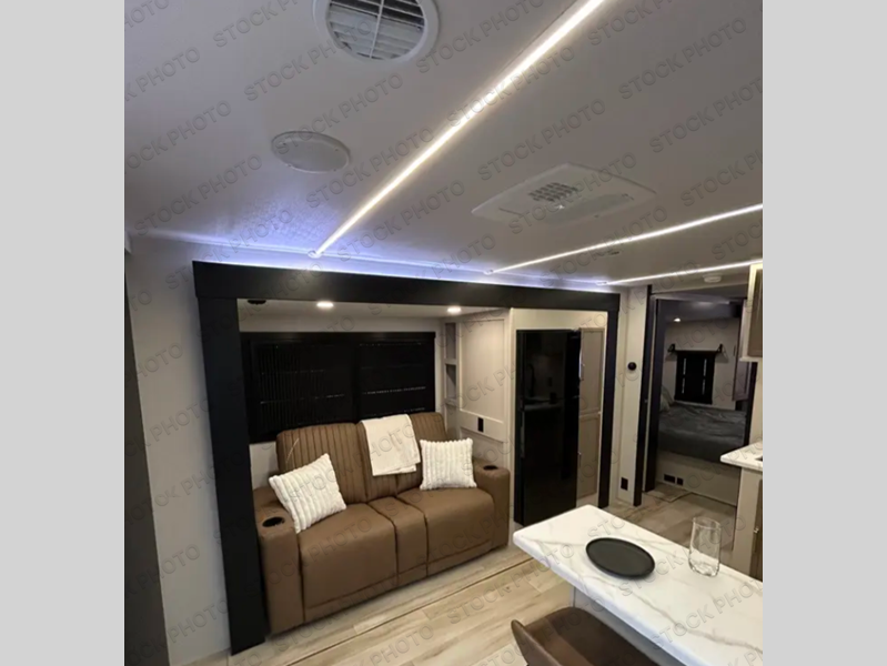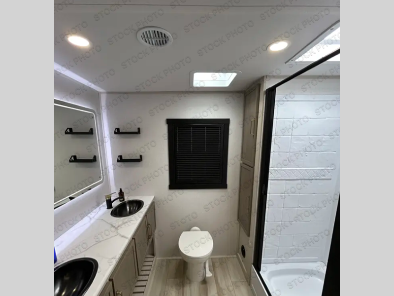 This is the perfect couple's trailer for weekend trips to the campground. The middle kitchen includes ample counter space with two stools where you can enjoy your breakfast at. You can relax on the theater seat within the slide out here, and the pantry and 12V refrigerator is close by so you can grab a snack. A front private bedroom includes a king bed slide out, a large front wardrobe with washer and dryer prep, a dresser, and a vanity with an ottoman. The full rear bath includes dual bath sinks, a walk-in shower with a skylights, and a linen closet to keep towels close by.