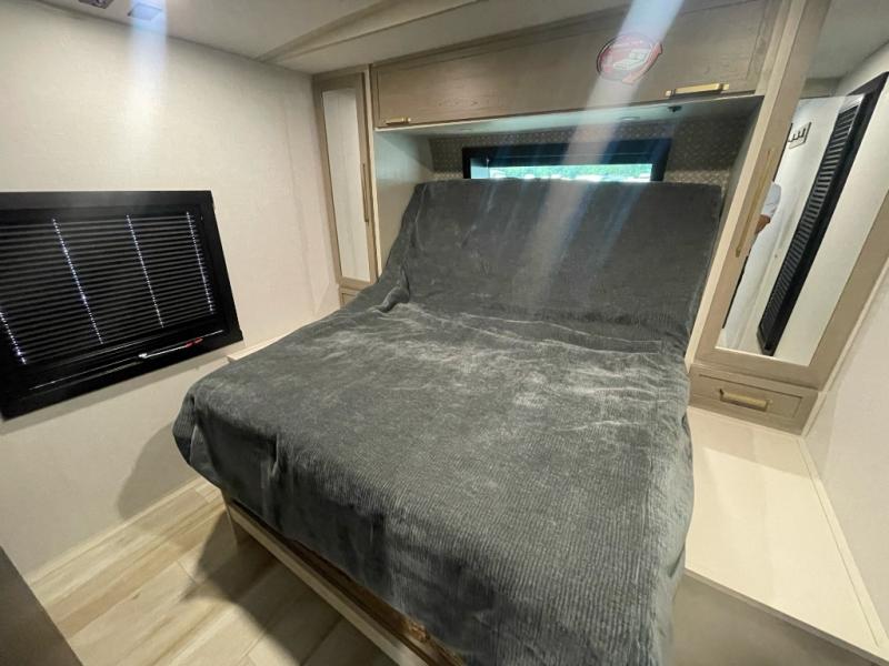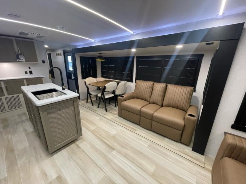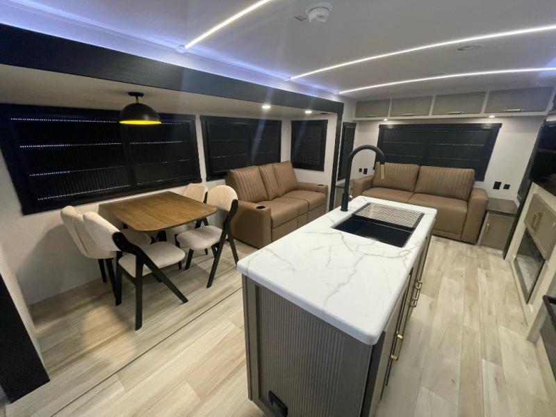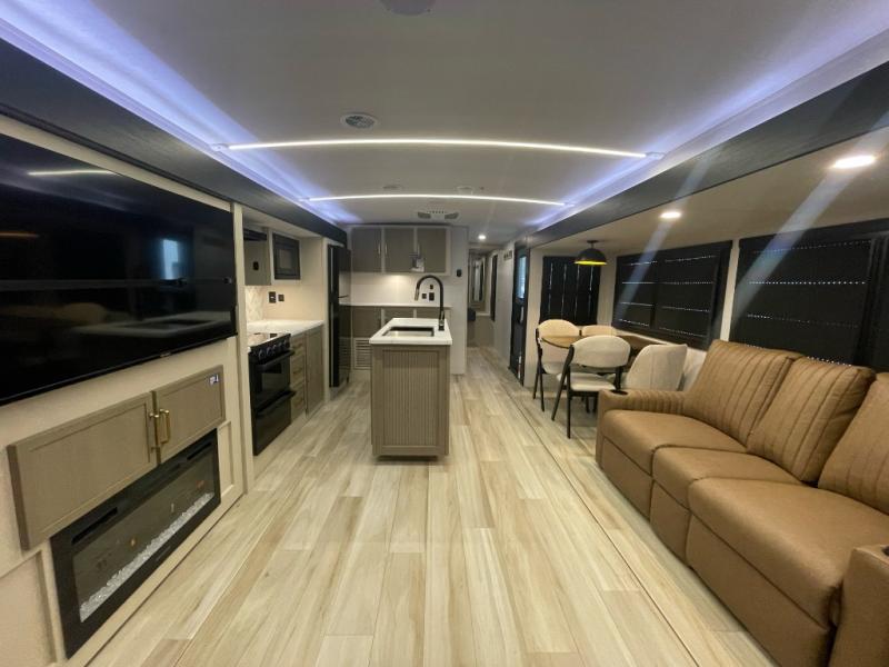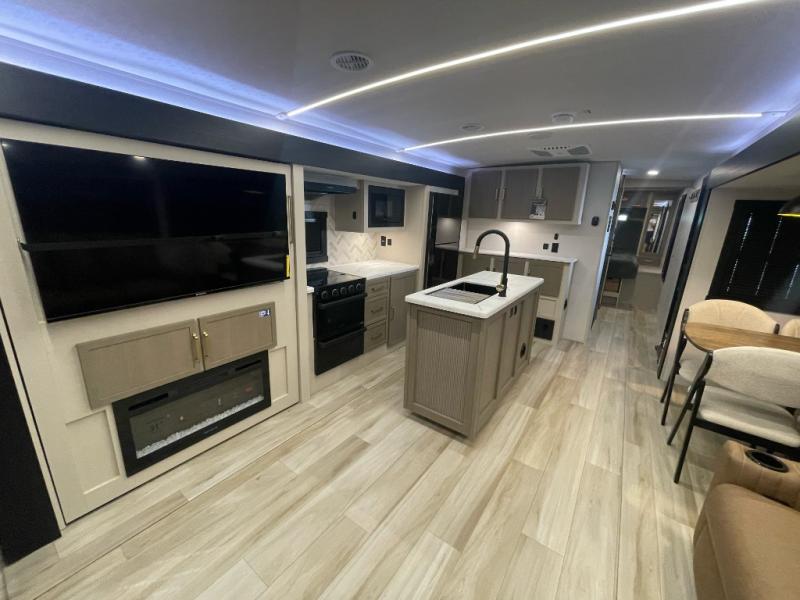 Step inside this luxurious travel trailer and see all that it has to offer! You will enjoy a good night's rest each night on the queen bed with Versa Tilt with wardrobes on either side to keep your clothes wrinkle free, and if you have a couple of guests then you can convert the rear tri-fold sofa or the booth dinette into a sleeping space. The 30" x 36" walk-in shower with a skylight above invites you to take a hot, steamy shower after a fun-filled day outdoors. Once you're cleaned up, you can grab some leftovers from the 10 cu. ft. 12V black refrigerator and warm it up in the microwave. There is also theatre seating across from the 50" LED TV with a fireplace below!