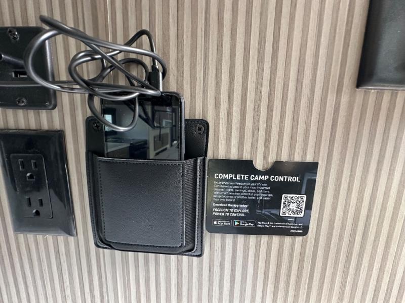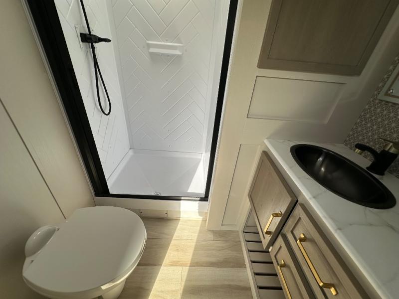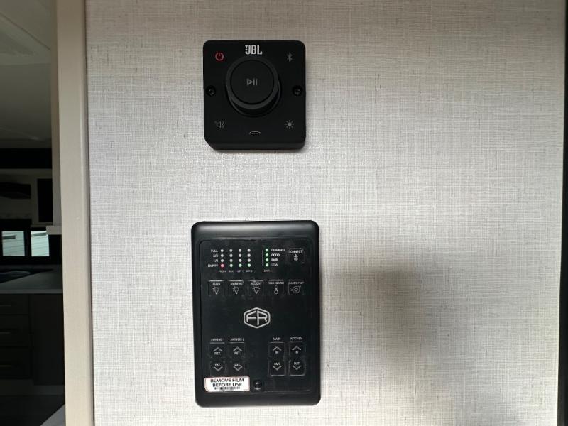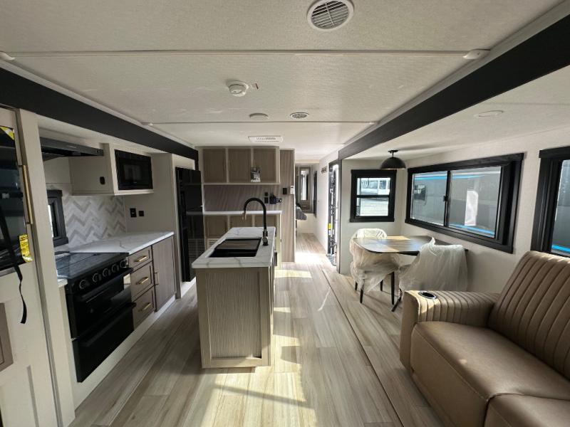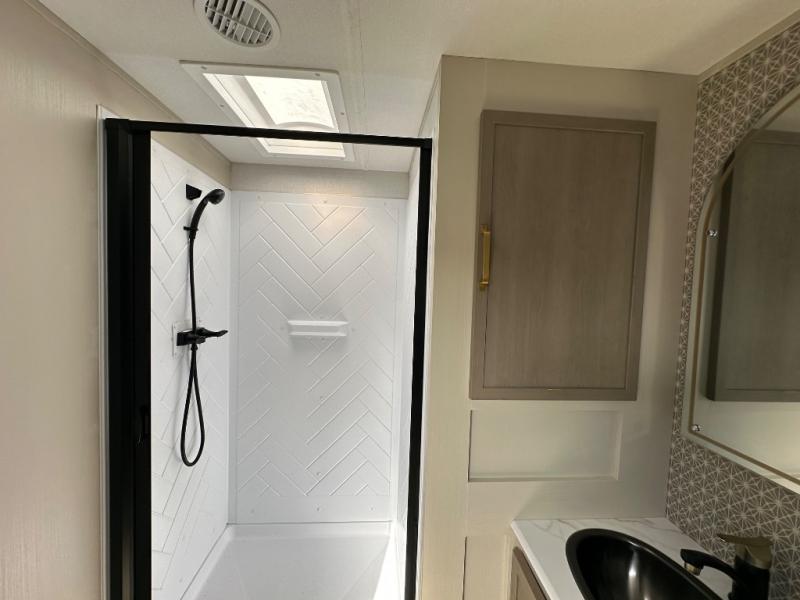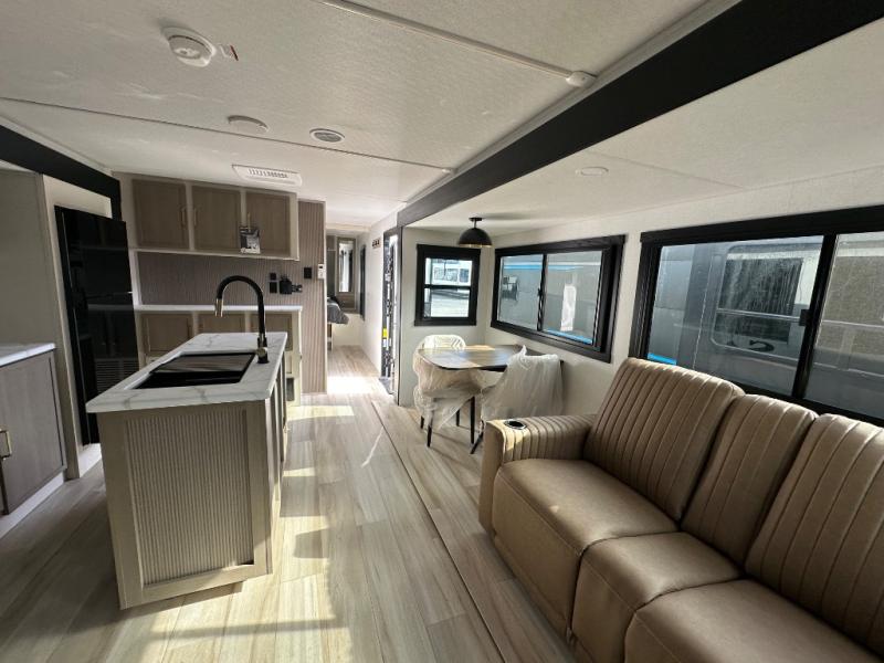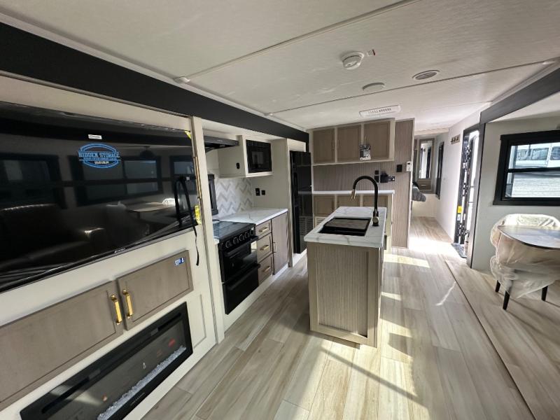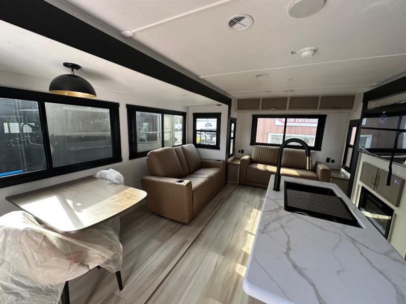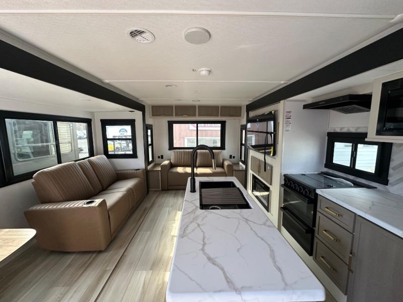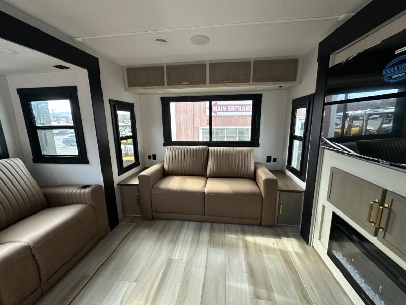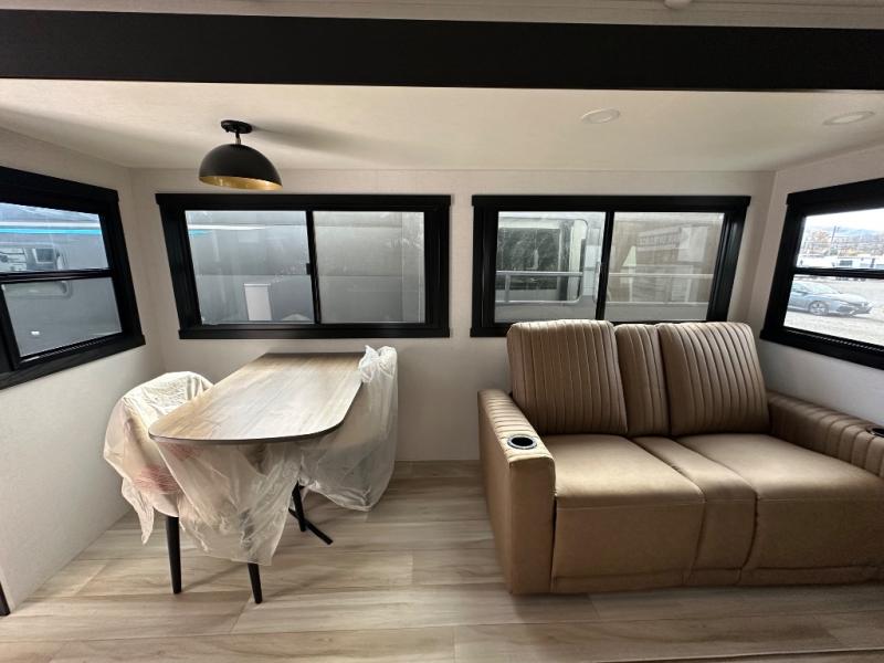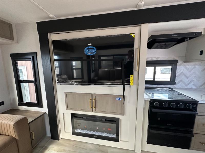 Step inside this luxurious travel trailer and see all that it has to offer! You will enjoy a good night's rest each night on the queen bed with Versa Tilt with wardrobes on either side to keep your clothes wrinkle free, and if you have a couple of guests then you can convert the rear tri-fold sofa or the booth dinette into a sleeping space. The 30" x 36" walk-in shower with a skylight above invites you to take a hot, steamy shower after a fun-filled day outdoors. Once you're cleaned up, you can grab some leftovers from the 10 cu. ft. 12V black refrigerator and warm it up in the microwave. There is also theatre seating across from the 50" LED TV with a fireplace below!