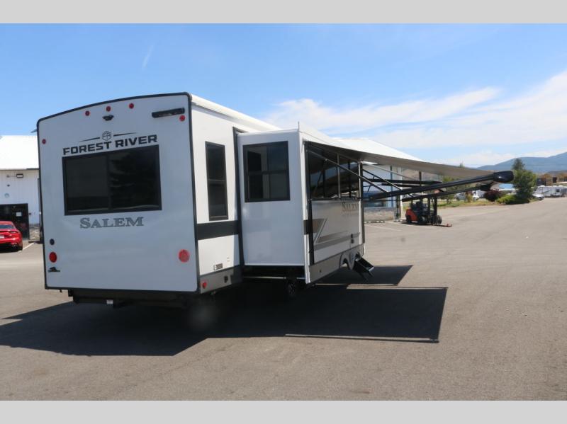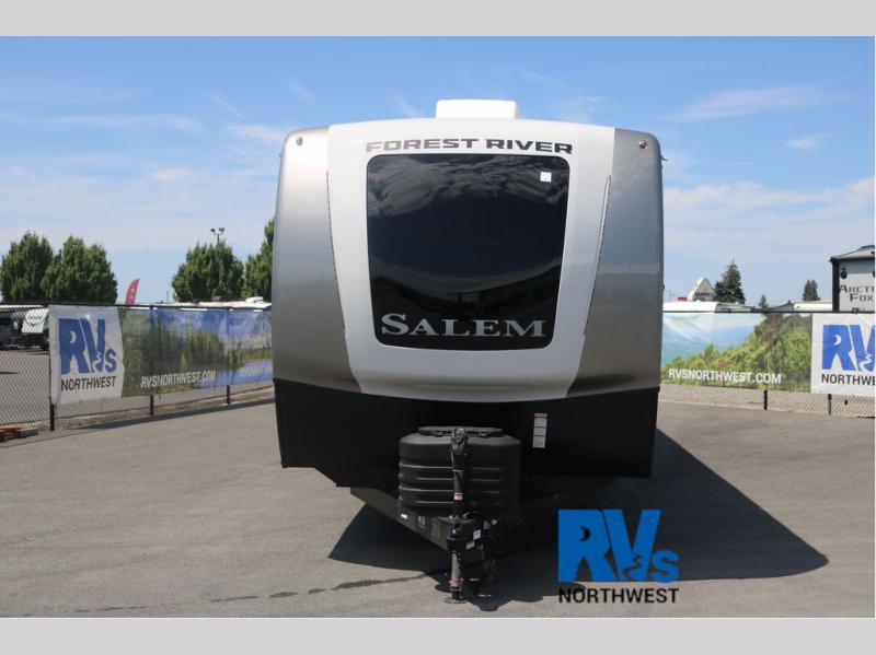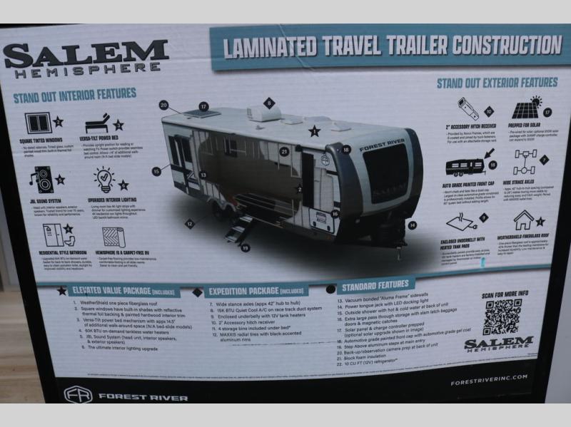 The Salem Hemisphere travel trailers by Forest River are packed with features, while still being value-minded! Each model is constructed with laminated "Aluma Frame" sidewalls and floor with block foam insulation plus an enclosed underbelly with 12V tank heaters on all holding tanks. There are LED awning, marker and taillights outside, along with an extra-large pass-thru storage with slam latch baggage doors, plus solar prep and Lippert On-The-Go ladder prep. The 60K on-demand tankless water heater will provide endless hot showers, and the JBL sound system includes a head unit plus interior and exterior speakers to keep the party going. There are also many interior comforts found throughout that will make you feel right at home!