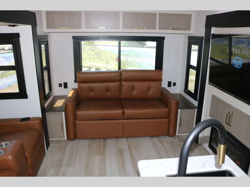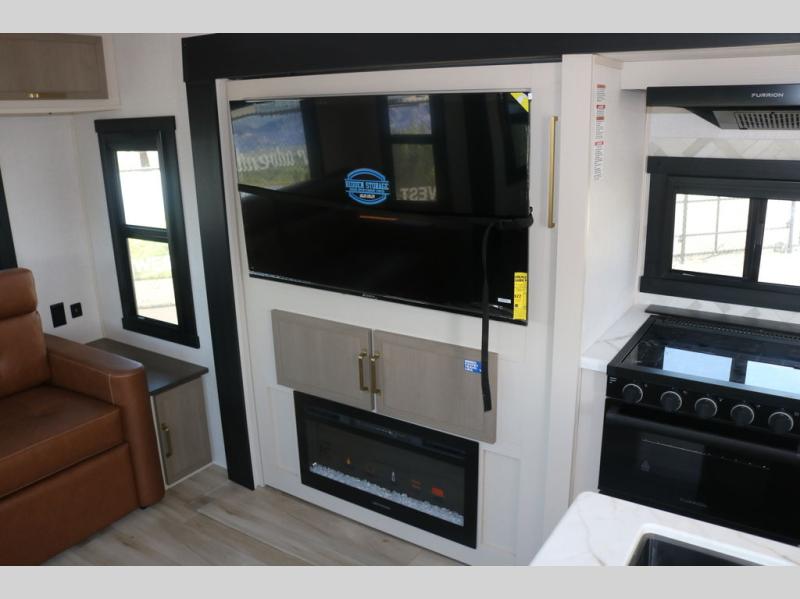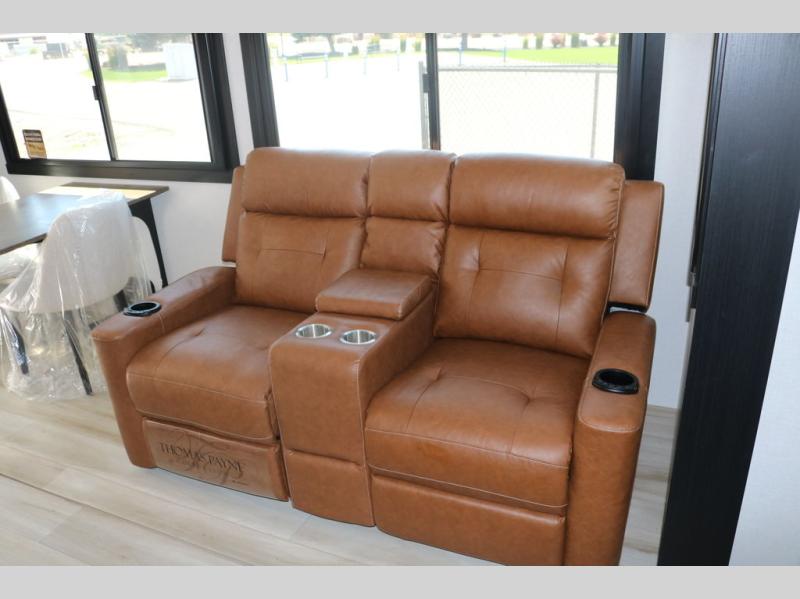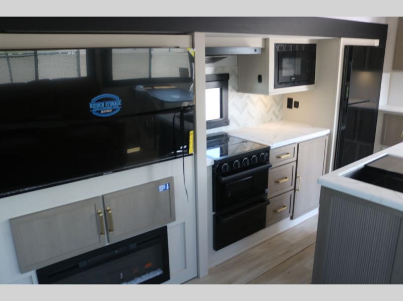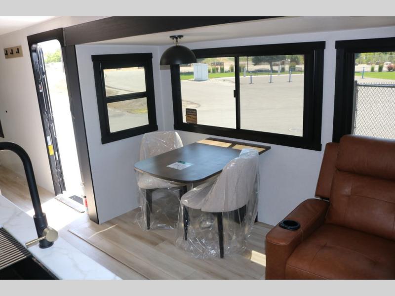 Step inside this luxurious travel trailer and see all that it has to offer! You will enjoy a good night's rest each night on the queen bed with Versa Tilt with wardrobes on either side to keep your clothes wrinkle free, and if you have a couple of guests then you can convert the rear tri-fold sofa or the booth dinette into a sleeping space. The 30" x 36" walk-in shower with a skylight above invites you to take a hot, steamy shower after a fun-filled day outdoors. Once you're cleaned up, you can grab some leftovers from the 10 cu. ft. 12V black refrigerator and warm it up in the microwave. There is also theatre seating across from the 50" LED TV with a fireplace below!