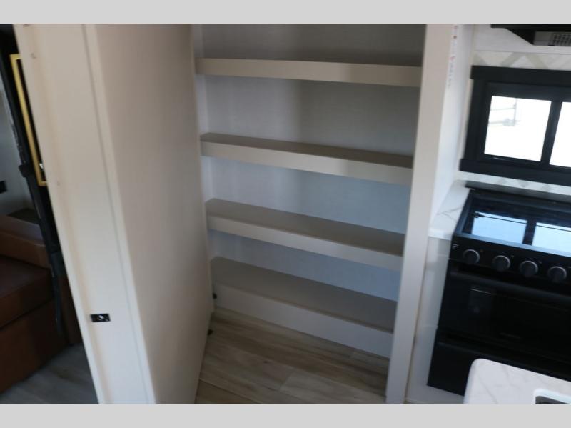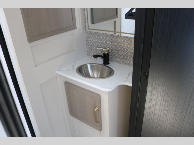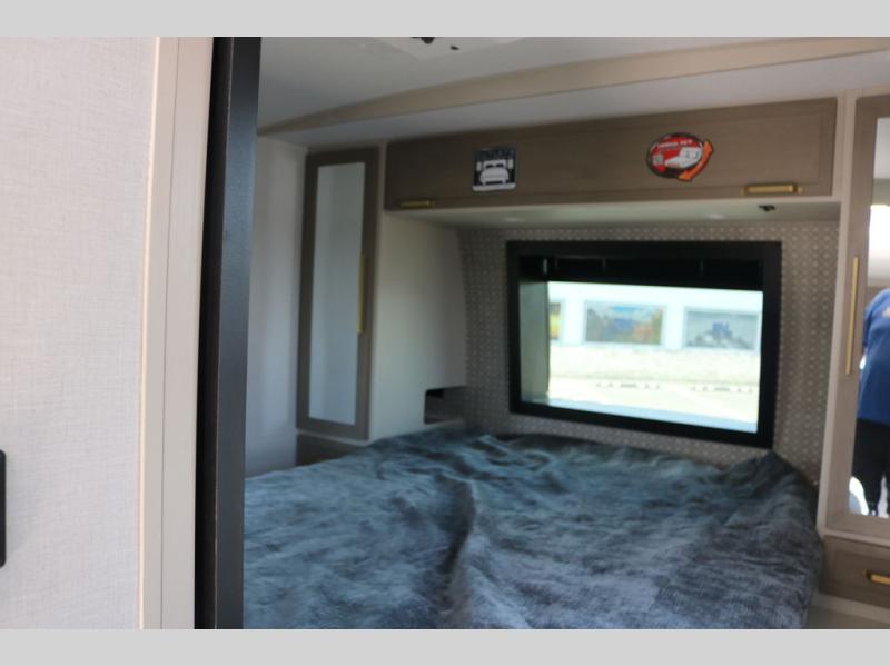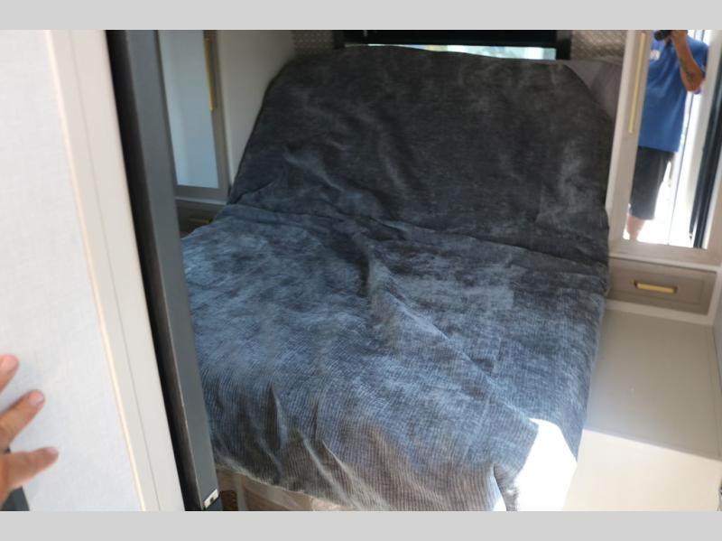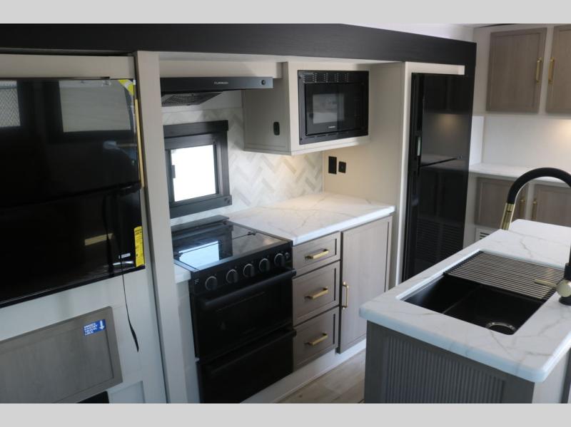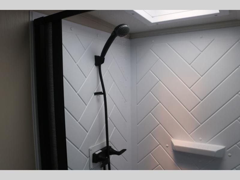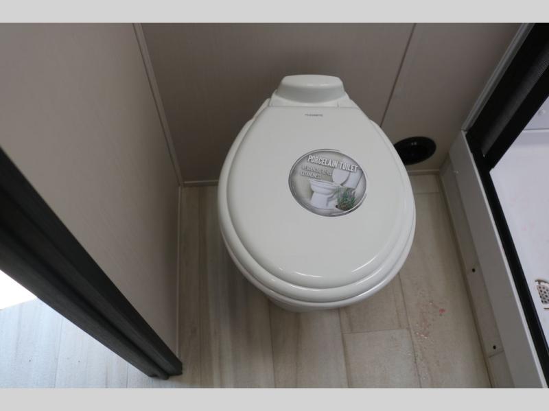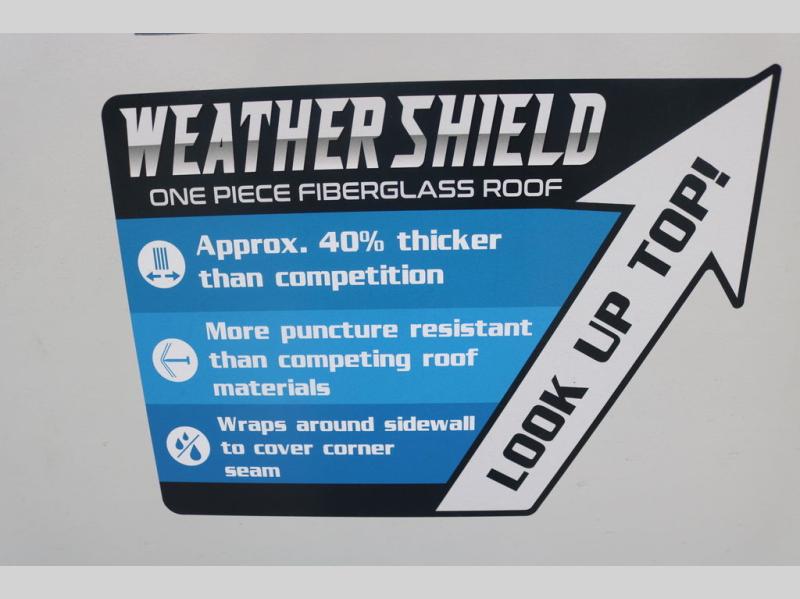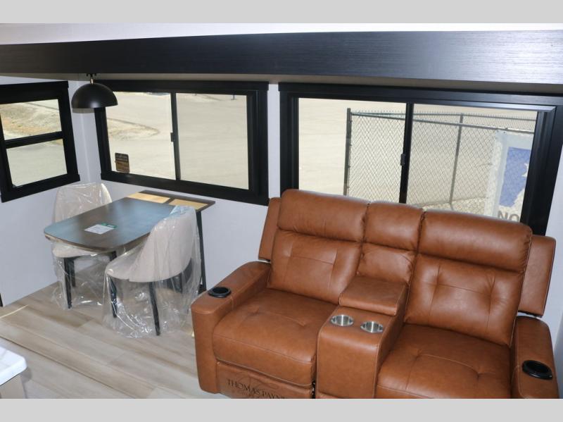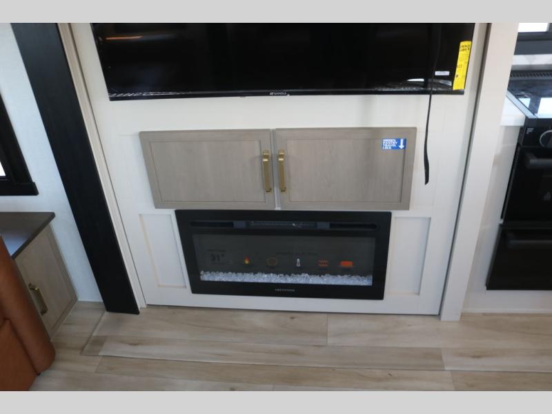 Step inside this luxurious travel trailer and see all that it has to offer! You will enjoy a good night's rest each night on the queen bed with Versa Tilt with wardrobes on either side to keep your clothes wrinkle free, and if you have a couple of guests then you can convert the rear tri-fold sofa or the booth dinette into a sleeping space. The 30" x 36" walk-in shower with a skylight above invites you to take a hot, steamy shower after a fun-filled day outdoors. Once you're cleaned up, you can grab some leftovers from the 10 cu. ft. 12V black refrigerator and warm it up in the microwave. There is also theatre seating across from the 50" LED TV with a fireplace below!