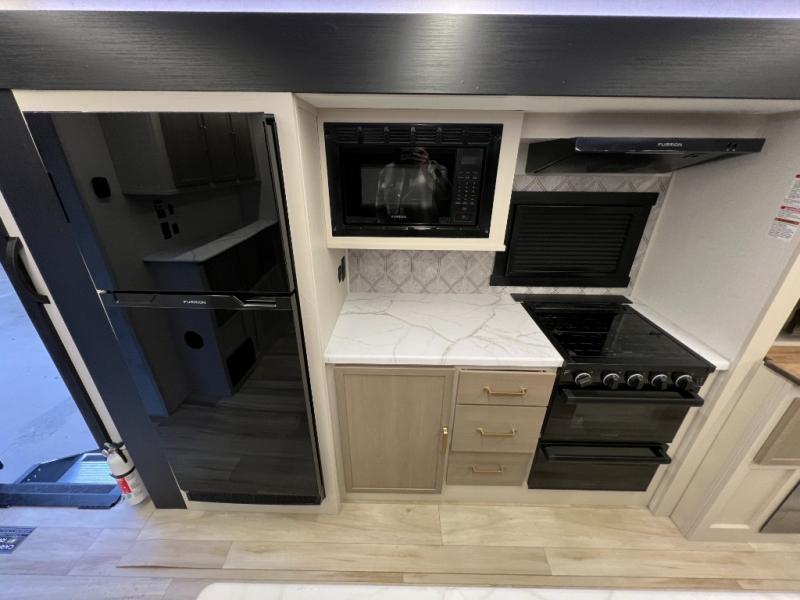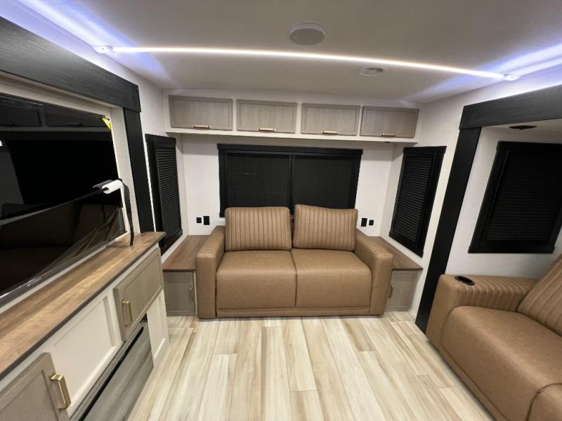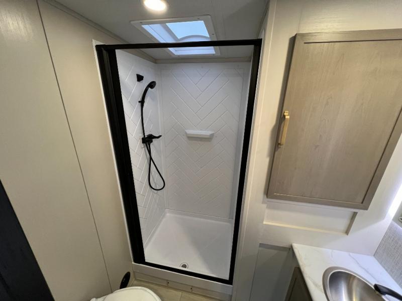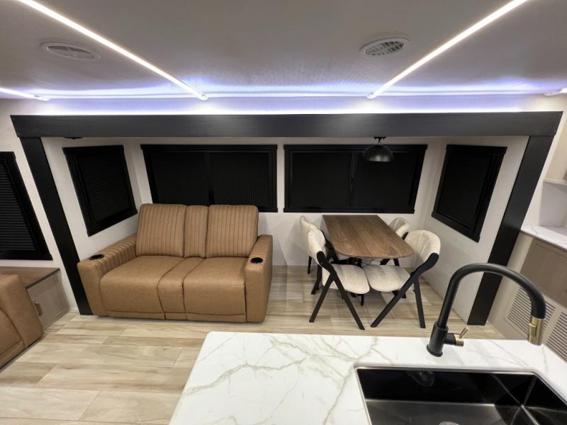 Once you step foot in this travel trailer, you won't want to camp any other way! There is plenty of entertainment and seating for everyone in the rear living area with the tri-fold sofa, the theatre seating with cupholders, and the 50" LED TV with a fireplace. You can cook your meals either indoors with the kitchen island or enjoy some fresh air at the outside kitchen/bar then head indoors and eat it comfortably at the booth dinette. There are plenty other convenient features like the hutch for your dishes, the 30" x 36" walk-in shower, and the Texas-sized exterior pass-through storage area!