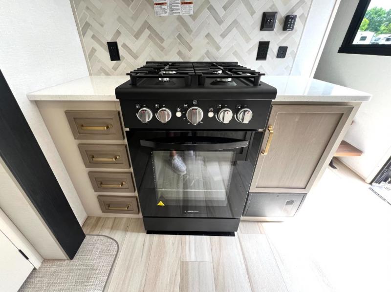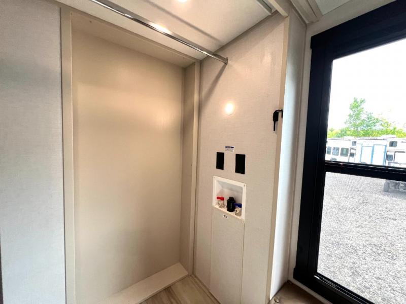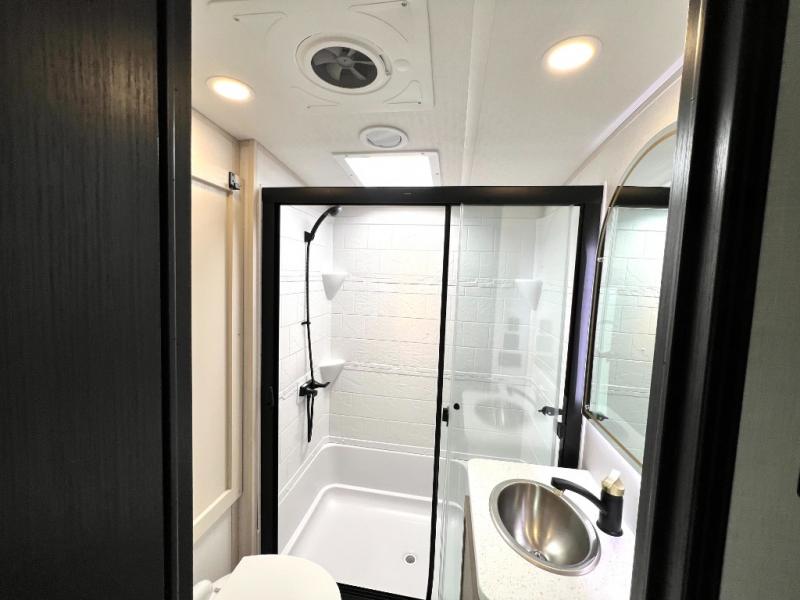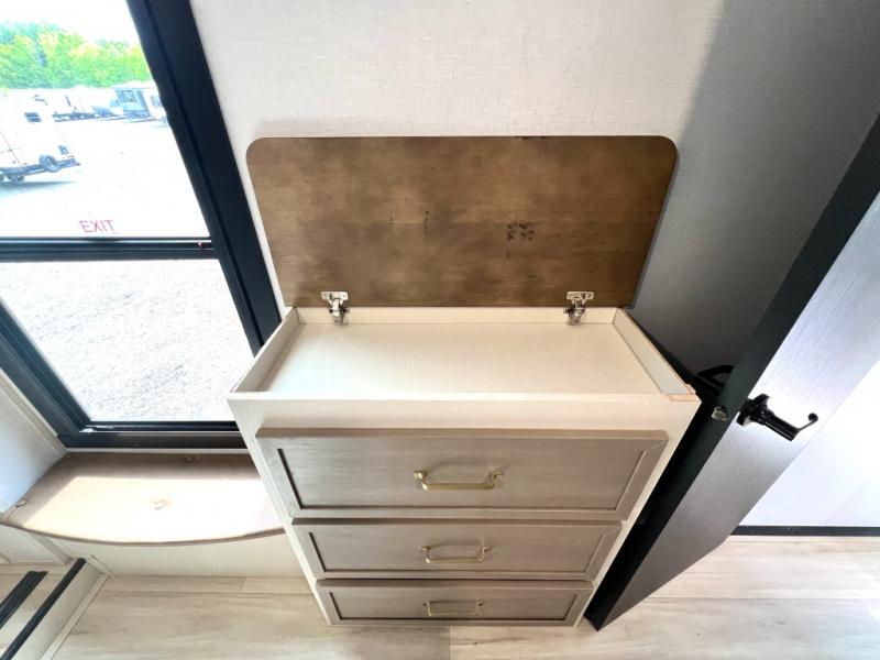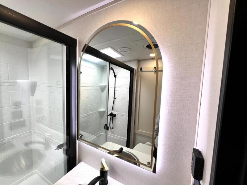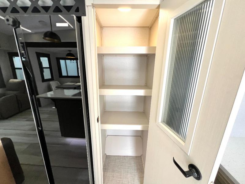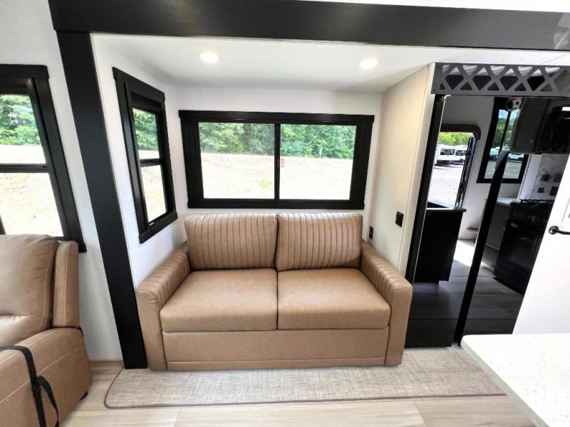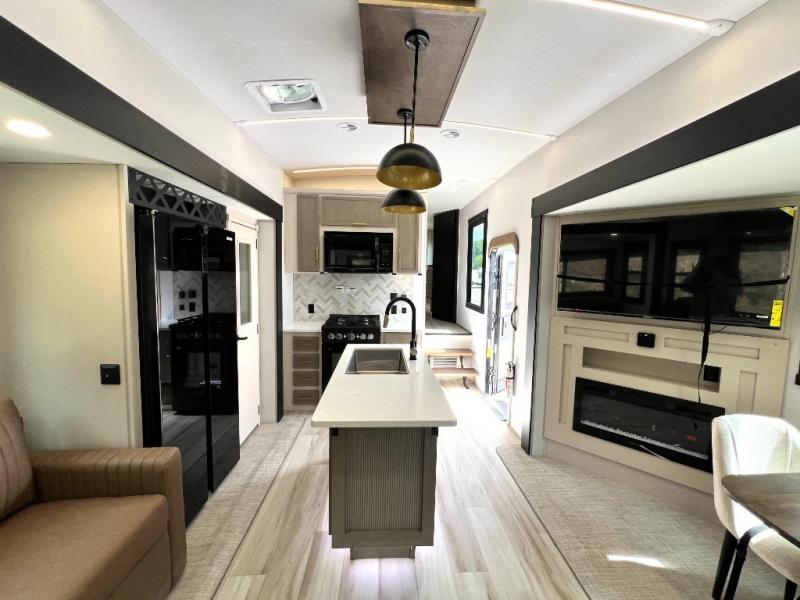 Enjoy the sunshine with panoramic windows throughout this fifth wheel! The rear living area is perfect for relaxing in at night on one of the two chairs or the tri-fold sofa. There is also a table with four chairs, a 50" LED TV, and a fireplace to make this area feel more like home. The kitchen has an island with a large sink to make clean up easier and a pantry big enough to store everyone's favorite snacks. The full bathroom has a residential walk-in shower with a skylight above for natural lighting as you get ready. When you're ready to hit the sack, head to the front private bedroom and enjoy a good night's rest on the custom king bed!