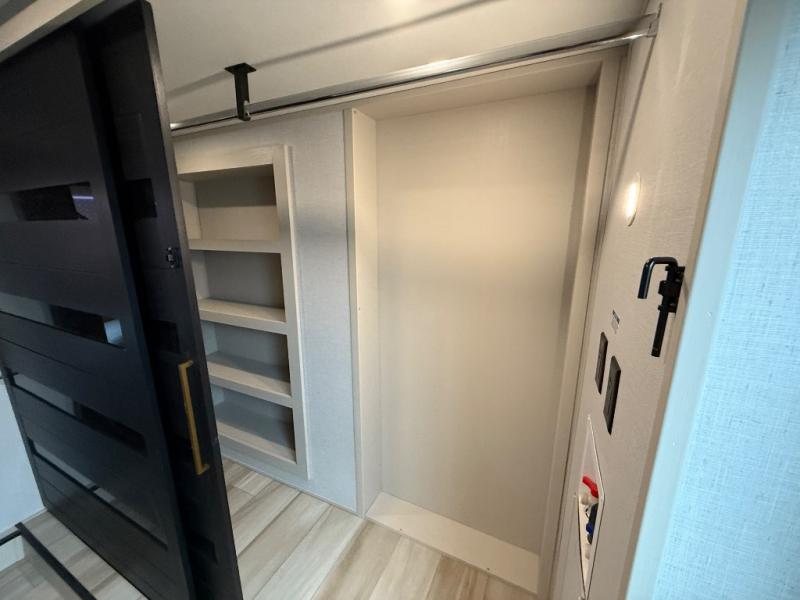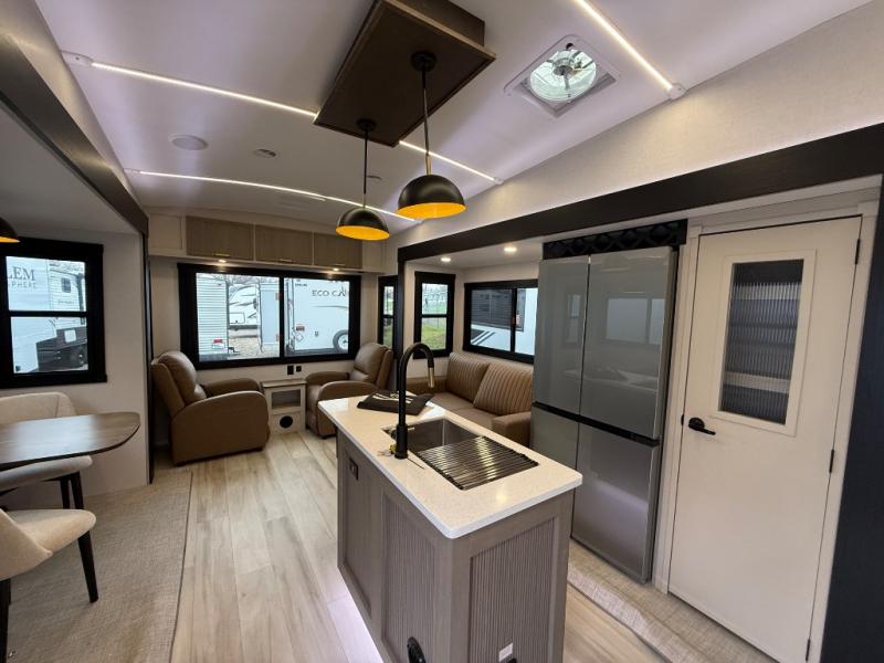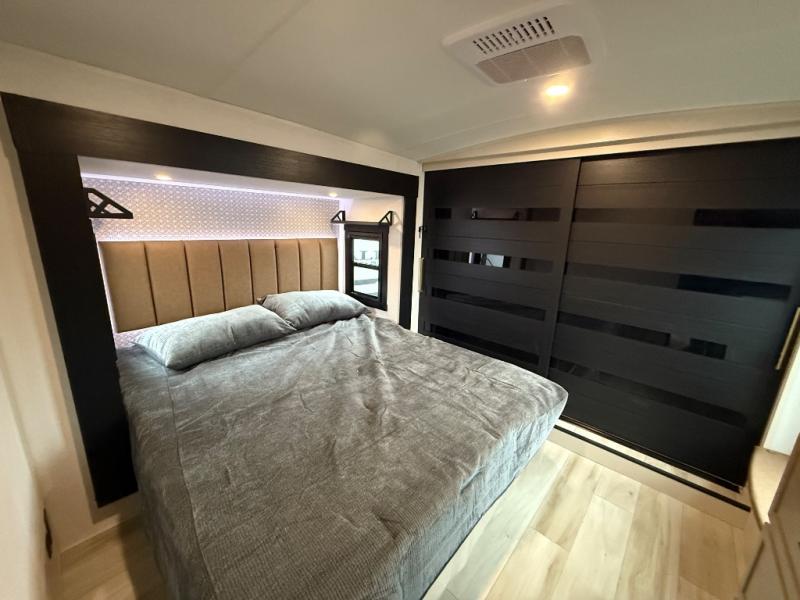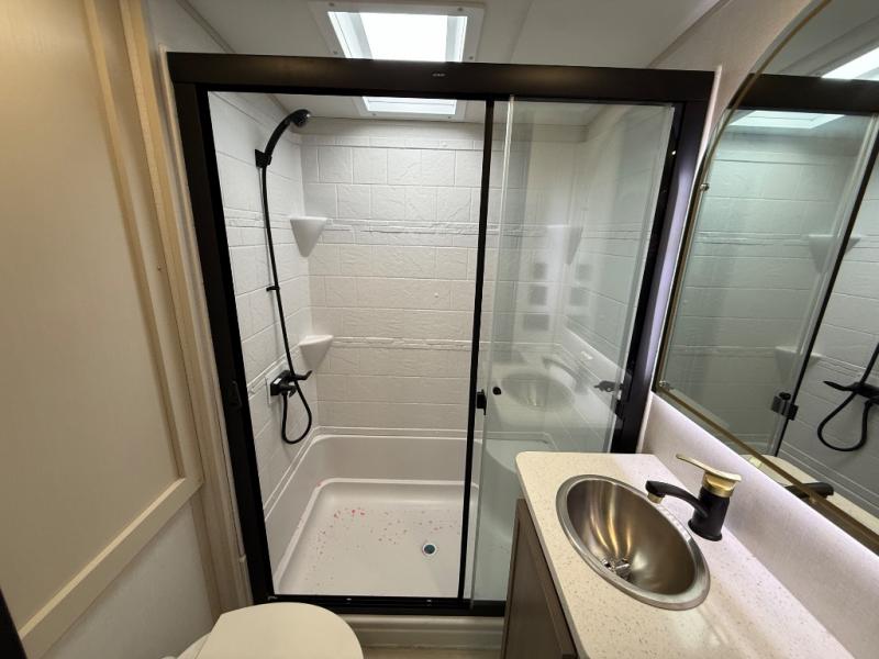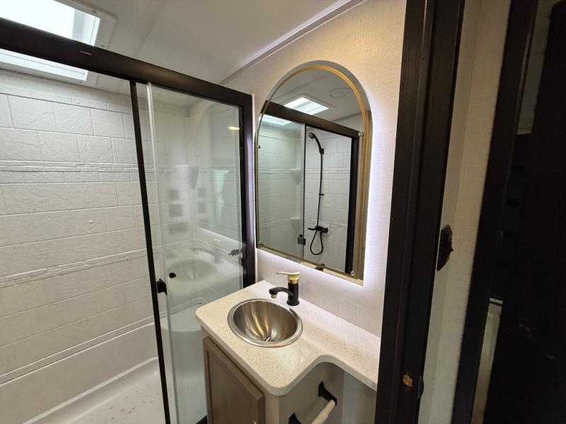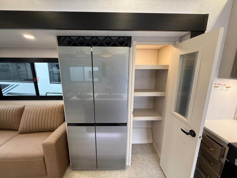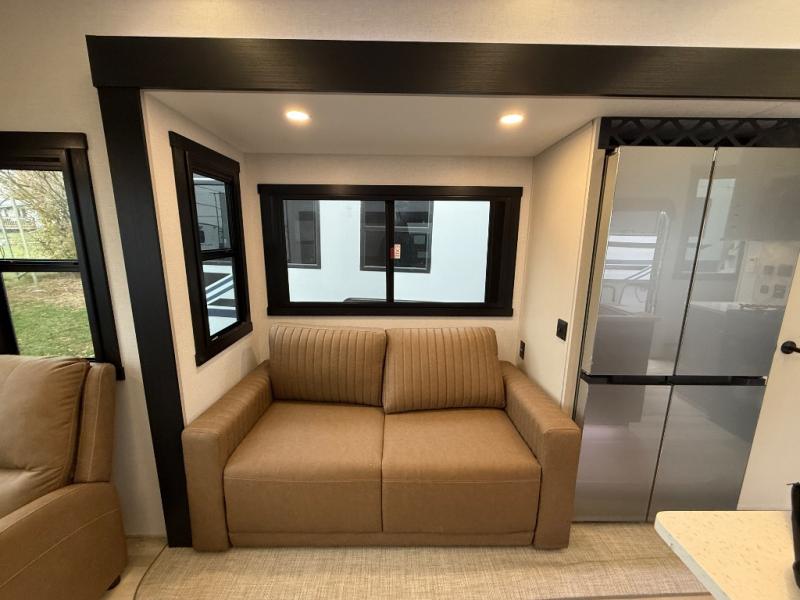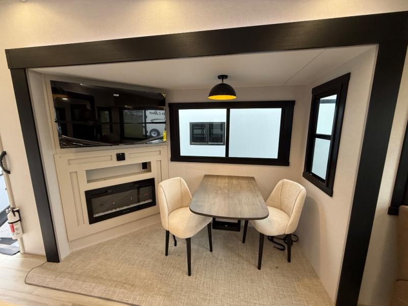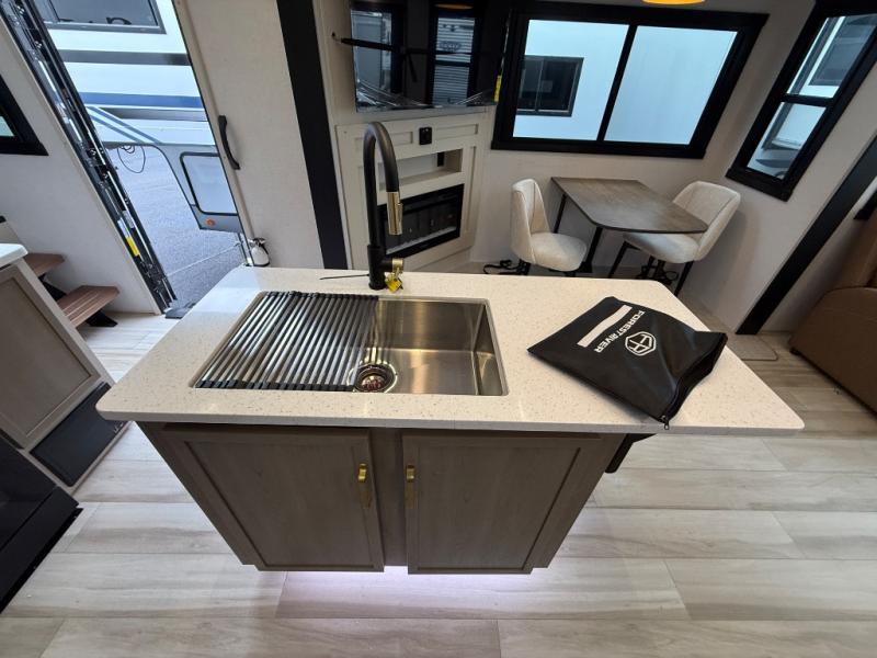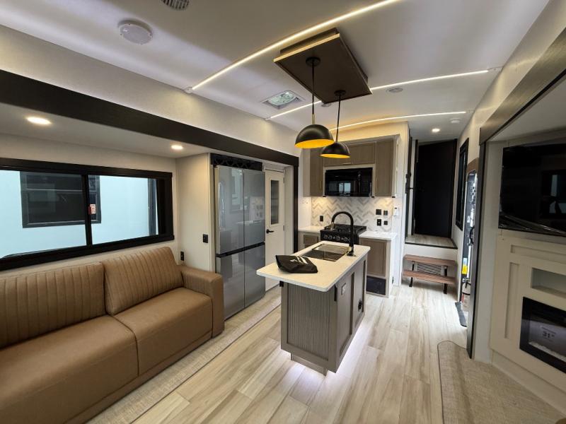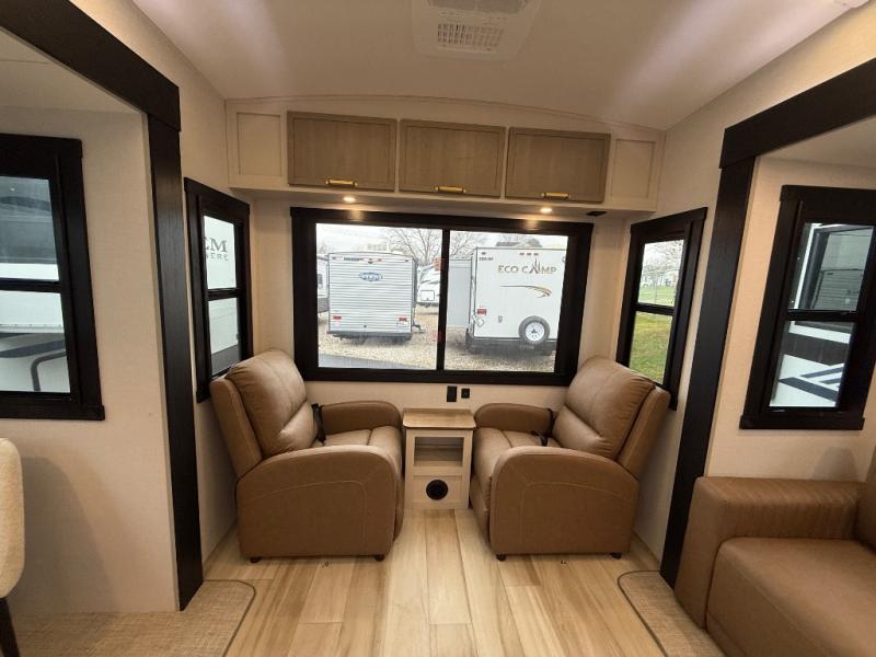 Enjoy the sunshine with panoramic windows throughout this fifth wheel! The rear living area is perfect for relaxing in at night on one of the two chairs or the tri-fold sofa. There is also a table with four chairs, a 50" LED TV, and a fireplace to make this area feel more like home. The kitchen has an island with a large sink to make clean up easier and a pantry big enough to store everyone's favorite snacks. The full bathroom has a residential walk-in shower with a skylight above for natural lighting as you get ready. When you're ready to hit the sack, head to the front private bedroom and enjoy a good night's rest on the custom king bed!