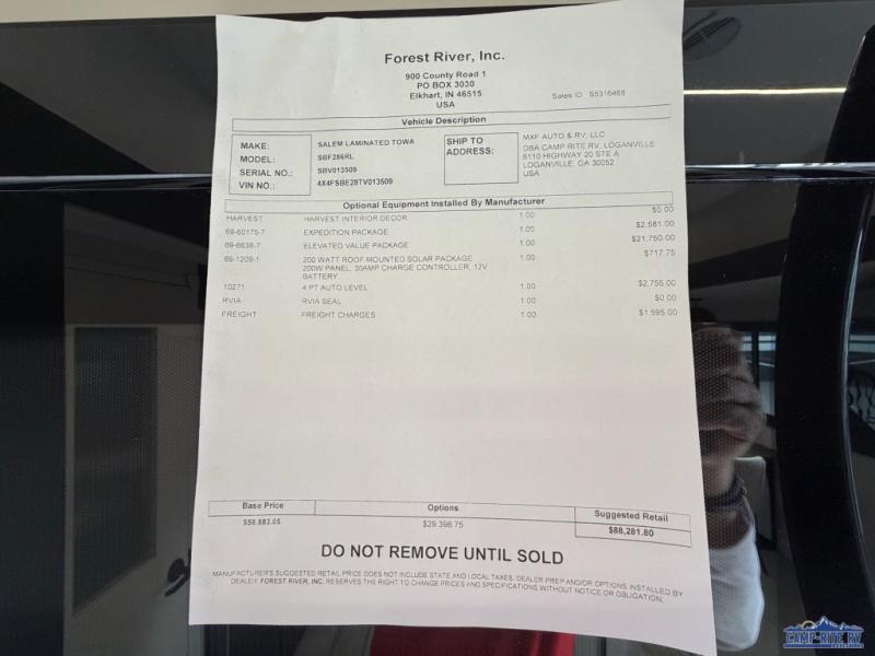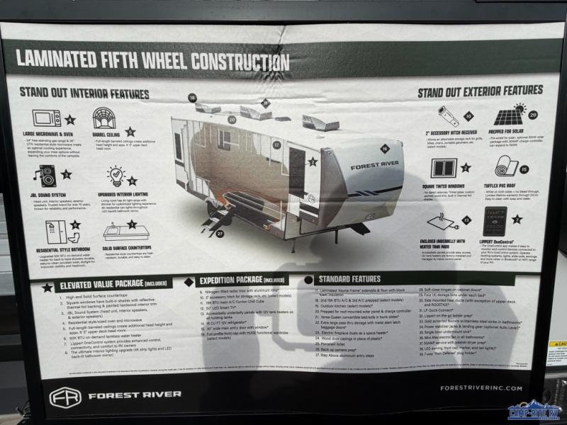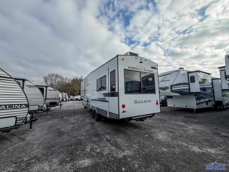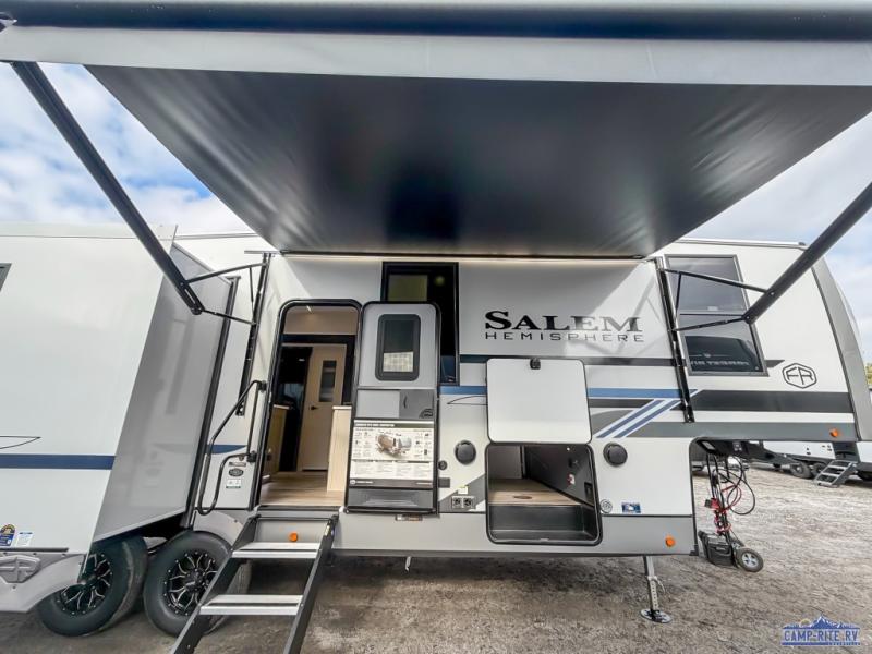 The Salem Hemisphere fifth wheels by Forest River are packed with features, while still being value-minded! Each model is constructed with laminated "Aluma Frame" sidewalls and floor with block foam insulation plus full-length barreled ceilings for added head space. There are LED awning, marker and taillights outside, along with an extra-large pass-thru storage with slam latch baggage doors, plus solar prep and Lippert On-The-Go ladder prep. The 60K on-demand tankless water heater will provide endless hot showers, and the JBL sound system includes a head unit plus interior and exterior speakers to keep the party going. There are also many interior comforts found throughout that will make you feel right at home!