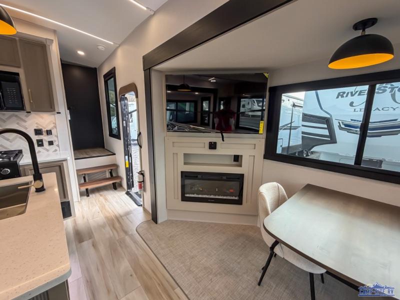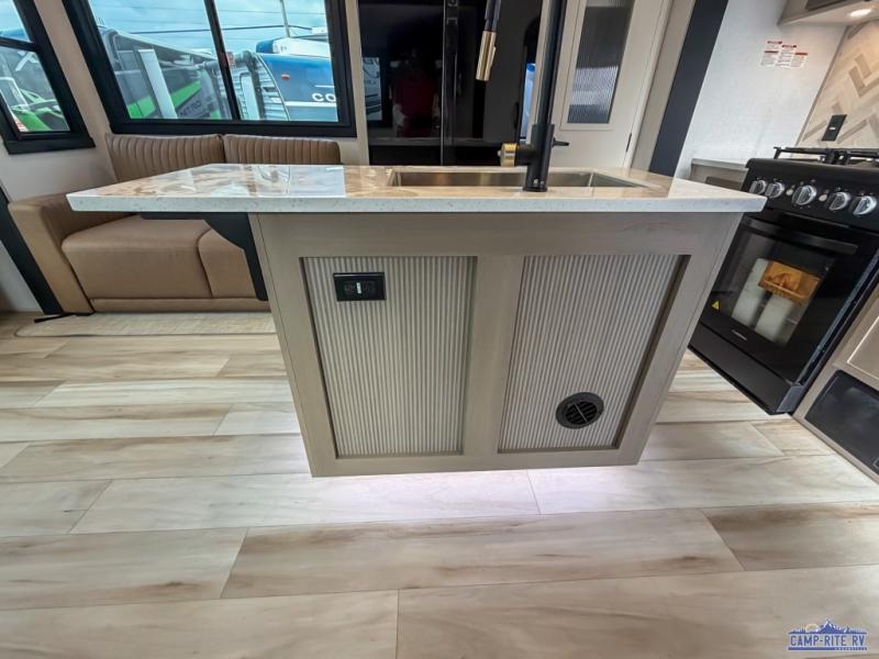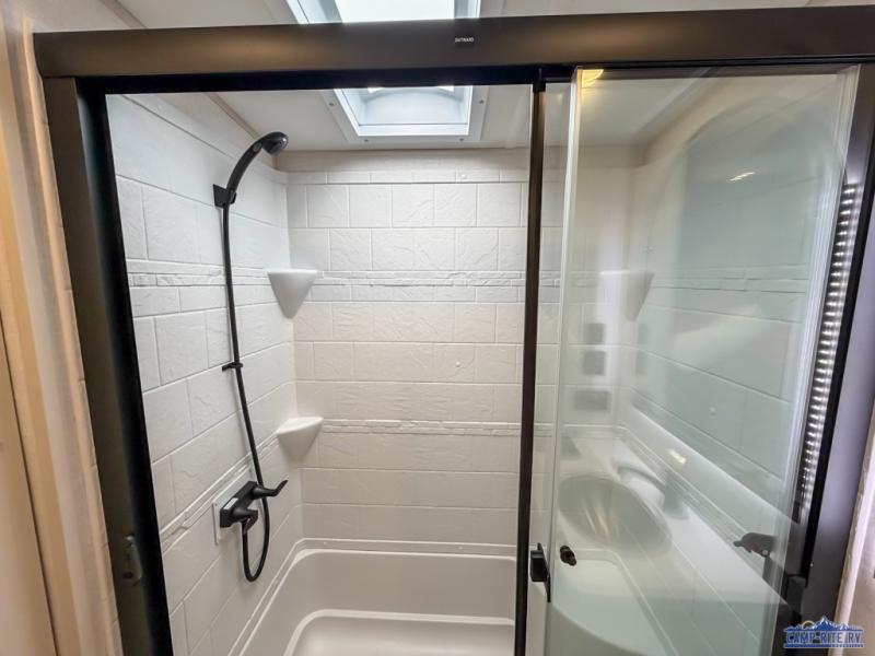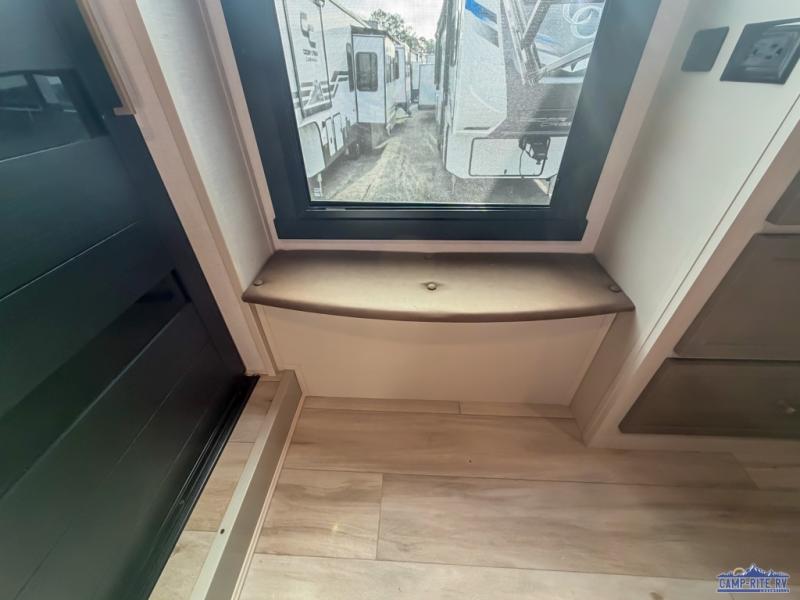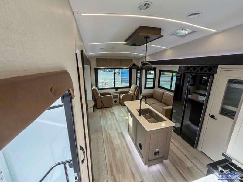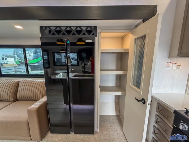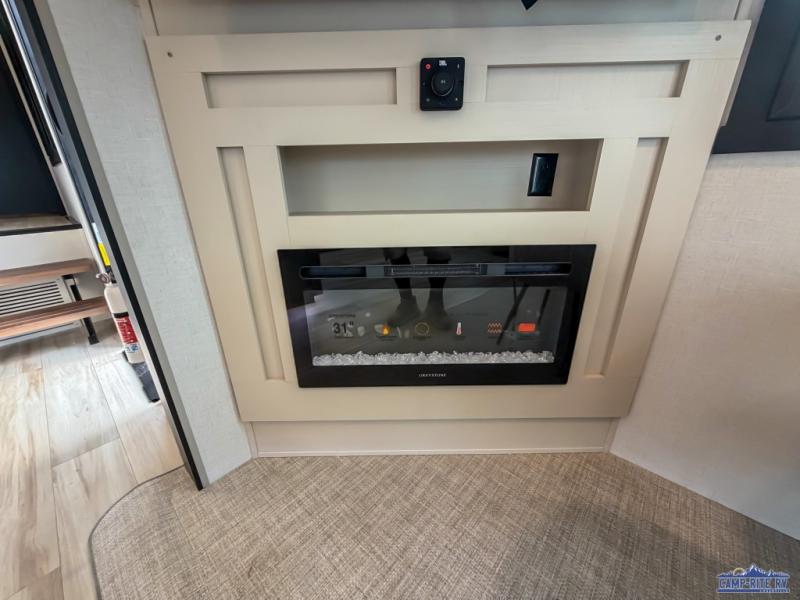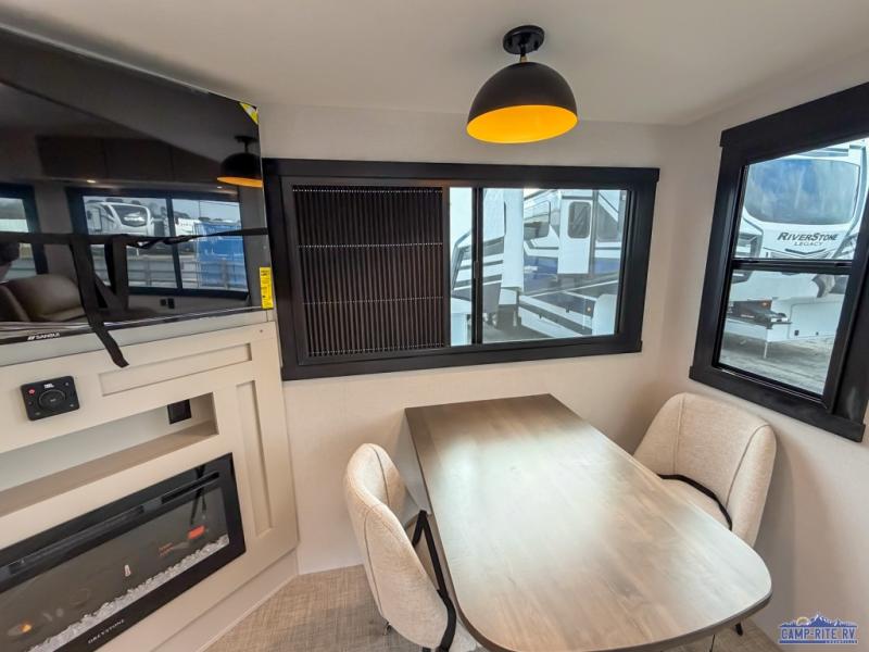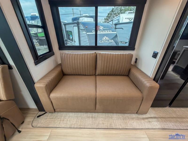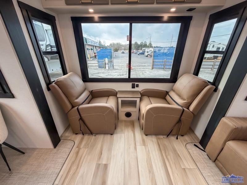 Enjoy the sunshine with panoramic windows throughout this fifth wheel! The rear living area is perfect for relaxing in at night on one of the two chairs or the tri-fold sofa. There is also a table with four chairs, a 50" LED TV, and a fireplace to make this area feel more like home. The kitchen has an island with a large sink to make clean up easier and a pantry big enough to store everyone's favorite snacks. The full bathroom has a residential walk-in shower with a skylight above for natural lighting as you get ready. When you're ready to hit the sack, head to the front private bedroom and enjoy a good night's rest on the custom king bed!