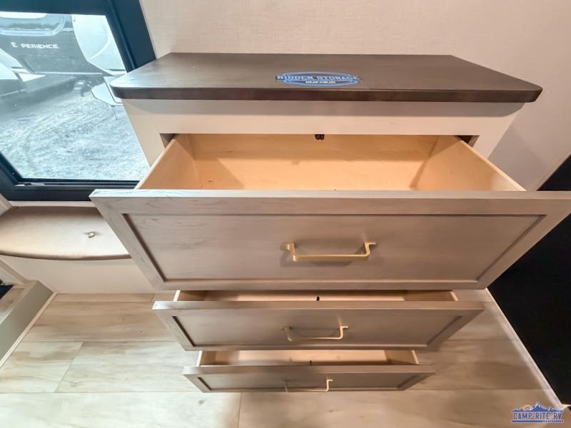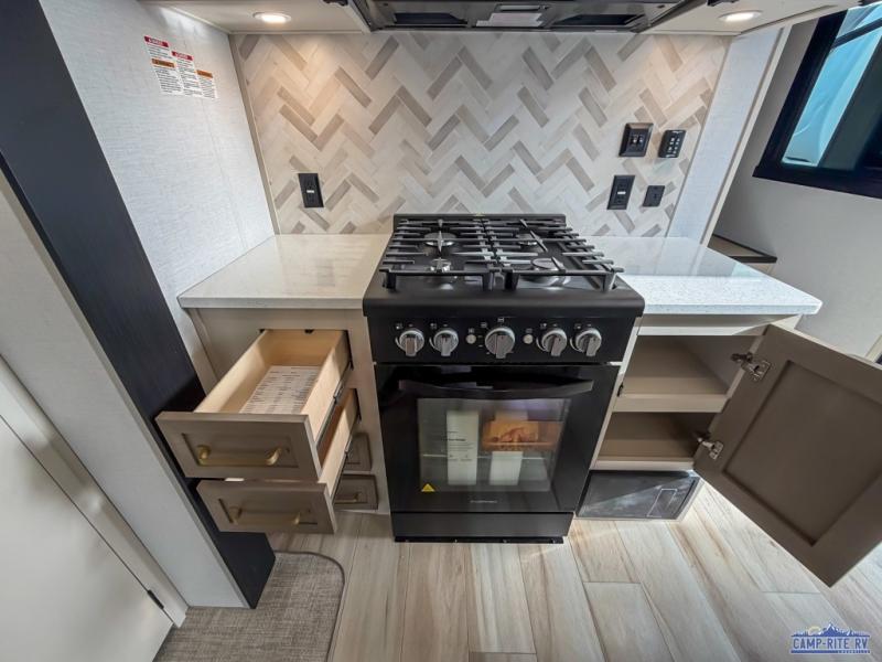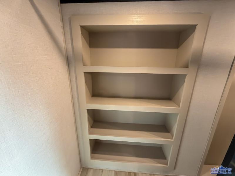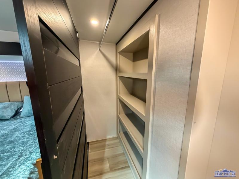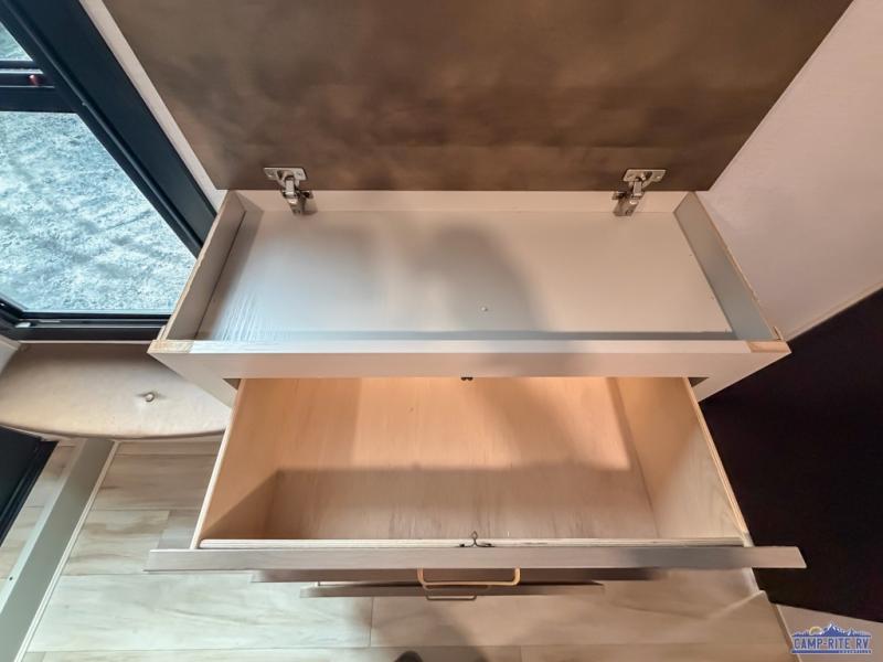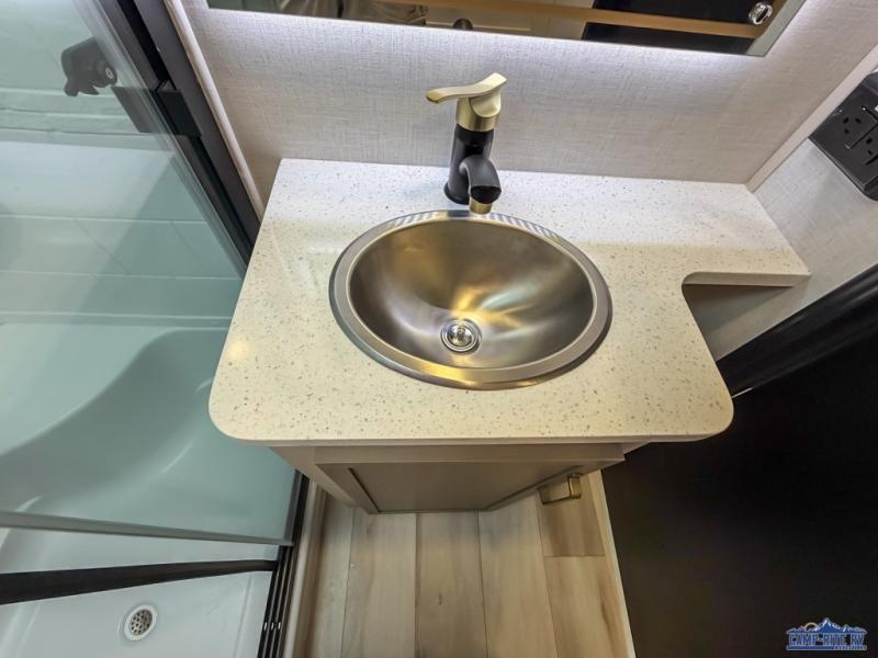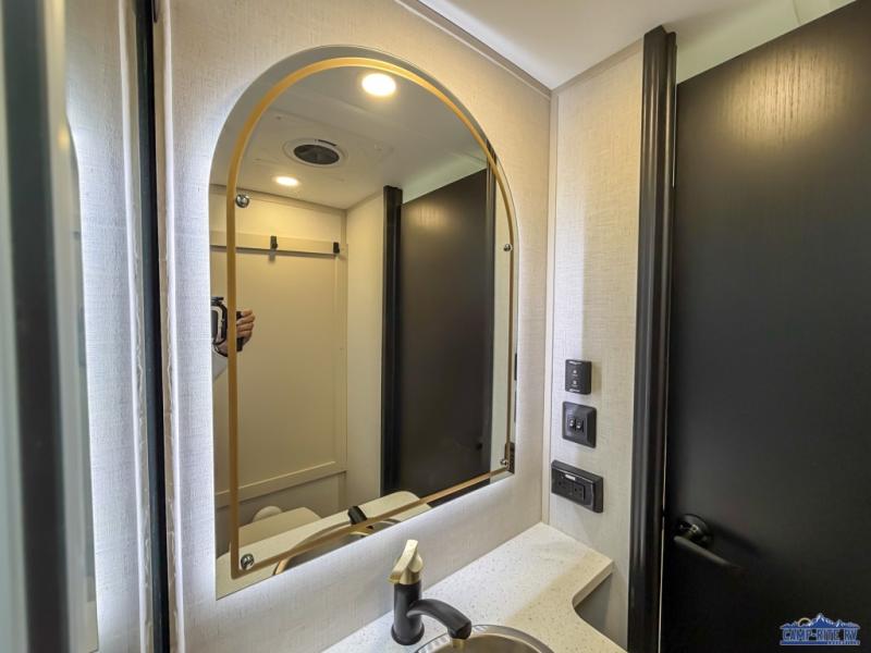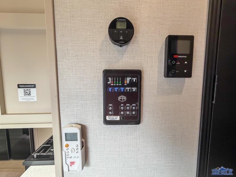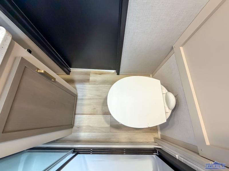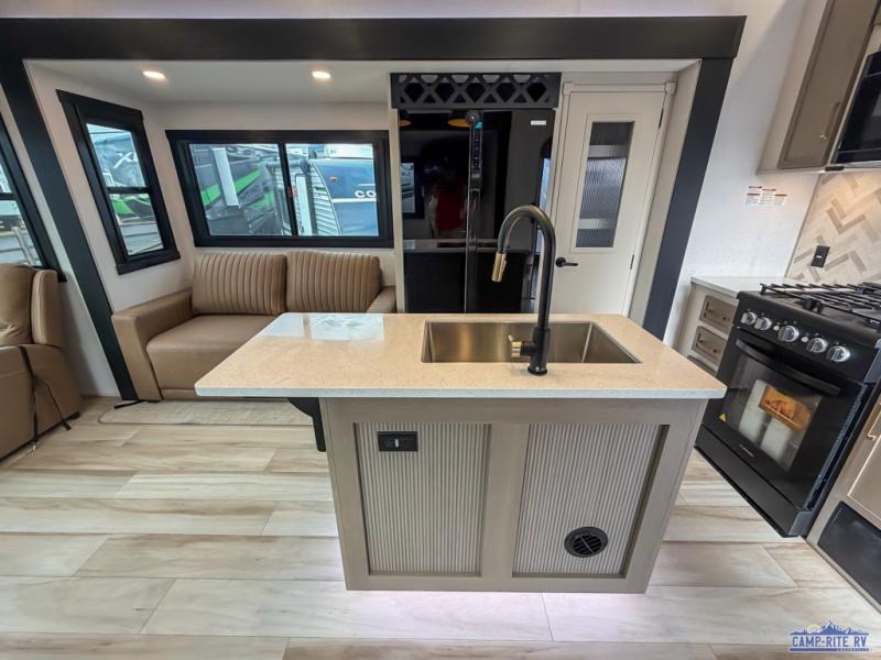 Enjoy the sunshine with panoramic windows throughout this fifth wheel! The rear living area is perfect for relaxing in at night on one of the two chairs or the tri-fold sofa. There is also a table with four chairs, a 50" LED TV, and a fireplace to make this area feel more like home. The kitchen has an island with a large sink to make clean up easier and a pantry big enough to store everyone's favorite snacks. The full bathroom has a residential walk-in shower with a skylight above for natural lighting as you get ready. When you're ready to hit the sack, head to the front private bedroom and enjoy a good night's rest on the custom king bed!