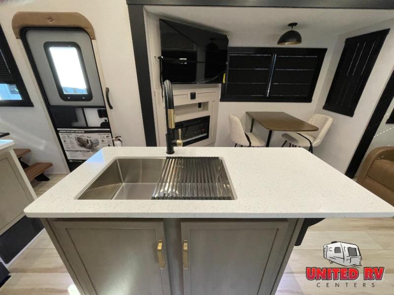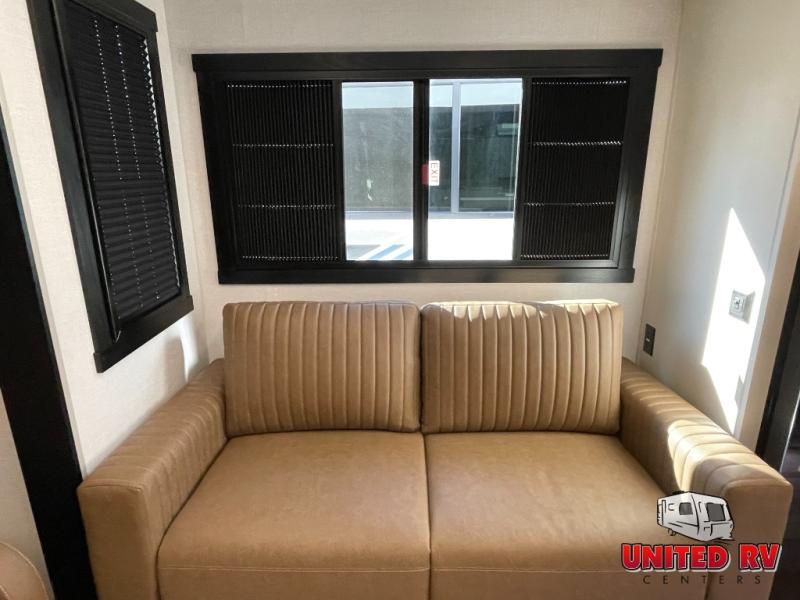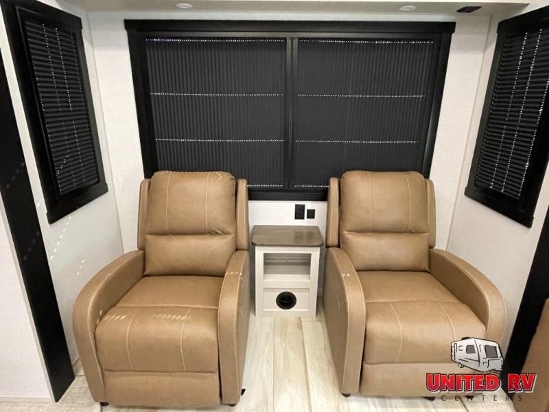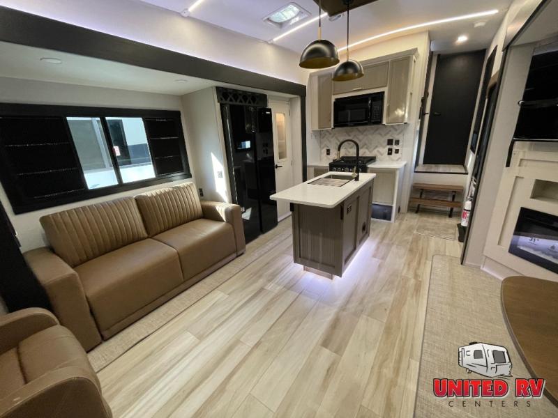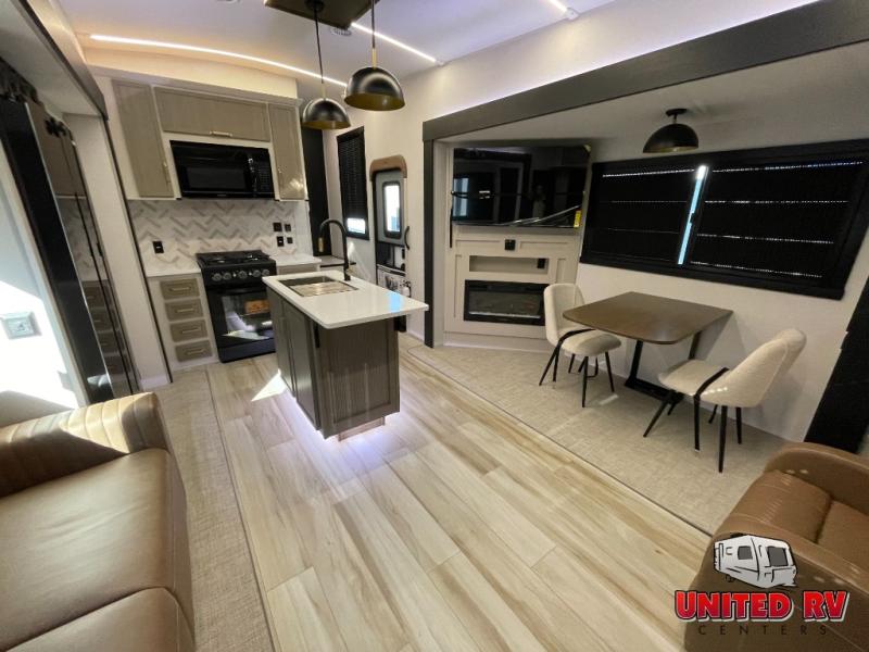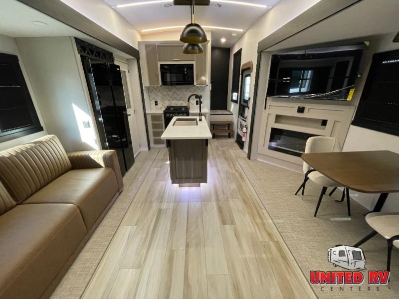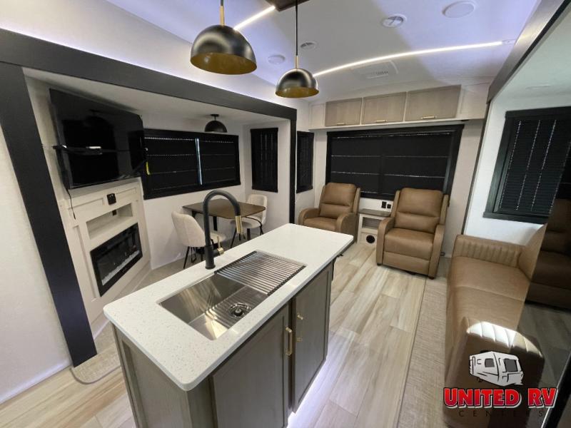 Enjoy the sunshine with panoramic windows throughout this fifth wheel! The rear living area is perfect for relaxing in at night on one of the two chairs or the tri-fold sofa. There is also a table with four chairs, a 50" LED TV, and a fireplace to make this area feel more like home. The kitchen has an island with a large sink to make clean up easier and a pantry big enough to store everyone's favorite snacks. The full bathroom has a residential walk-in shower with a skylight above for natural lighting as you get ready. When you're ready to hit the sack, head to the front private bedroom and enjoy a good night's rest on the custom king bed!