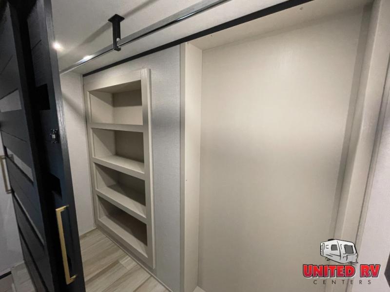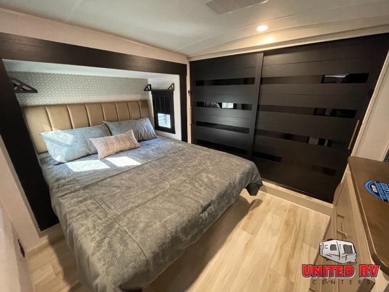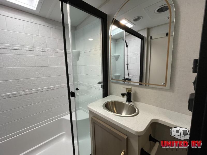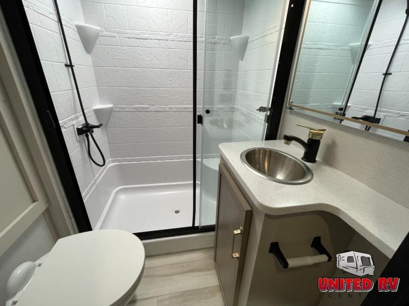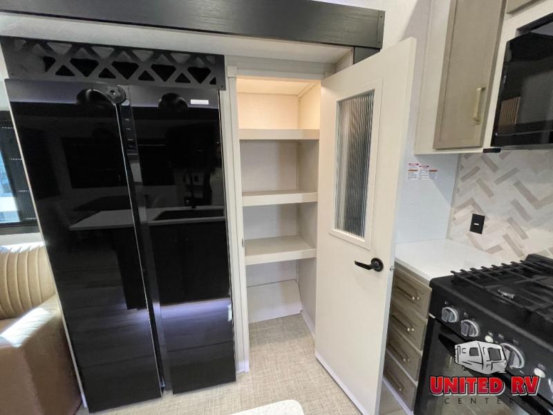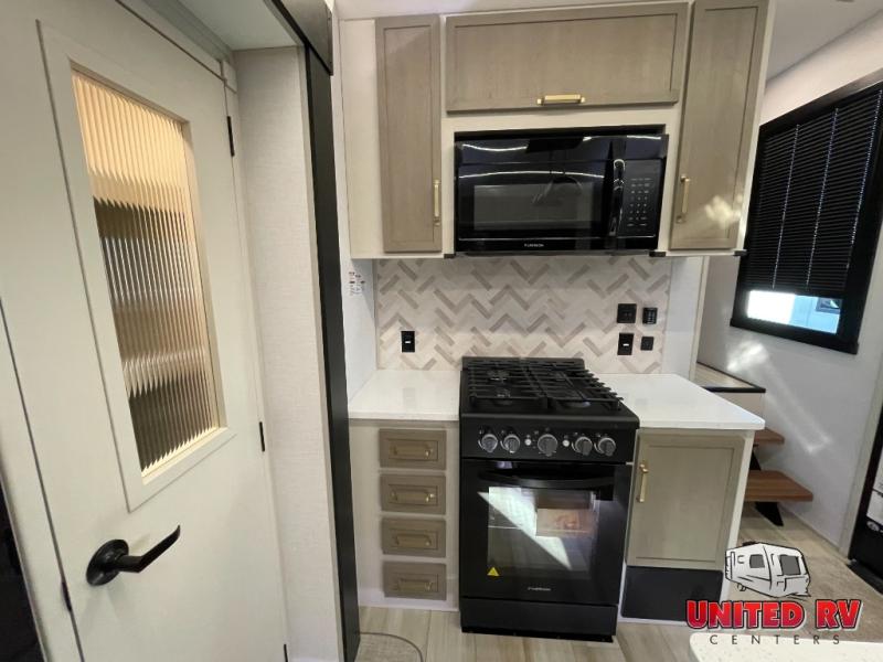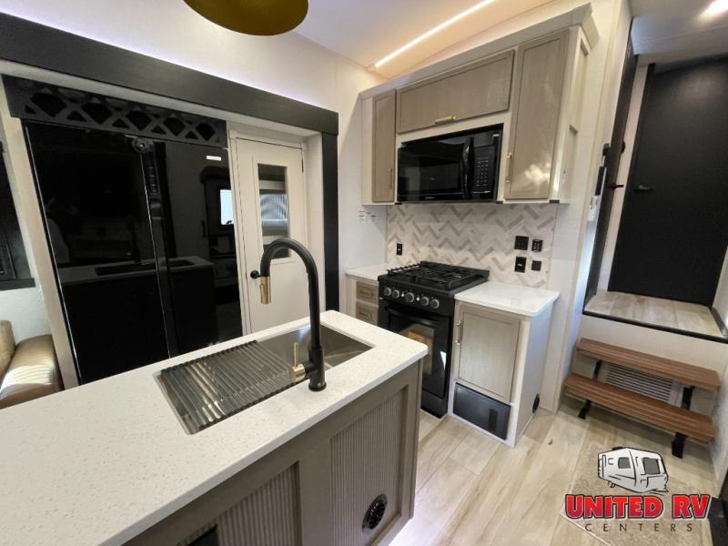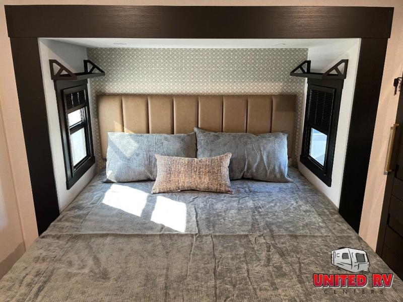 Enjoy the sunshine with panoramic windows throughout this fifth wheel! The rear living area is perfect for relaxing in at night on one of the two chairs or the tri-fold sofa. There is also a table with four chairs, a 50" LED TV, and a fireplace to make this area feel more like home. The kitchen has an island with a large sink to make clean up easier and a pantry big enough to store everyone's favorite snacks. The full bathroom has a residential walk-in shower with a skylight above for natural lighting as you get ready. When you're ready to hit the sack, head to the front private bedroom and enjoy a good night's rest on the custom king bed!
