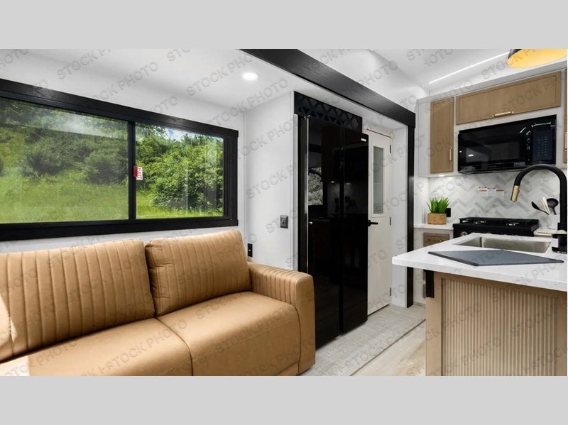 Enjoy the sunshine with panoramic windows throughout this fifth wheel! The rear living area is perfect for relaxing in at night on one of the two chairs or the tri-fold sofa. There is also a table with four chairs, a 50" LED TV, and a fireplace to make this area feel more like home. The kitchen has an island with a large sink to make clean up easier and a pantry big enough to store everyone's favorite snacks. The full bathroom has a residential walk-in shower with a skylight above for natural lighting as you get ready. When you're ready to hit the sack, head to the front private bedroom and enjoy a good night's rest on the custom king bed!