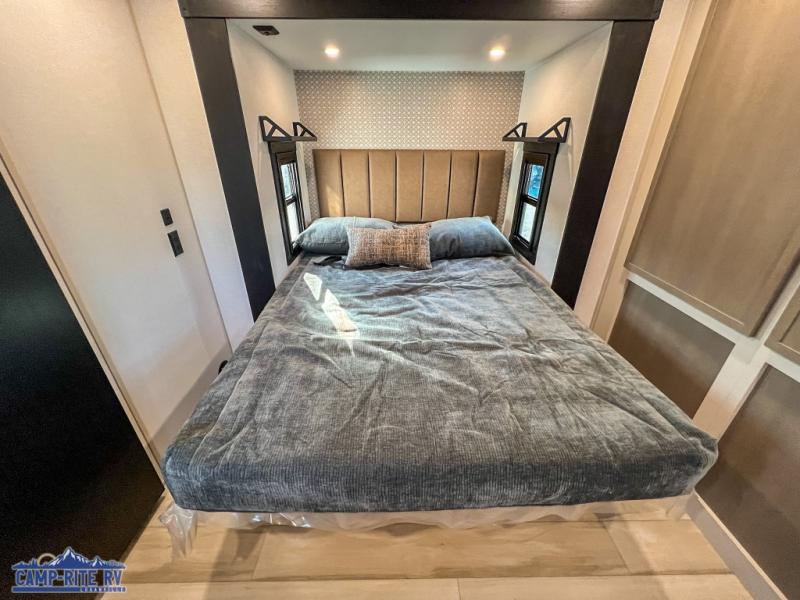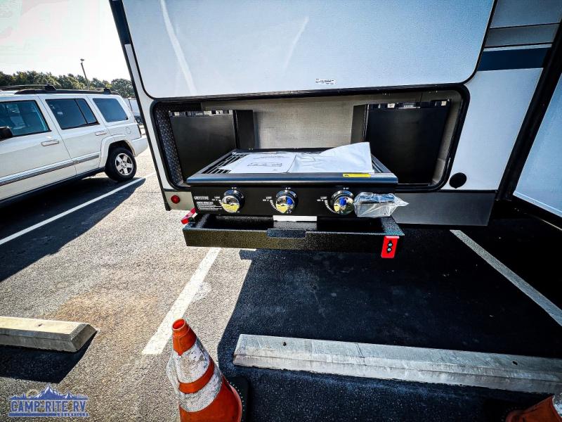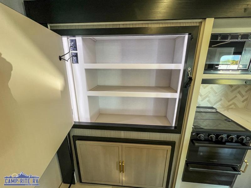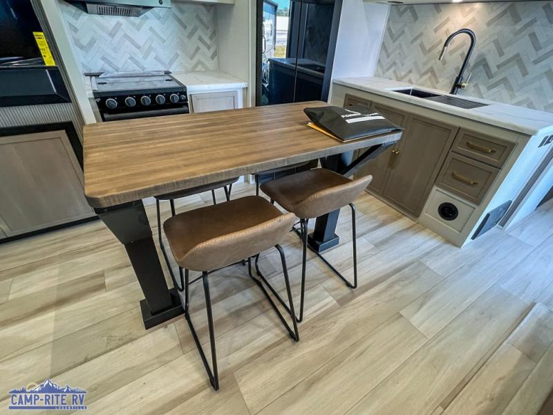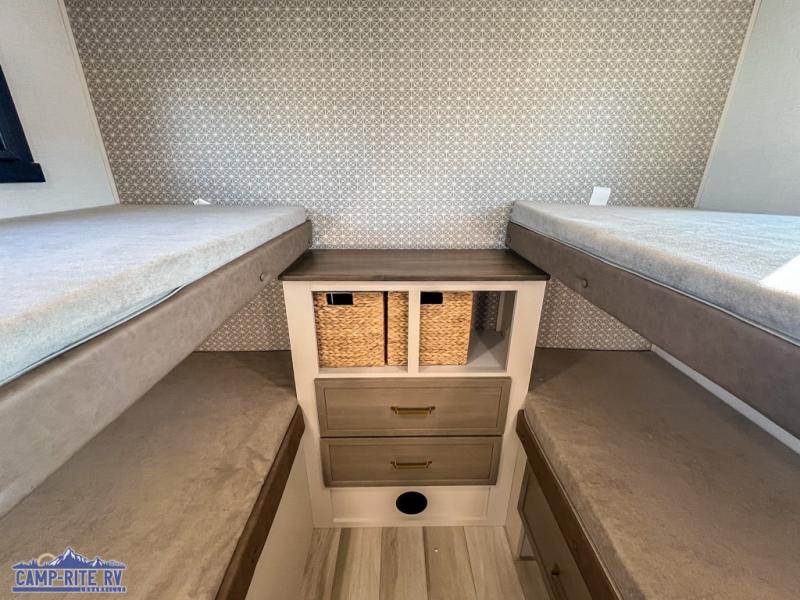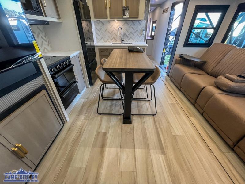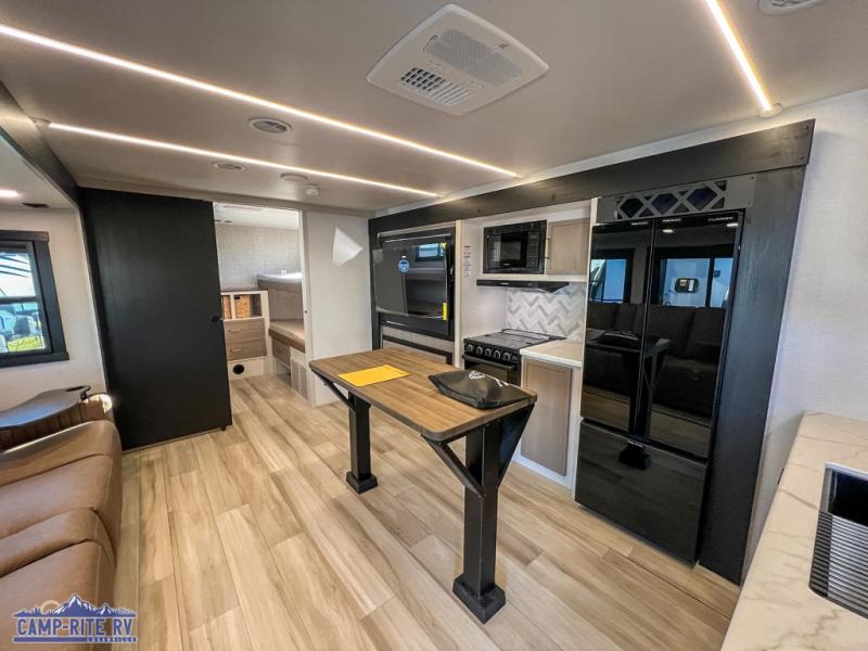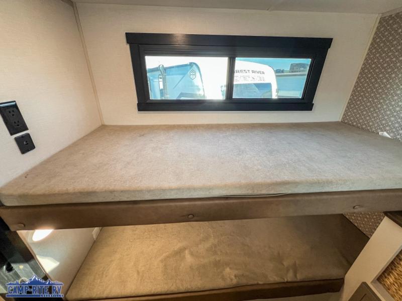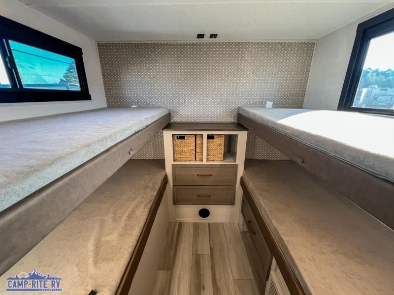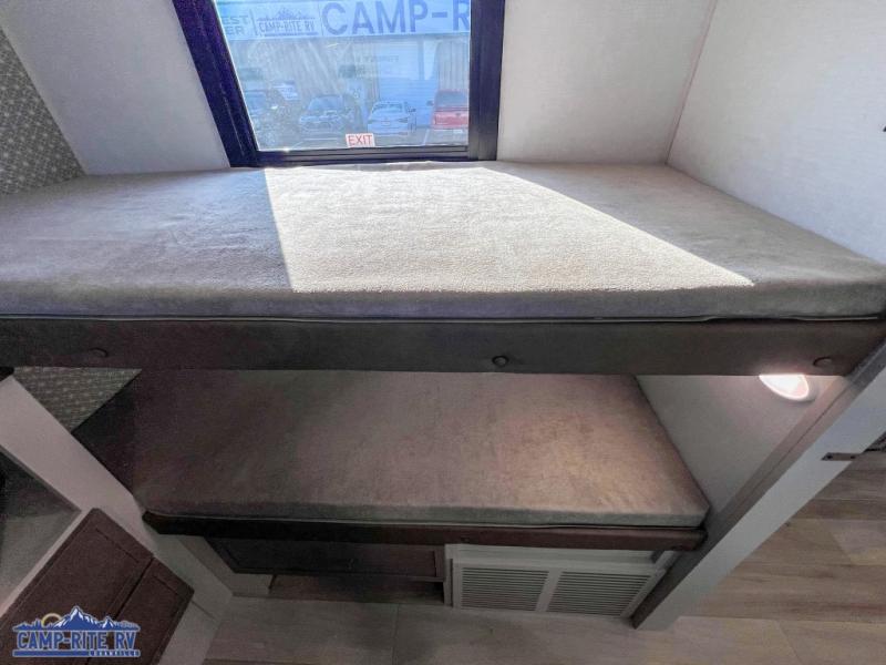 Your kids or friends are going to love camping in this travel trailer! It features a rear private bunkhouse with a bunk above a Versa queen convertible bed/sofa plus an additional bunk above an entertainment center with storage below. Just outside the bunkhouse is the kitchen with a 10 cu. ft. 12V black refrigerator, a microwave, a kitchen island, and a chef-sized walk-in pantry big enough to store everyone's favorite snacks. The booth dinette and the theatre seating are right next to panoramic windows so you can enjoy looking out at your beautiful scenery. You will also love taking a hot, steamy shower in the 30" x 36" shower with skylights and get a good night's rest on the queen bed with Versa Tilt in the front private bedroom!